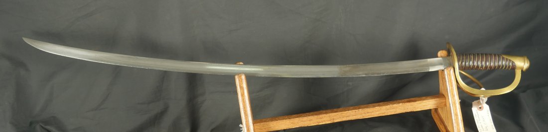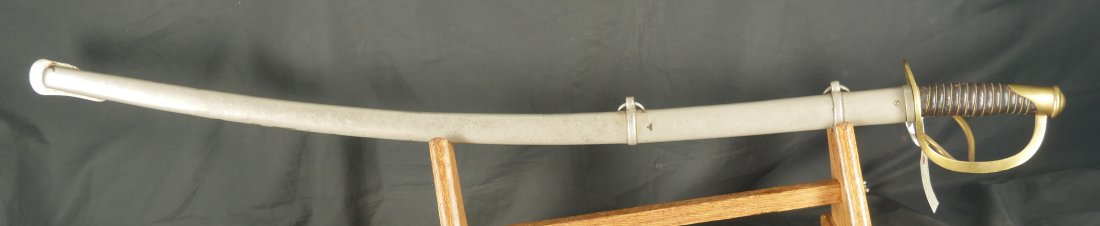 079-1225-9370, US M-1860 Cavalry Sword and Scabbard, by Roby, dated 1865. Excellent blade with original luster and vivid cross brushing at the Ricasso. The scabbard shows about 80% toned nickel on exterior with light spots of staining. The sword is in excellent overall condition with 95% leather wrap and 100% wire wrap. The scabbard fits tight and overall looks like the sword was never issued. Excellent overall.