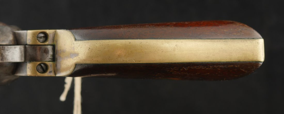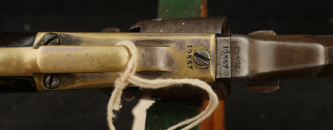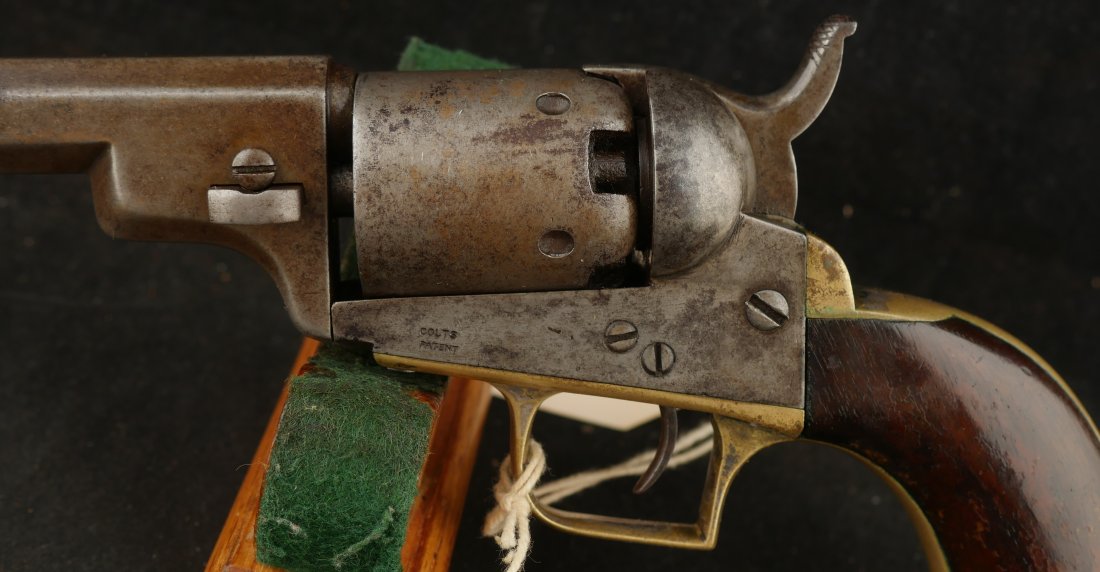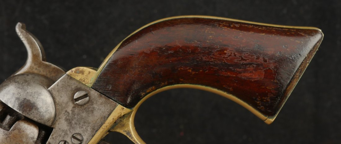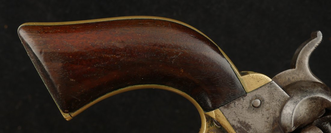 079-1025-9224, Colt Baby Dragoon .31 cal, 5 shot. It has a 4 inch barrel Clear markings on the frame and barrel. The gun is overall smooth brown patina with only traces of scene remaining. A few tiny patches of fine pinpricks scattered about the gun. The grips are correct with about 40% original varnish on the grip. Traces of silver on the brass. The #10xxx are matching on the bottom of the gun, the cylinder and the wedge. The bore has crisp edged rifling with fine surface spotting the length of the bore. Very good overall. Antique.