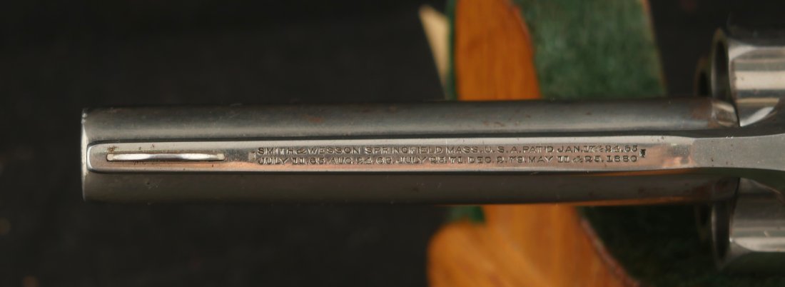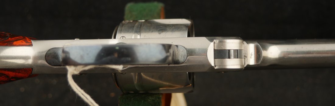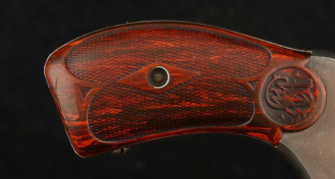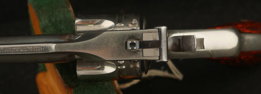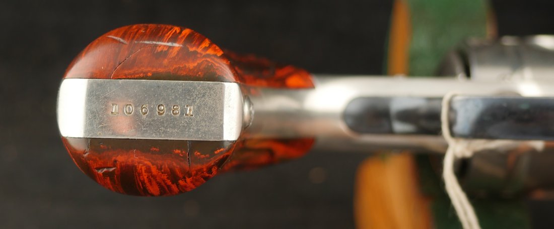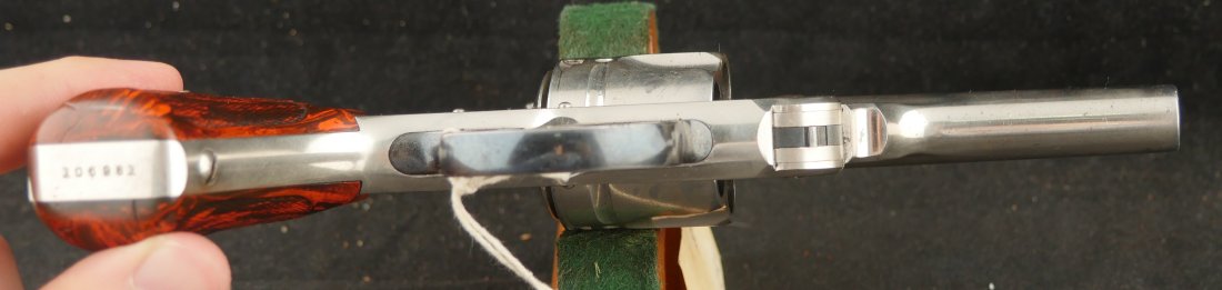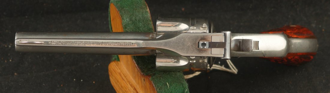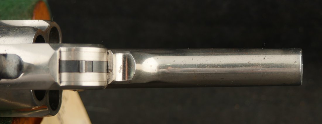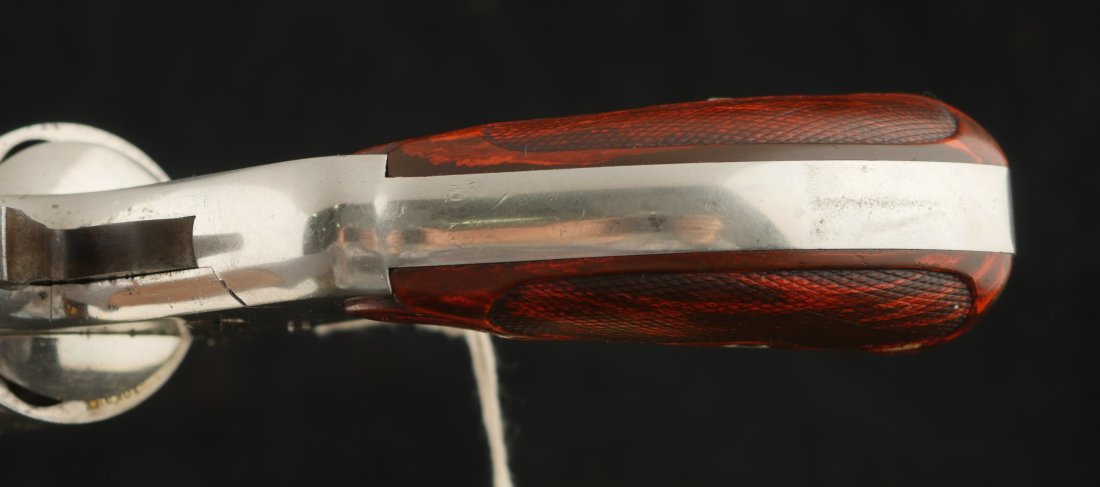 GR-0426-6907, Early Smith and Wesson DA Safety Hammerless in .38 CF. 5 shot. Serial number 106,xxx matches on the frame, barrel cylinder and latch. The gun retains 95% original bright nickel. 95% rainbow hughes on the trigger and hammer. 905 nitre blue on the trigger-guard. Special order and hard to come by Orange gutta pecha grips. The bore is bright, shiny, crisply rifled with a few fine scattered spots. Fine condition bore. Crisp tight mechanics in both DA and SA. The spider ejector is functional, excellent plus overall.