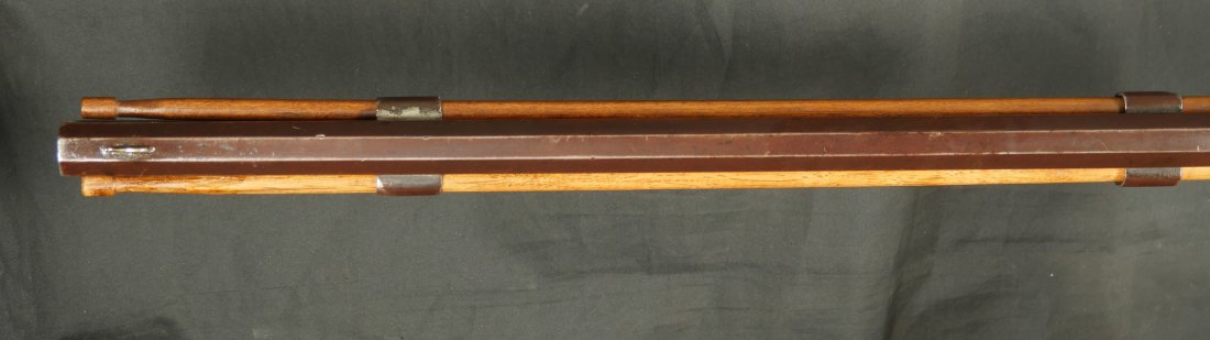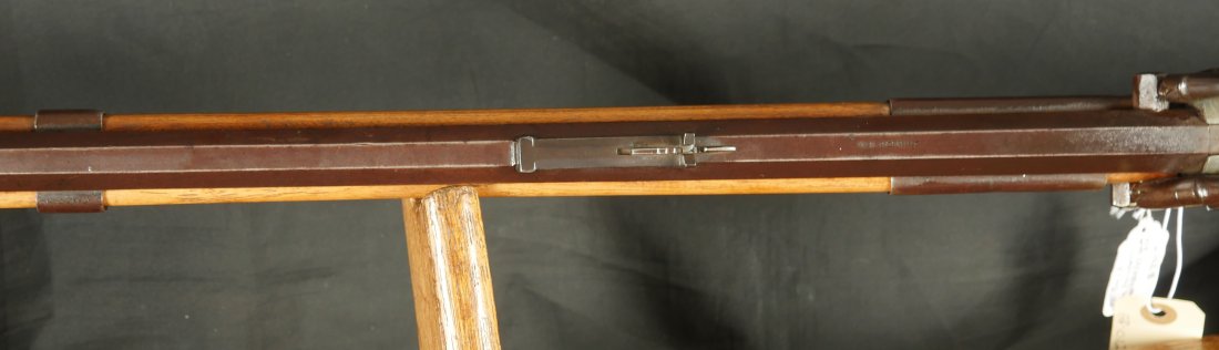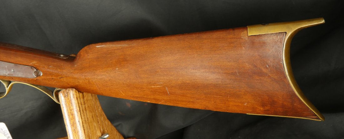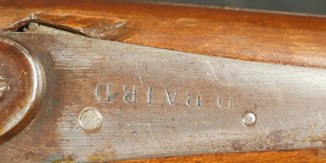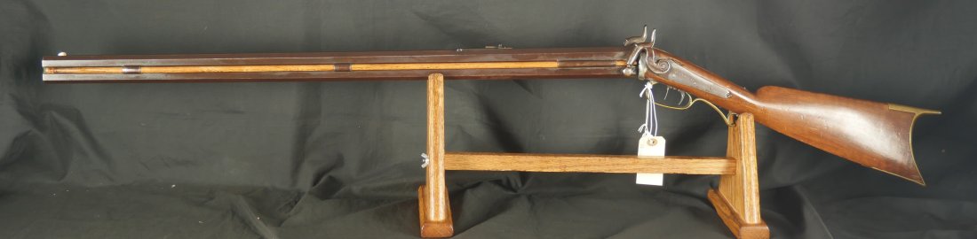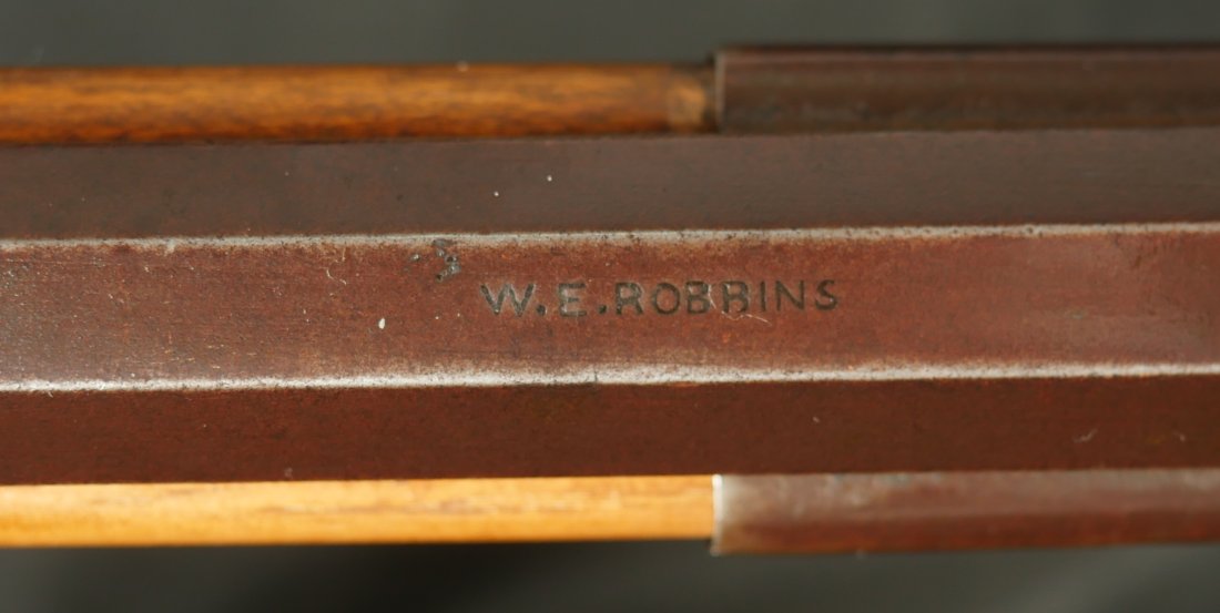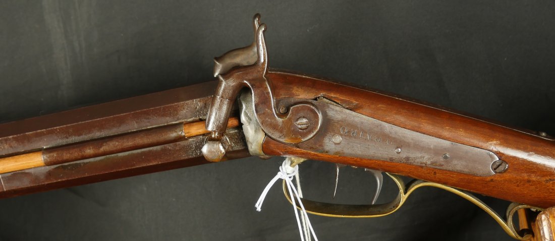 GR-0126-6805, Octagon Barrel Percussion Double Rifle with Set Triggers. The top barrel is a rifled barrel and gauges to .36. The bottom barrel is a smooth bore and measures to 28 gauge or about .50. Barrels are 31 inches long. It has double set triggers that work on both the rifled and the smooth bore. I have never seen a double set trigger on a smooth bore barreled gun. The barrel is smooth brown and marked, W. E. Robbins, the locks are marked: D. Baird. There was a William E Robbins in Cherry Flats PA making guns from 1847 to 1861. I would guess D Baird is the lock maker and Robbins made the gun. There are patches of bump and dings to the metal and some light pits near the bolster. The stock show moderate bumps, dings and minor chips, the stock has also been coated in some oil at some point to help preserve the wood. The rifled bore is bright, shiny and crisply rifled with some fine spots. The shotgun bore is bright and shiny with scattered very fine spots also. The mechanics are functional but unique. When working the shotgun side, before cocking you have to pull back the set trigger, only then will the hammer hold cock and the trigger will allow the hammer to fall. The Rifled side can work the same as well as pulling the trigger back and then using the set trigger before the trigger. I am not sure what is going on inside the gun but I have never seen a double barrel rifle like this with set triggers. Very neat and unique. It has a brass trigger-guard and brass butt-plate with iron piping. The cap of the buttstock is pewter. It has 2 replaced wooden ramrods. Very interesting gun.