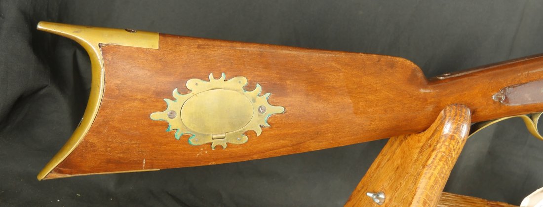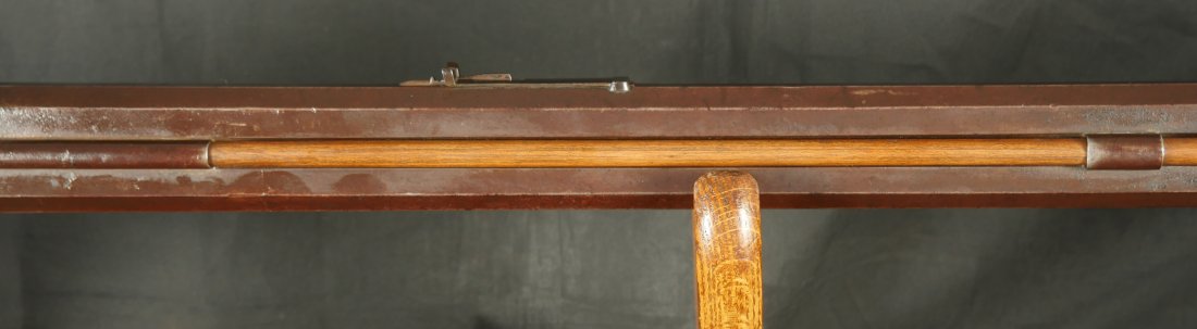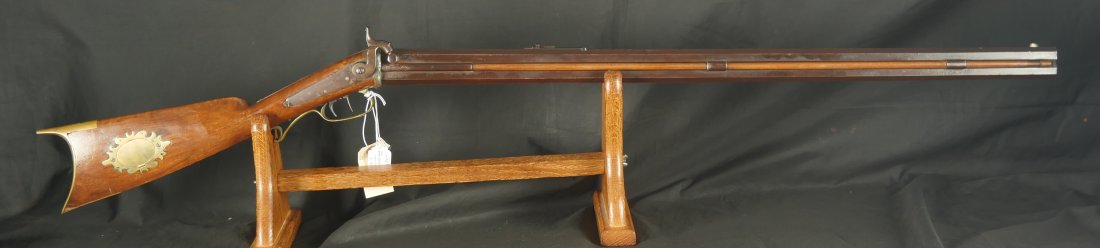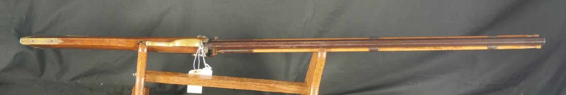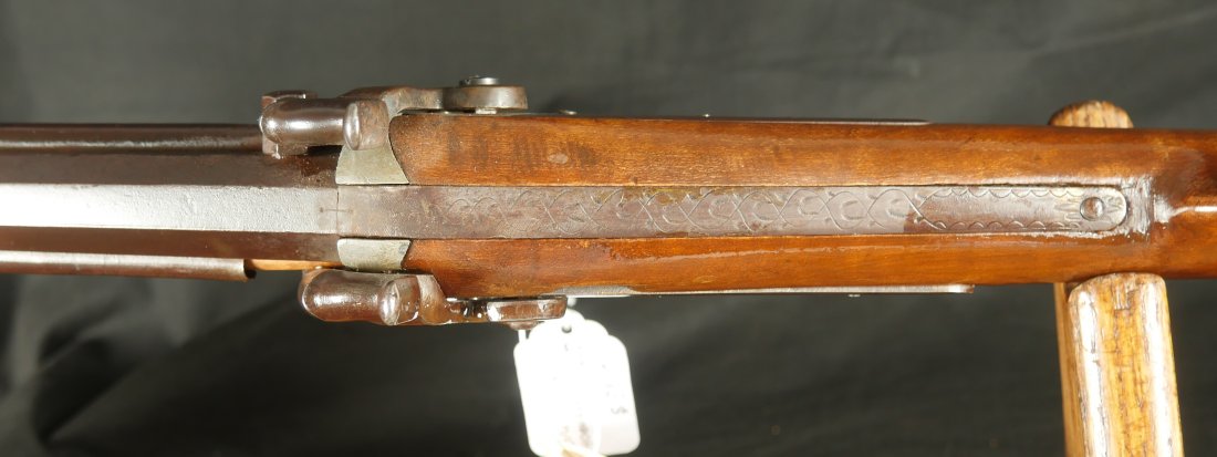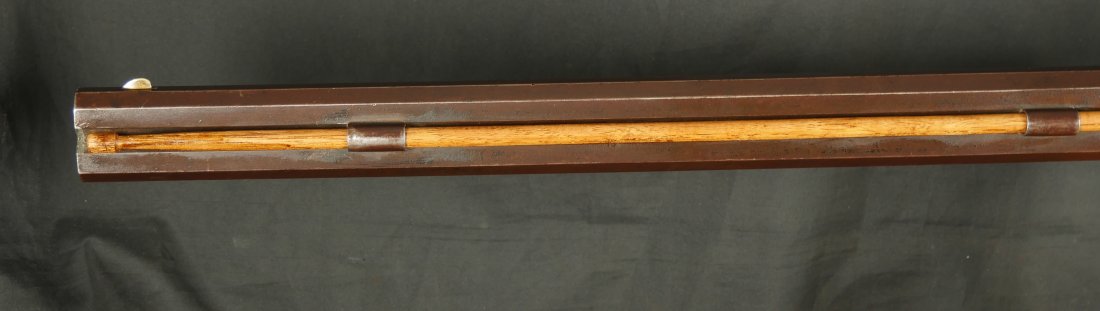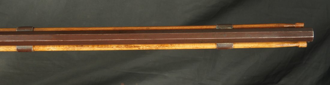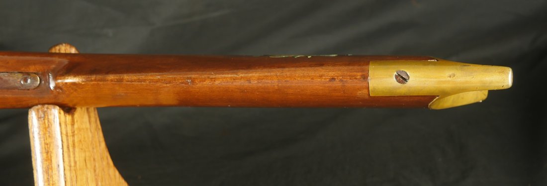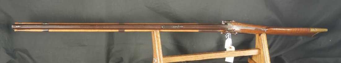 GR-0126-6805, Octagon Barrel Percussion Double Rifle with Set Triggers. The top barrel is a rifled barrel and gauges to .36. The bottom barrel is a smooth bore and measures to 28 gauge or about .50. Barrels are 31 inches long. It has double set triggers that work on both the rifled and the smooth bore. I have never seen a double set trigger on a smooth bore barreled gun. The barrel is smooth brown and marked, W. E. Robbins, the locks are marked: D. Baird. There was a William E Robbins in Cherry Flats PA making guns from 1847 to 1861. I would guess D Baird is the lock maker and Robbins made the gun. There are patches of bump and dings to the metal and some light pits near the bolster. The stock show moderate bumps, dings and minor chips, the stock has also been coated in some oil at some point to help preserve the wood. The rifled bore is bright, shiny and crisply rifled with some fine spots. The shotgun bore is bright and shiny with scattered very fine spots also. The mechanics are functional but unique. When working the shotgun side, before cocking you have to pull back the set trigger, only then will the hammer hold cock and the trigger will allow the hammer to fall. The Rifled side can work the same as well as pulling the trigger back and then using the set trigger before the trigger. I am not sure what is going on inside the gun but I have never seen a double barrel rifle like this with set triggers. Very neat and unique. It has a brass trigger-guard and brass butt-plate with iron piping. The cap of the buttstock is pewter. It has 2 replaced wooden ramrods. Very interesting gun.