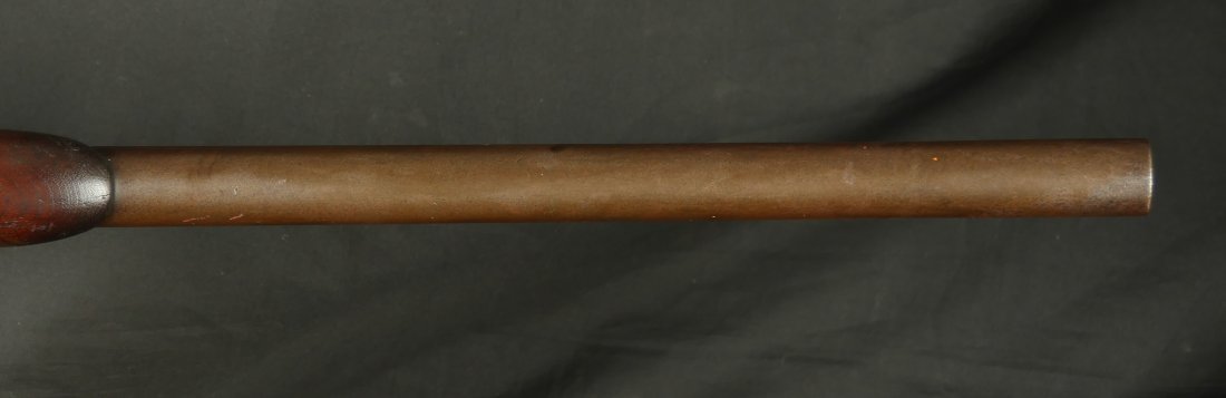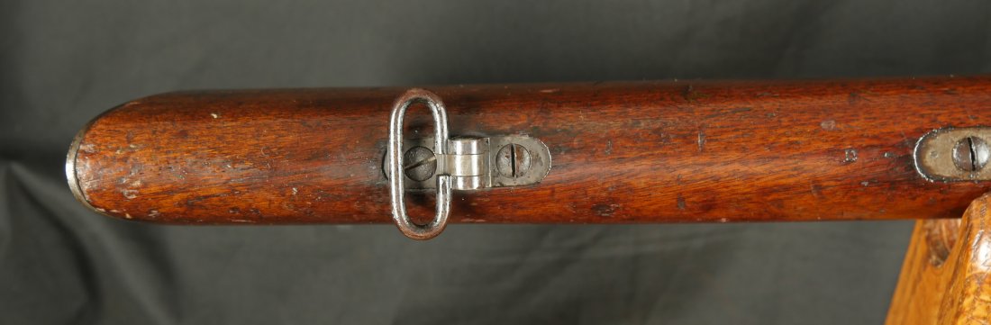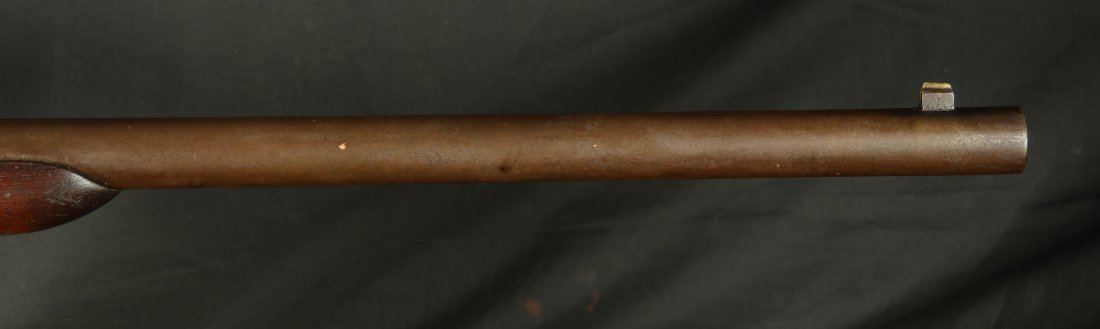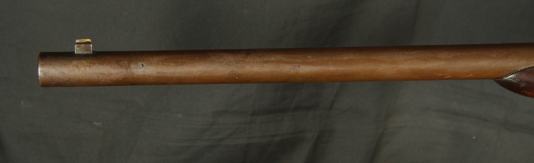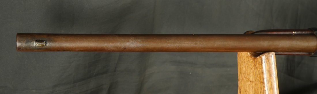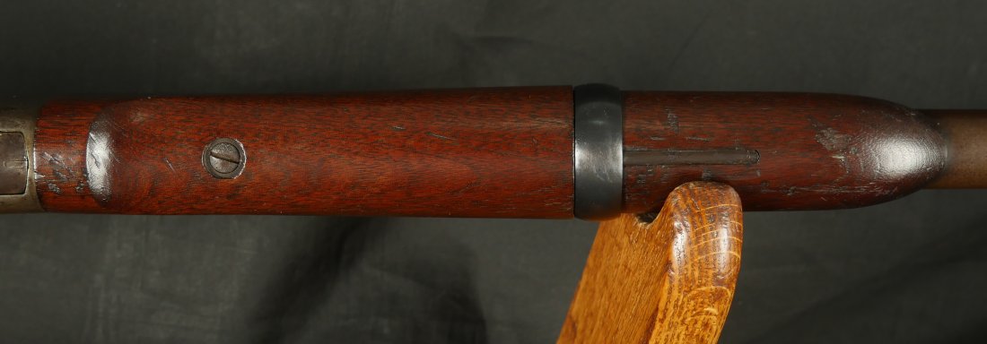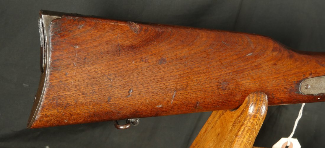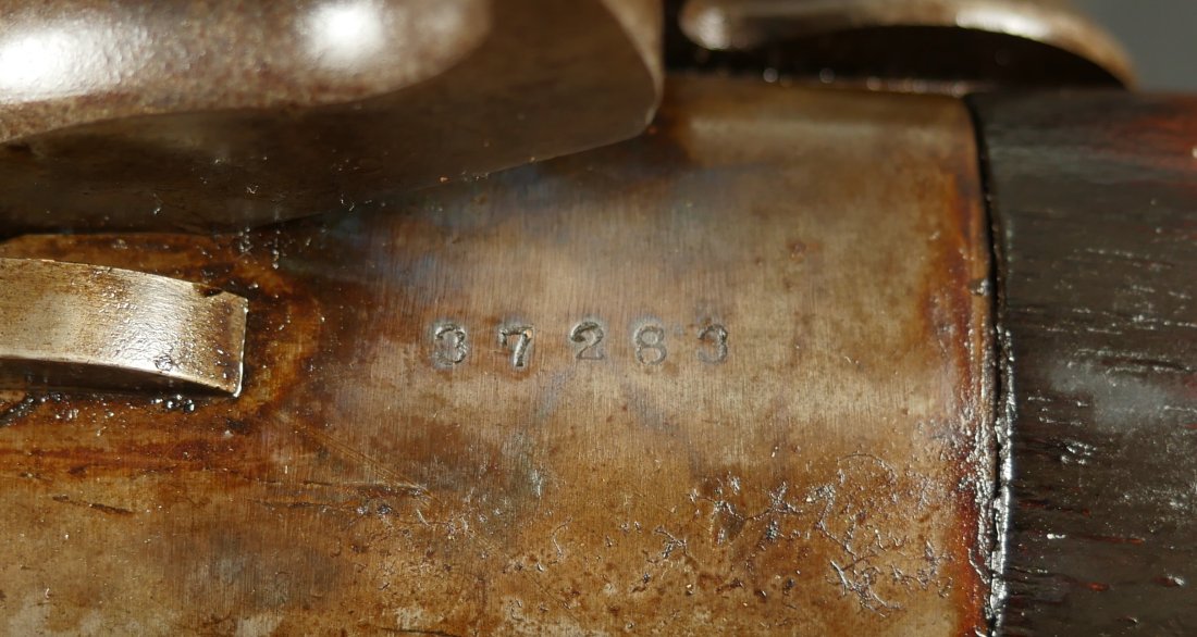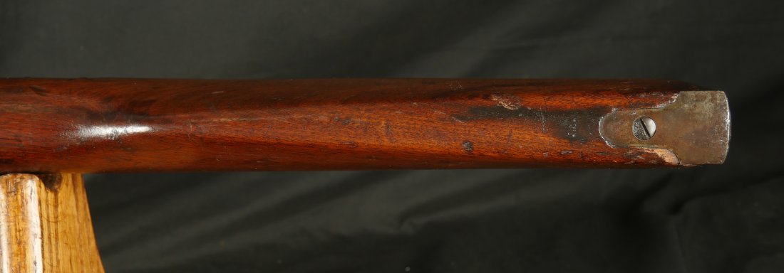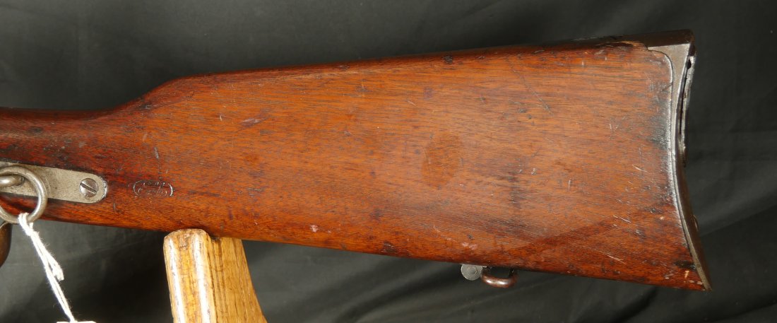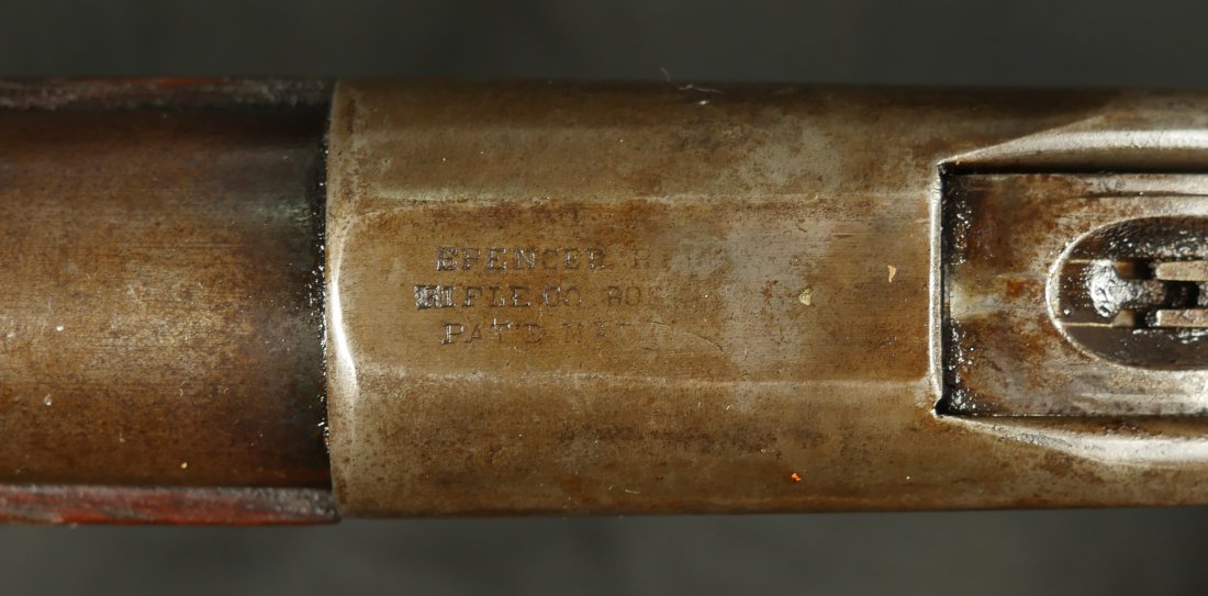 GR-0126-6807, Spencer Model 1860 Carbine with Indian War Alterations. 22 inch barrel. The upgrades for Indian war use, including the stabler cutoff, 3 groove rifled barrel, grooved thumb piece on the magazine tube and I believe the stock was upgraded too. There is a crisp and legible ESA cartouche on the left side of the stock. The gun is still rimfire so must be .50 RF (56-52 or 56-50 which are interchangeable). The barrel band has been replaced. The barrel is mostly grey / brown with traces of original blue and some light surface residue. The receiver has mostly silvered but there are traces of case color on the sides and a thumb sized patch of bright case color on the tops of the frame where the serial number is and under the hammer. When I work the lever and the block comes down, there is a lot of original case color on the block. The mechanics are functional. The bore is bright, bright, shiny and crisply rifled with some light surface residue near the muzzle. Fine condition bore, much better than average bore. The barrel address is slightly weak, which is common on post war altered guns, that were cleaned, reworked and upgraded for Indian war use.