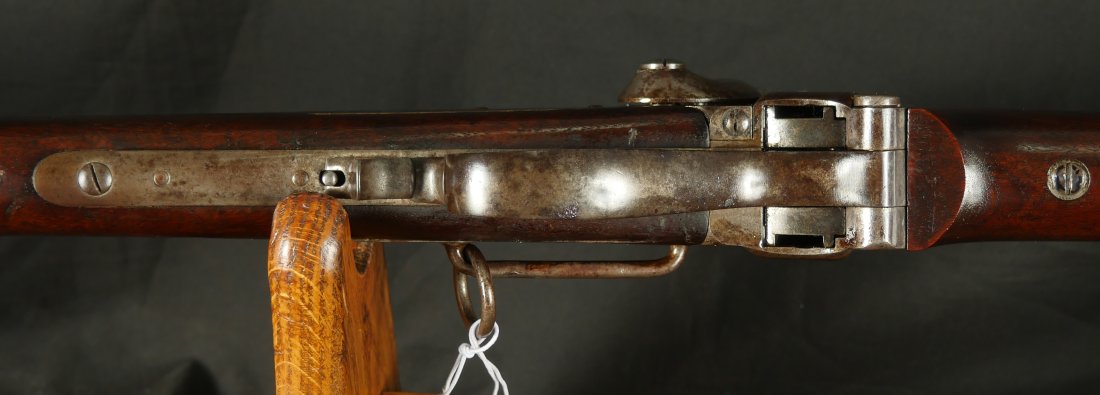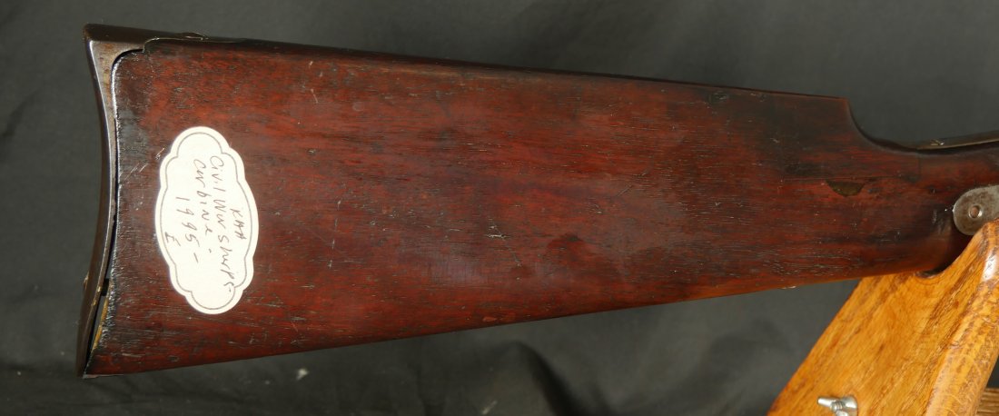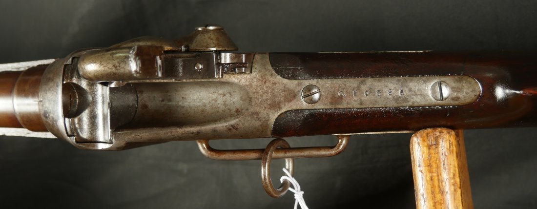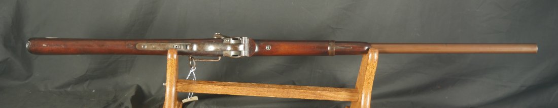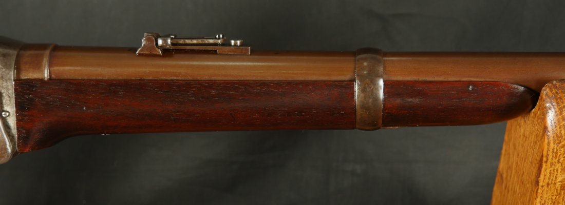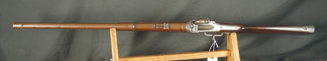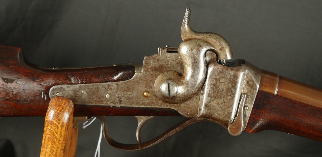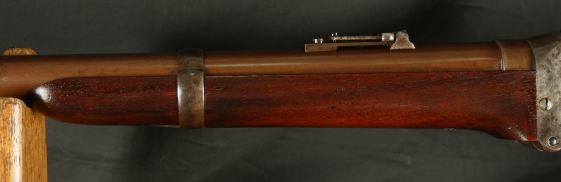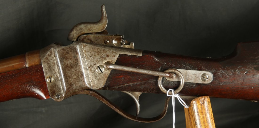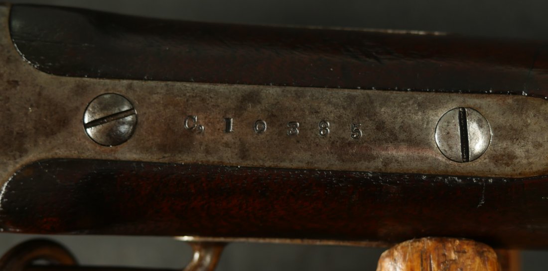 GR-0226-6742, Sharps Saddle Ring Percussion Carbine. Bore gauges to .50. The back end of the gun, frame, and stock have to be a new model 1863. The barrel measures 24 inches. So the barrel must be off of a rifle and has been cut down. It has 6 groove rifling. The frame is mottled gray with clear markings. The barrel has had some color touchup that is smooth and brown overall. There are faint but visible cartouches on the stock under the saddle ring. The stock shows some scabbard wear on the left side of the stock. The overall stock shows light use marks. Serial number C10,xxx. the bore is bright shiny, and crisply rifled. Fine + bore. Crisp, functional mechanics.