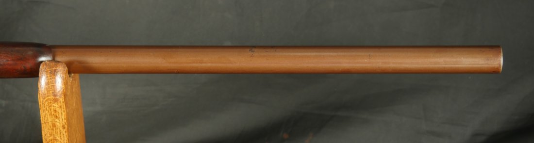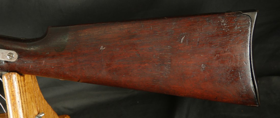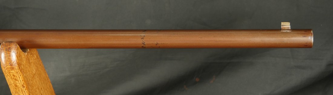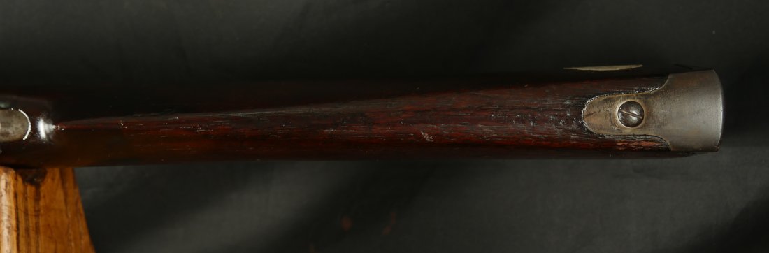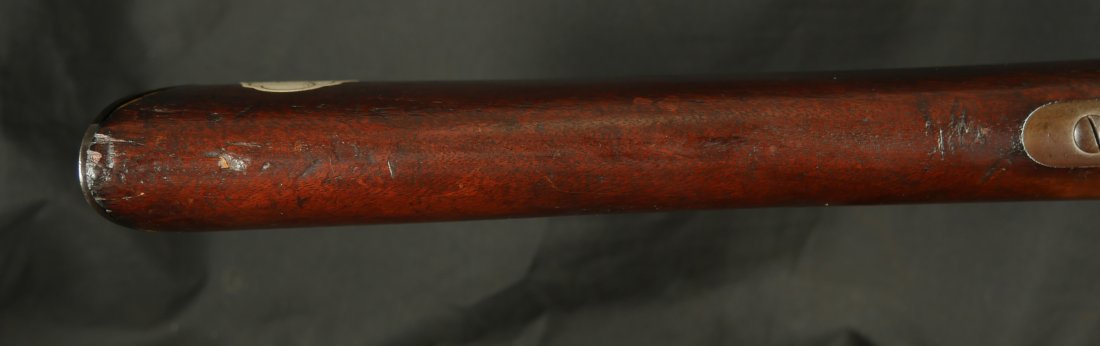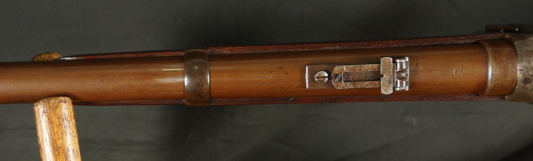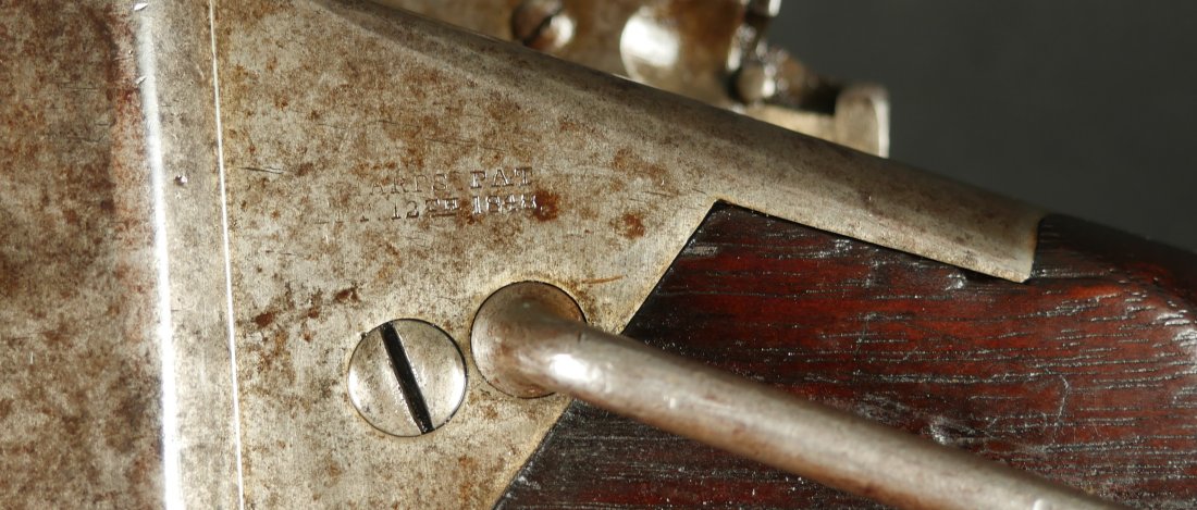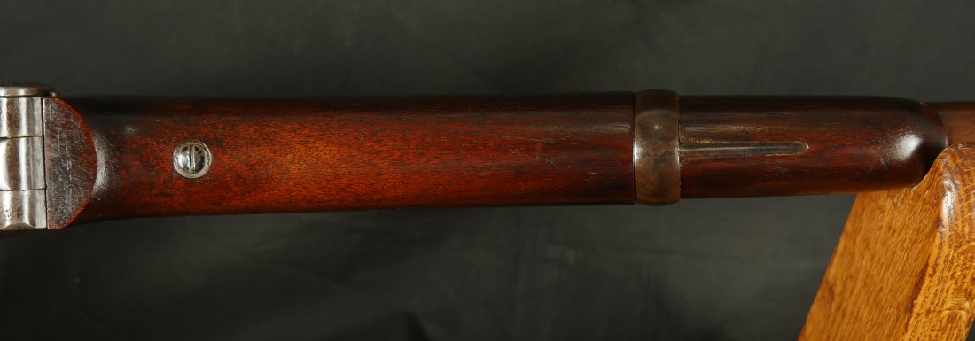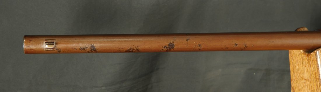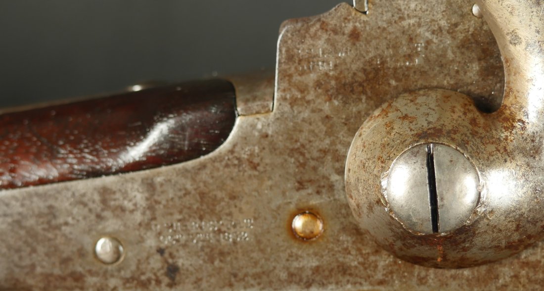 GR-0226-6742, Sharps Saddle Ring Percussion Carbine. Bore gauges to .50. The back end of the gun, frame, and stock have to be a new model 1863. The barrel measures 24 inches. So the barrel must be off of a rifle and has been cut down. It has 6 groove rifling. The frame is mottled gray with clear markings. The barrel has had some color touchup that is smooth and brown overall. There are faint but visible cartouches on the stock under the saddle ring. The stock shows some scabbard wear on the left side of the stock. The overall stock shows light use marks. Serial number C10,xxx. the bore is bright shiny, and crisply rifled. Fine + bore. Crisp, functional mechanics.