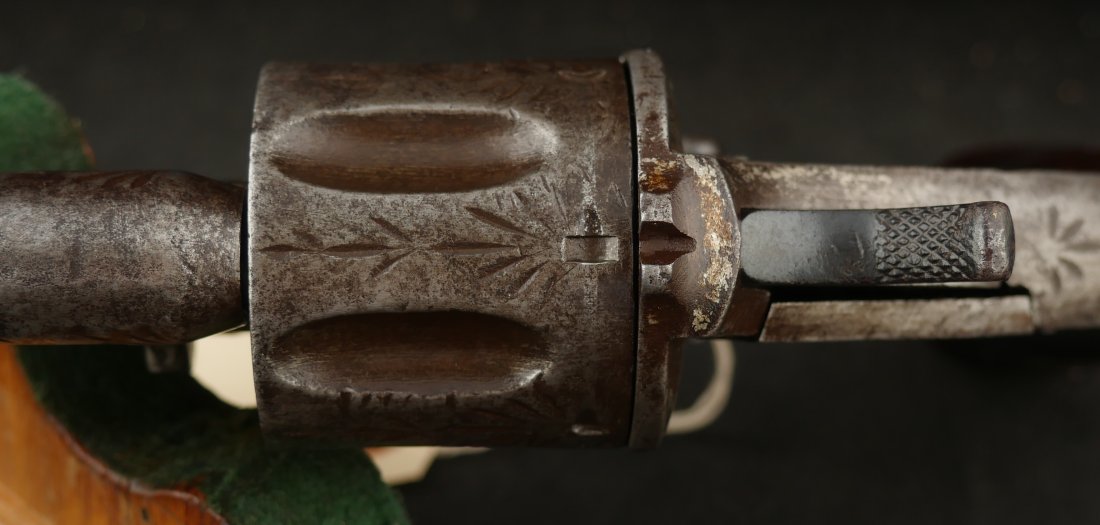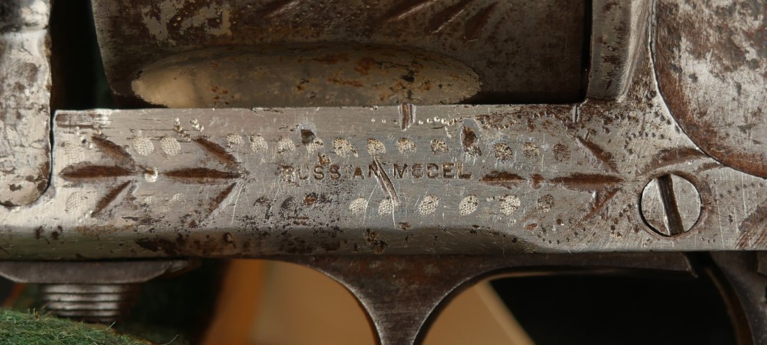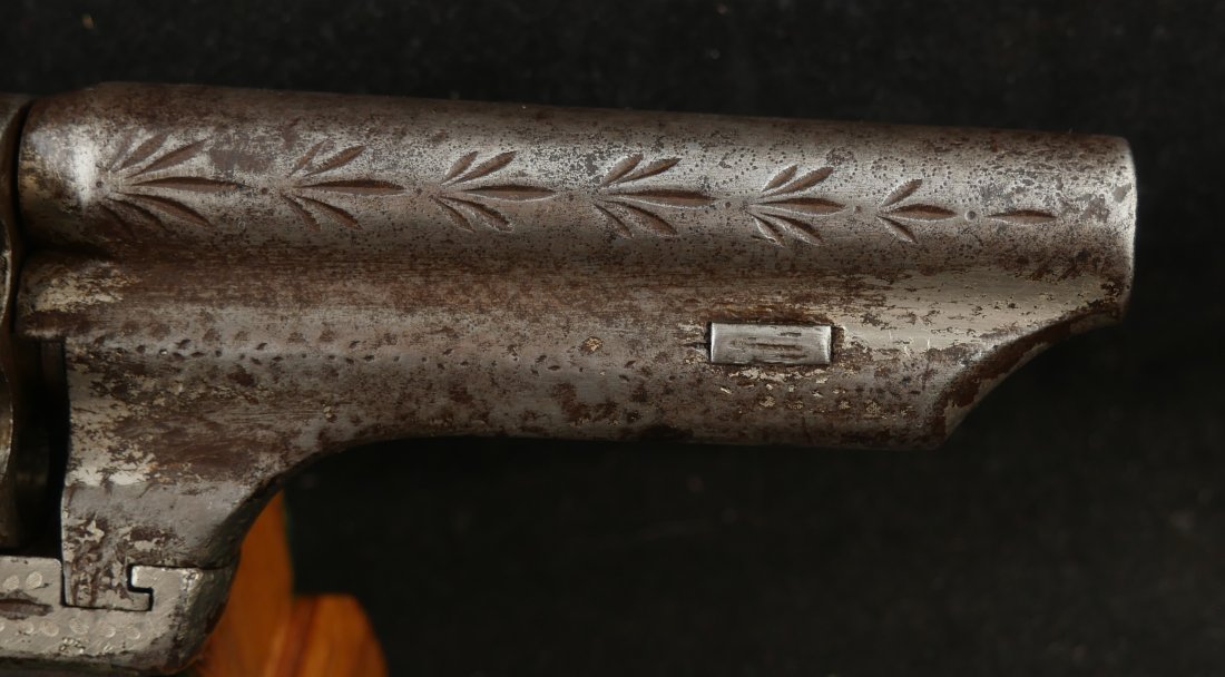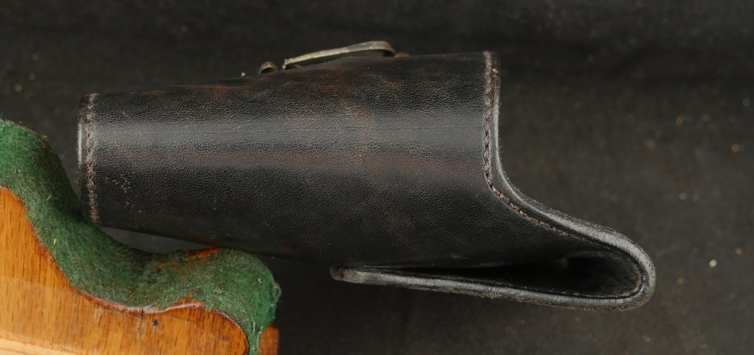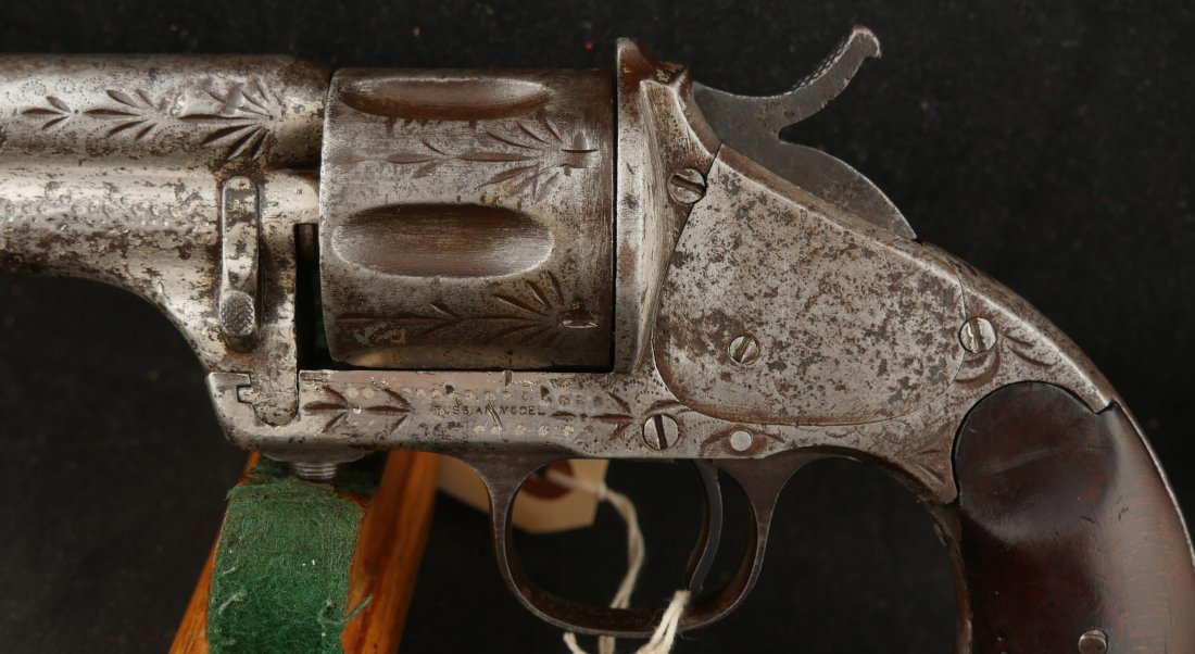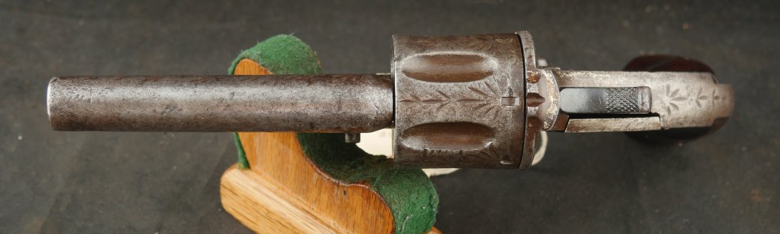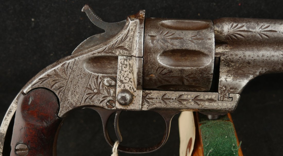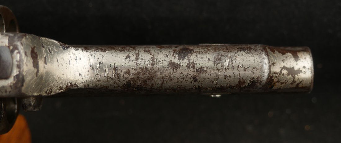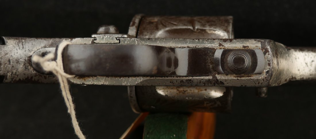 GR-0226-6820, Merwin and Hulbert SA Large Frame Russian Model in .44 Russian model, factory engraved with barrel shortened to 4 inches. The right wood grip has a large chip, the side plate on the left is a replacement. The action is functional, with the ¼ cock position to allow the cylinder to spin and tight lockup in the full cock position. The action even has a little suction. The action is surprisingly good for the overall condition of the gun. There is scattered salt and pepper staining on the metal surfaces overall. The bore is bright, shiny, rifling is crisp with scattered fine spots the length of the bore. Very good bore. The pistol does not have a front sight. It comes in a leather holster with a Mexican Eagle holding a snake. Stitching is small, like on early western holsters but it is difficult to say how old the holster is. It does look very Mexican to me though. The holster may be worth as much as the gun. Neat old rig.