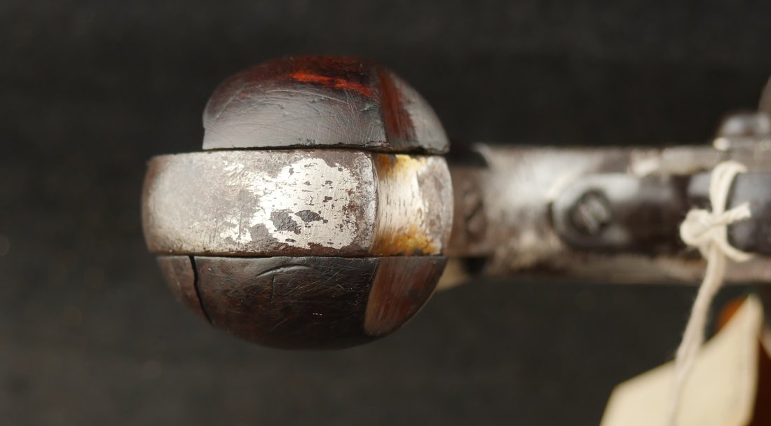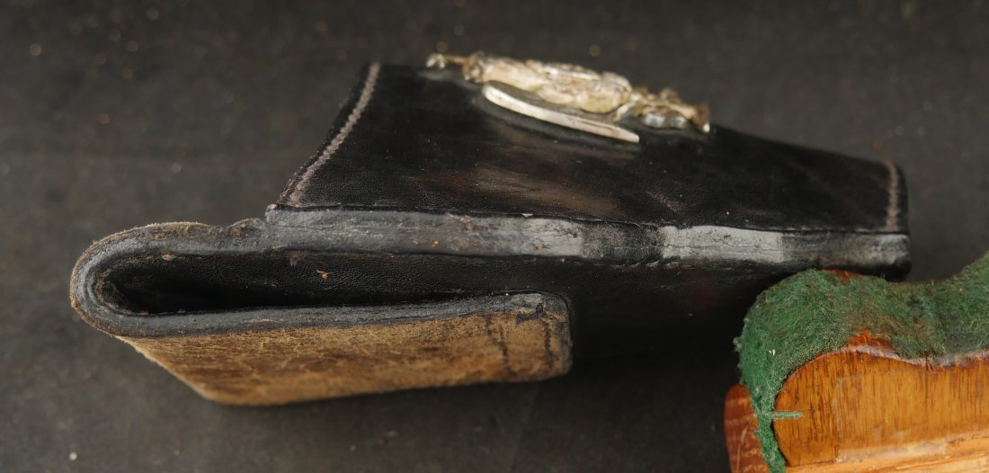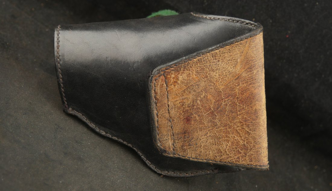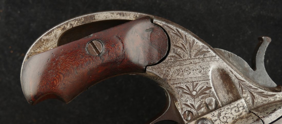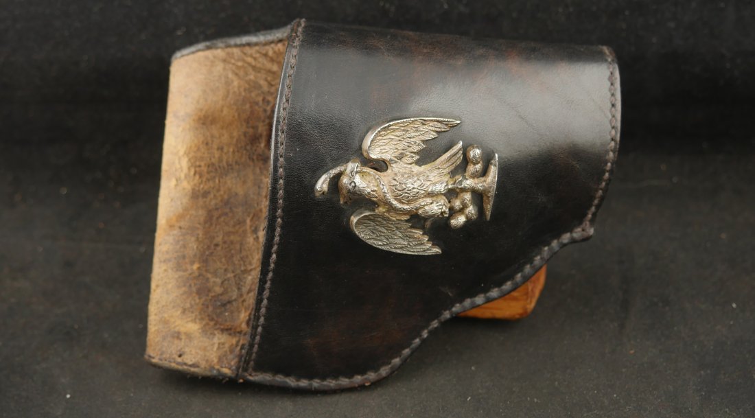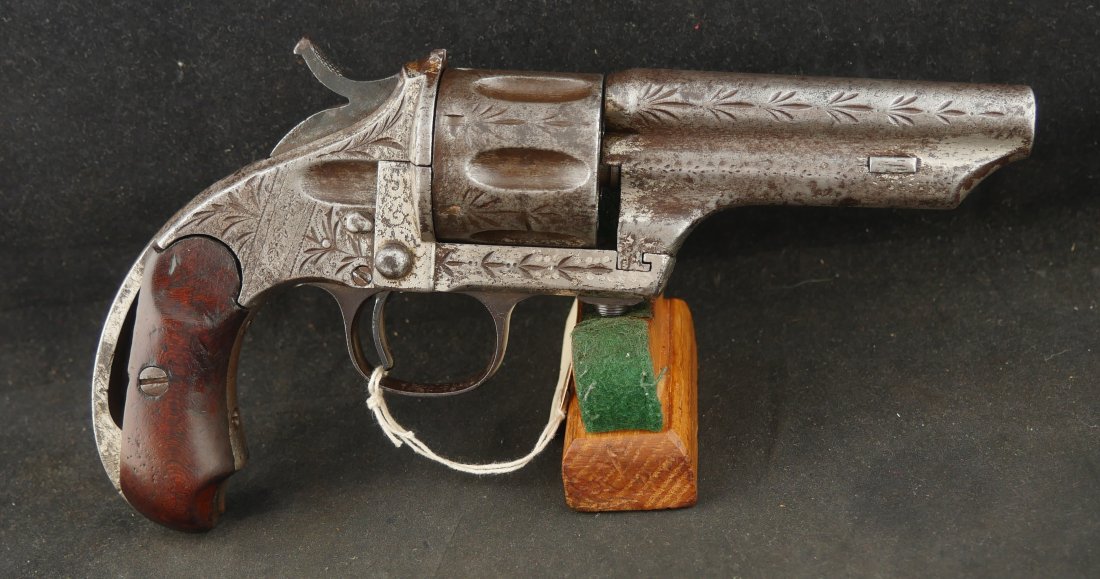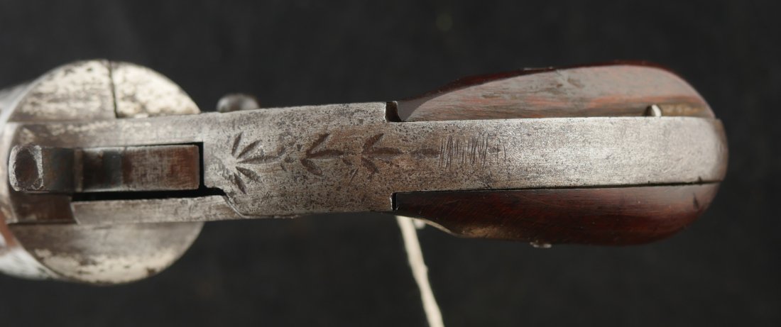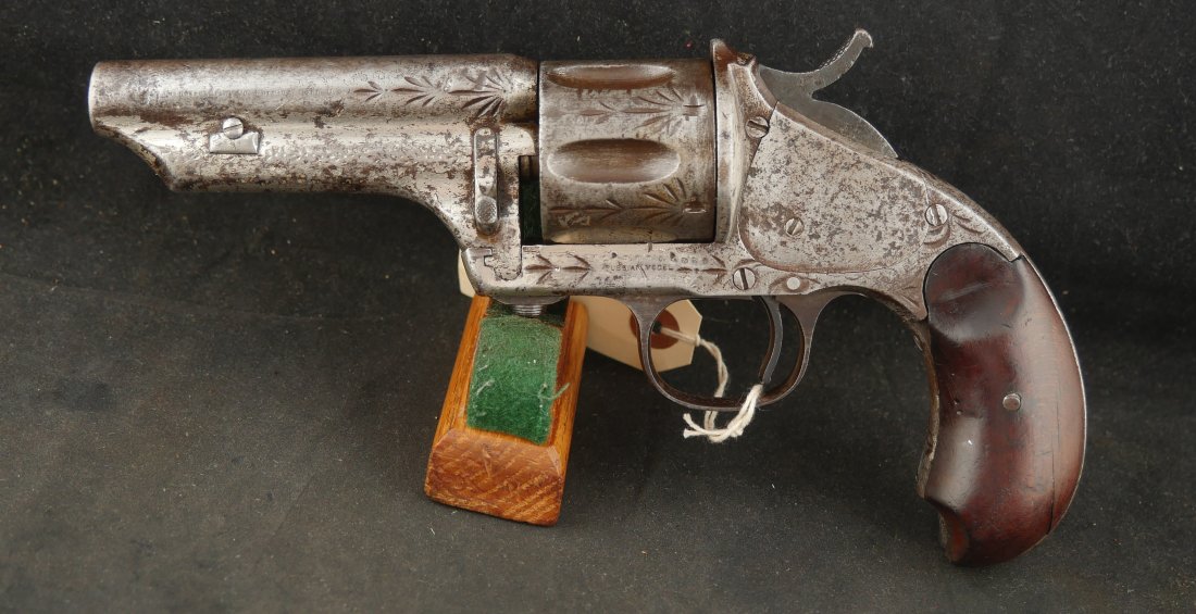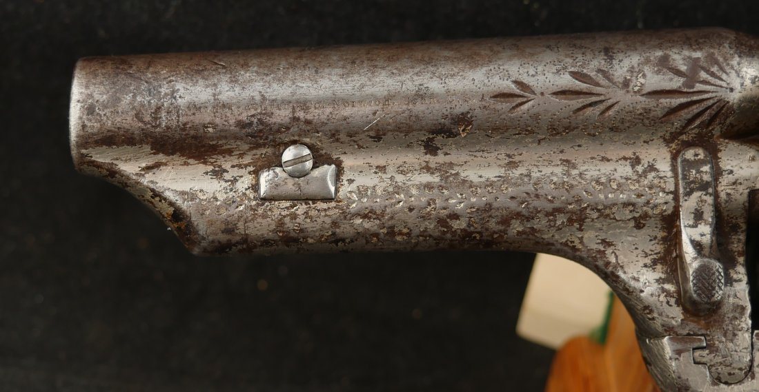 GR-0226-6820, Merwin and Hulbert SA Large Frame Russian Model in .44 Russian model, factory engraved with barrel shortened to 4 inches. The right wood grip has a large chip, the side plate on the left is a replacement. The action is functional, with the ¼ cock position to allow the cylinder to spin and tight lockup in the full cock position. The action even has a little suction. The action is surprisingly good for the overall condition of the gun. There is scattered salt and pepper staining on the metal surfaces overall. The bore is bright, shiny, rifling is crisp with scattered fine spots the length of the bore. Very good bore. The pistol does not have a front sight. It comes in a leather holster with a Mexican Eagle holding a snake. Stitching is small, like on early western holsters but it is difficult to say how old the holster is. It does look very Mexican to me though. The holster may be worth as much as the gun. Neat old rig.