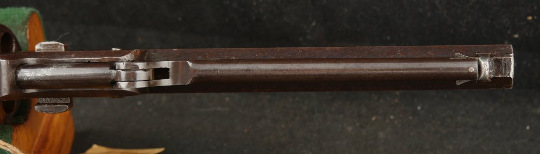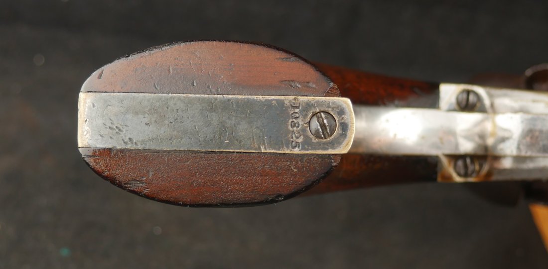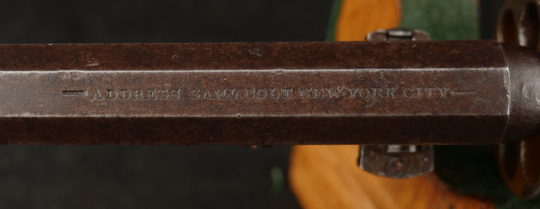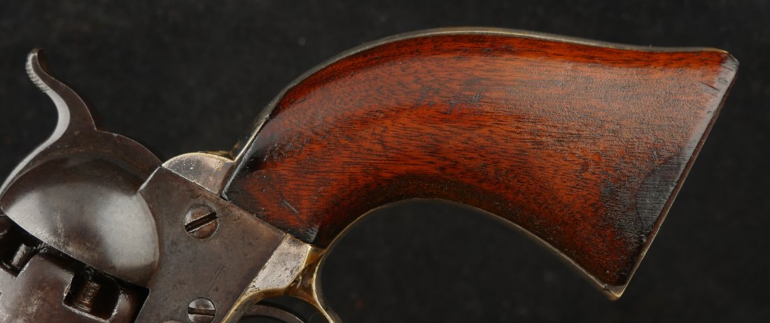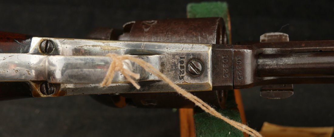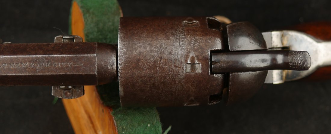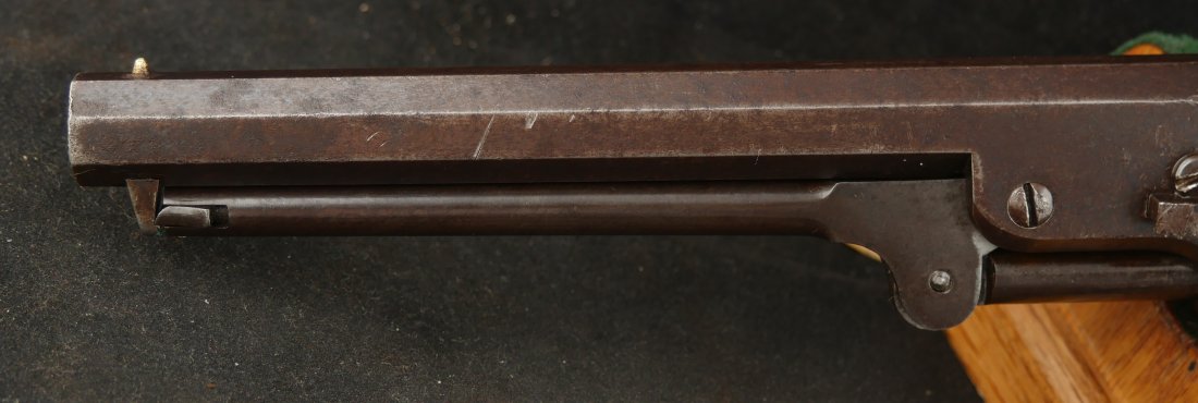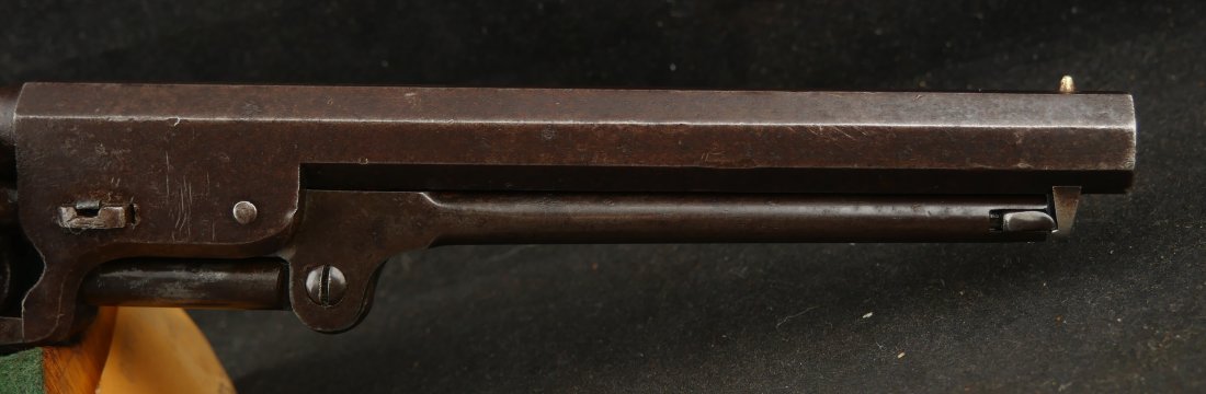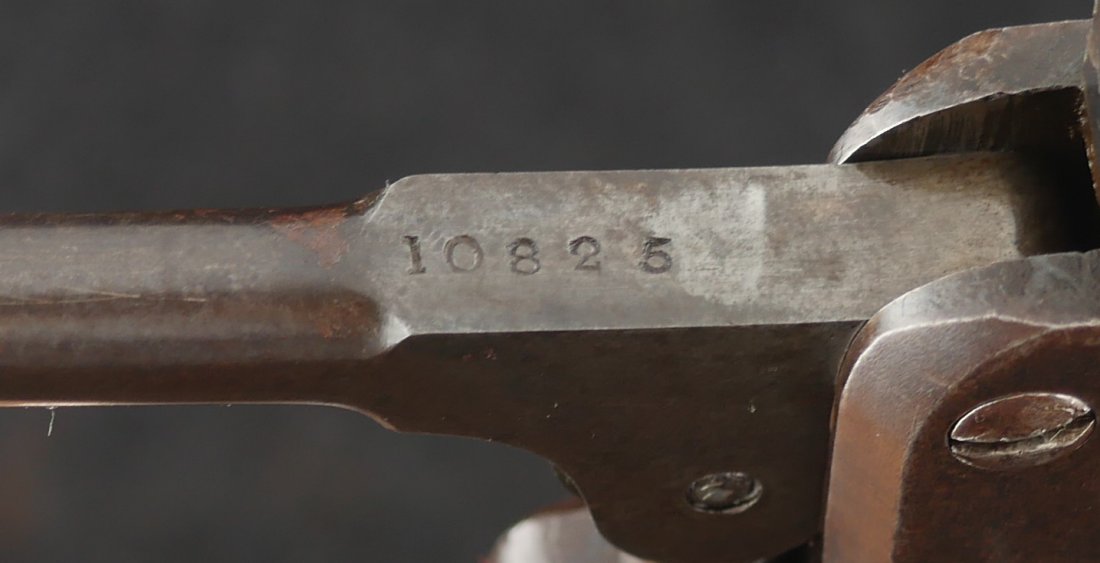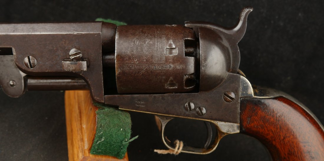 GR-0226-6823, Early Colt Model 1851 Navy. Serial number 10,xxx matches on the barrel, lever, guard, strap, cylinder, wedge and cylinder pin. Made in 1852, 2nd year production. 7 1/2 inch barrel, 6 shot, .36 cal percussion. New York barrel address. The grips retain about 75% original varnish with about 80% tarnished silver on the brass guard and strap. There are strong flashes of original blue on the barrel that is mixing to a chocolate patina. There are flashes of bright case colors on the frame and lever. The cylinder scene is strong with about 90% cylinder scene. The mechanics are functional. If I pull the hammer back with a crisp pull the cylinder lines up every time, if i pull the hammer back slowly, it sometimes over-rotates. The bore is bright, rifling is strong with scattered fine spots and light residue the length of the bore. Very good bore. Very good overall. There is a high probability it was a gun that went west to the gold rush. Handsome gun.