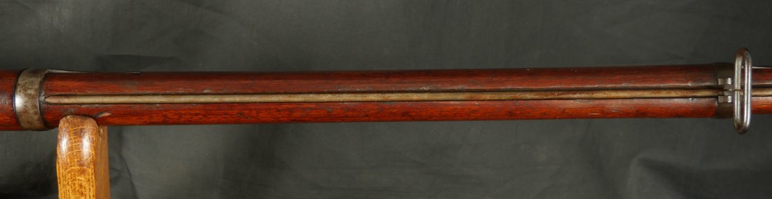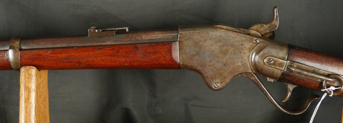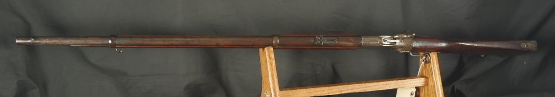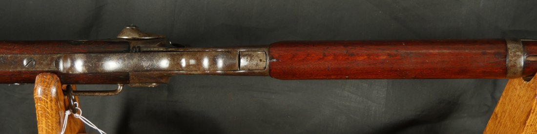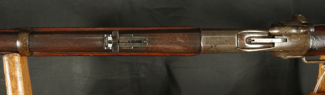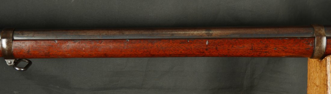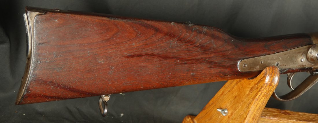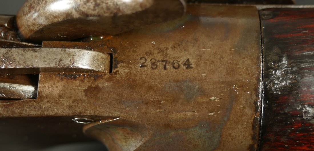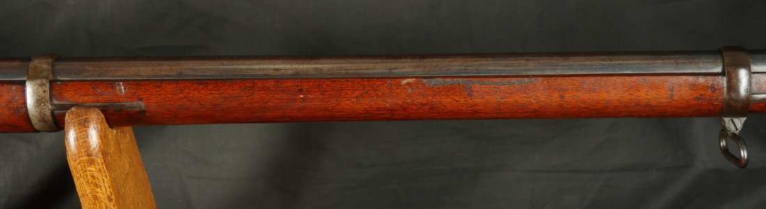 GR-0226-6826, Spencer Model 1865 Military Rifle. .50 RF. These conversions were done by the Burnside Rifle Company. The US government ordered these to be done after the Civil War. Serial number 23,XXX. 32 ½ inch barrel. The rifle has 2 bands with a ramrod. This rifle was altered from a Carbine to a military rifle in .50 cal with stabler cutoff and done in 1871. The rifle has an 1860 style magazine tube with about 40% rainbow hues on the frame with the rest of the case color turning to mottled brown from rainbow hues. The barrel has strong flashes of blue on the barrel with about 20% deep blue mixing to brown. Cartouche on the stock is visible but shows some wear. There is scratch through the cartouche. The patent address is marked 1865 with Burnside marking. The stocks show light bumps, dings and light scratches. Fine wood and fine metal. Fine wood to metal fit. The bore is bright, shiny, crisply rifled with a few tiny scattered patches of residue. Fine condition bore, may clean to excellent. The mechanics are crisp and tight. Fine overall condition.