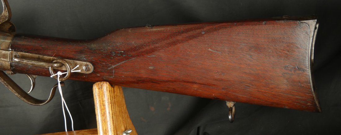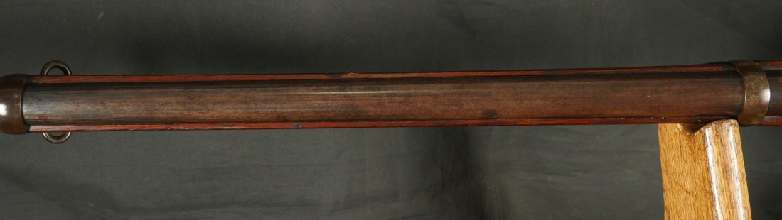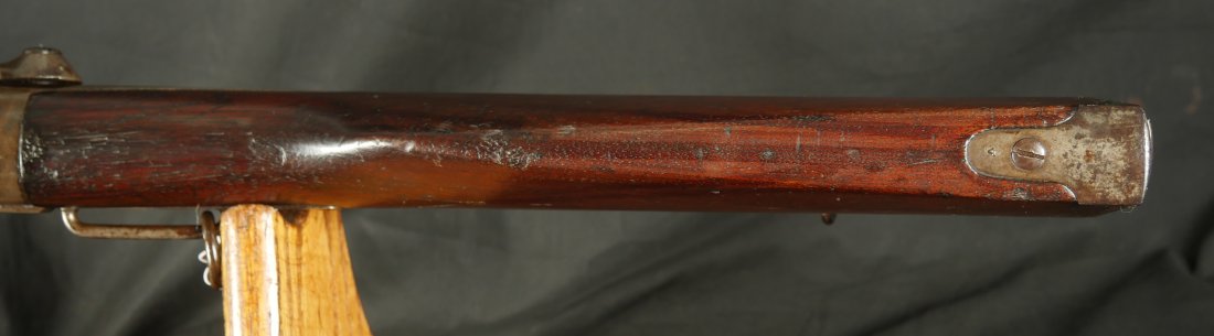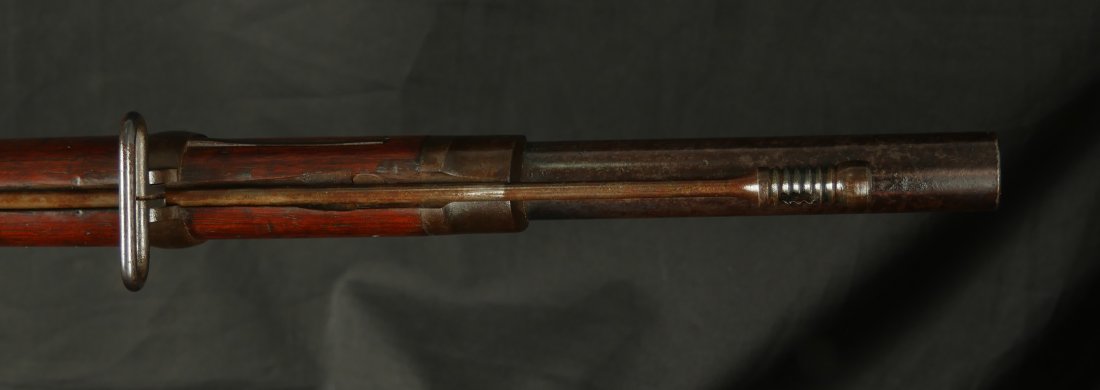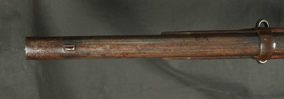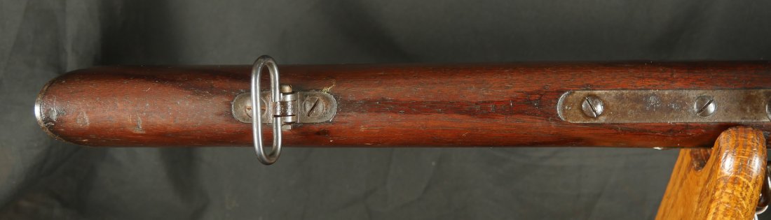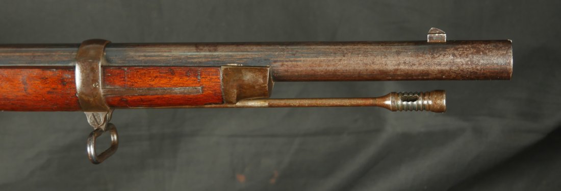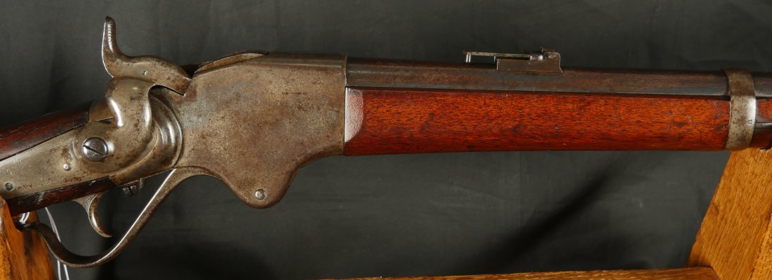 GR-0226-6826, Spencer Model 1865 Military Rifle. .50 RF. These conversions were done by the Burnside Rifle Company. The US government ordered these to be done after the Civil War. Serial number 23,XXX. 32 ½ inch barrel. The rifle has 2 bands with a ramrod. This rifle was altered from a Carbine to a military rifle in .50 cal with stabler cutoff and done in 1871. The rifle has an 1860 style magazine tube with about 40% rainbow hues on the frame with the rest of the case color turning to mottled brown from rainbow hues. The barrel has strong flashes of blue on the barrel with about 20% deep blue mixing to brown. Cartouche on the stock is visible but shows some wear. There is scratch through the cartouche. The patent address is marked 1865 with Burnside marking. The stocks show light bumps, dings and light scratches. Fine wood and fine metal. Fine wood to metal fit. The bore is bright, shiny, crisply rifled with a few tiny scattered patches of residue. Fine condition bore, may clean to excellent. The mechanics are crisp and tight. Fine overall condition.