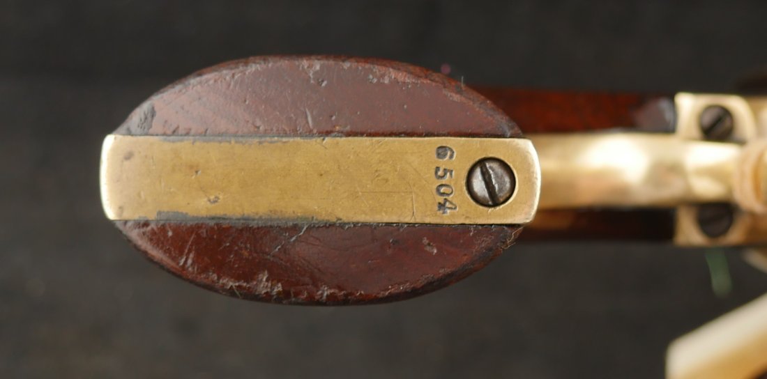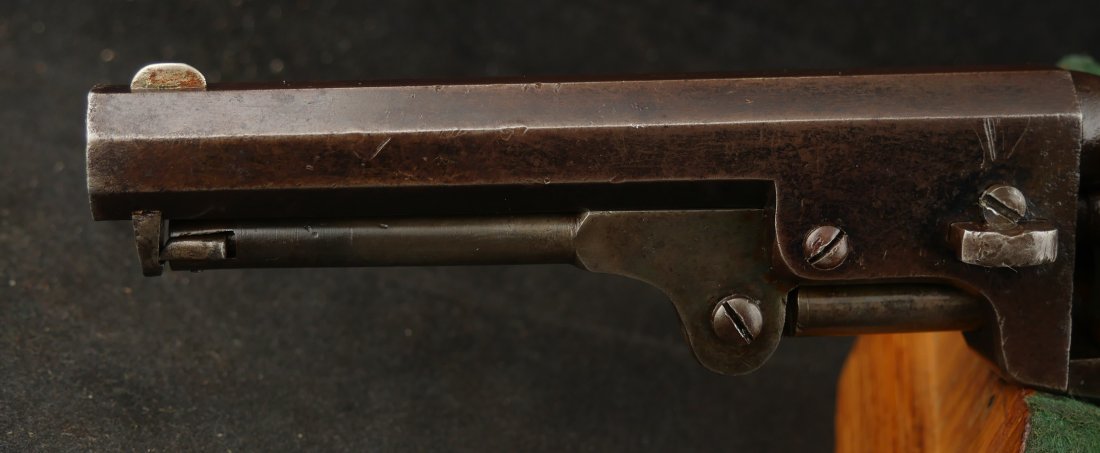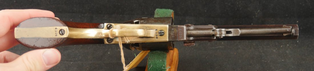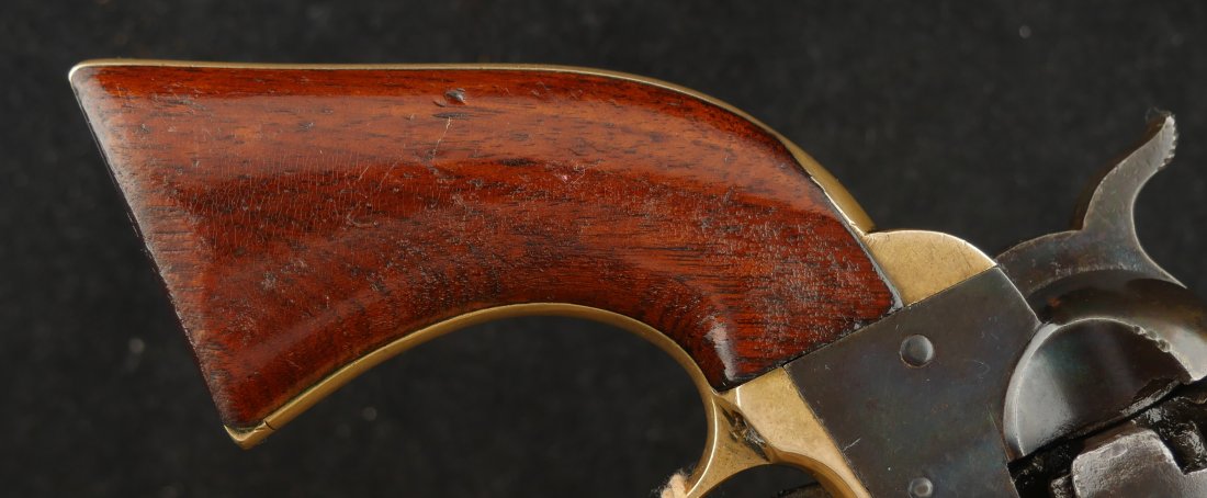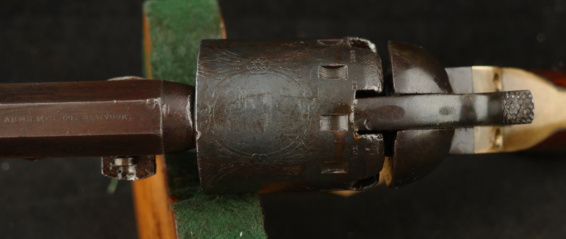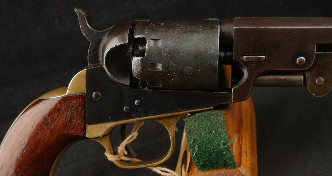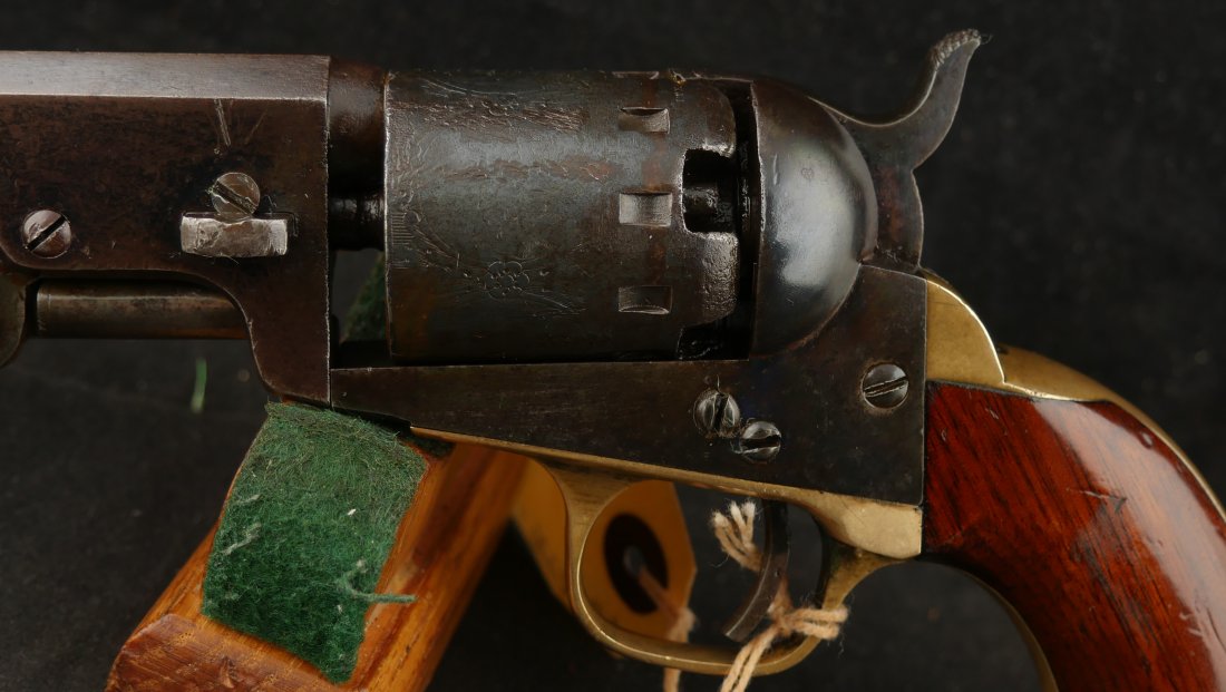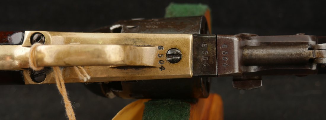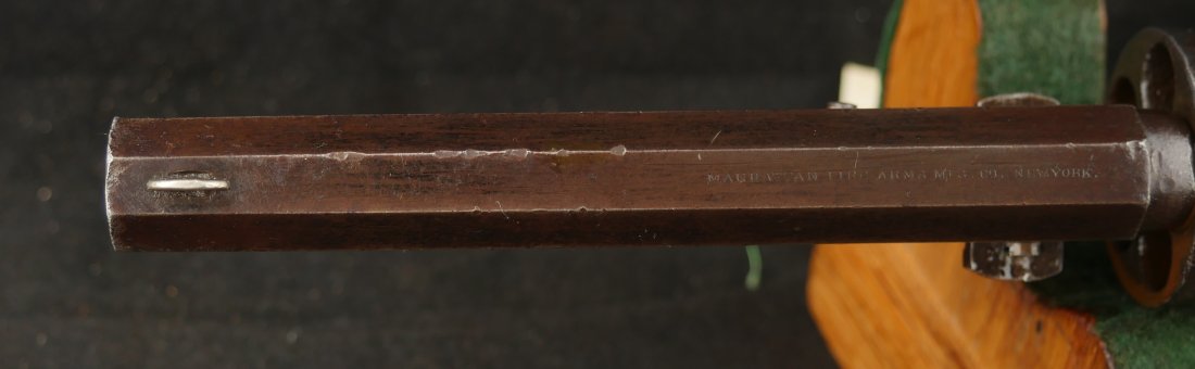 GR-0226-6841, Manhattan Navy .36, 5 shot, series II. Serial number 65xx matches on the barrel, frame, guard, strap, wedge and cylinder pin. I cannot make out a number anywhere on the back of the cylinder, it is worn away. The gun is covered in a dark chocolate patina. The cylinder retains 90% scene, there is some cold blue on the cylinder. The barrel has about 20% original blue finish while the frame retains about 50% original case color of which most is faint and has plummed. There are flashes of bright case color on the frame, lever and hammer. The grips are thin profile and retain 90% original varnish. The mechanics are nice and crisp with 4 clicks, functional half and full cock positions. The bore is bright, mostly shiny, with some fine pinprick like pitting near the muzzle and some residue in the bore near the muzzle. The bore needs some more cleaning, it is very good as it is, may clean better. Very good – fine overall.