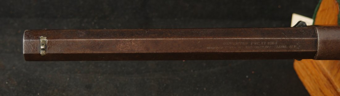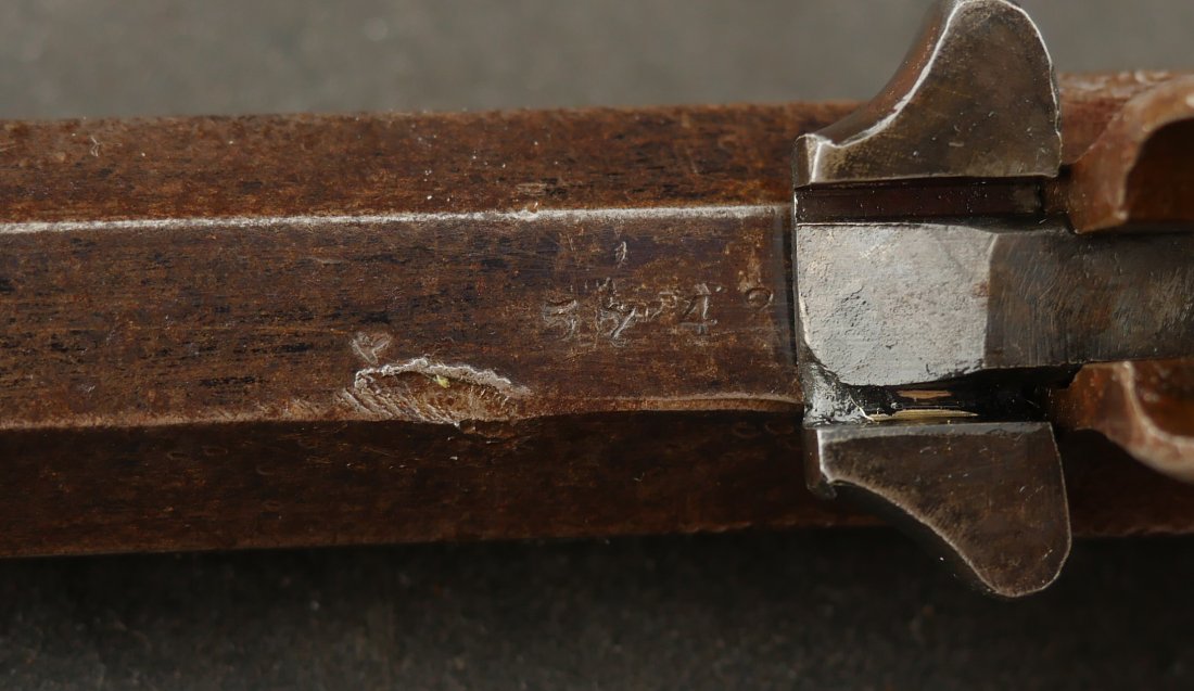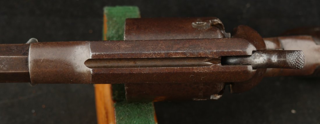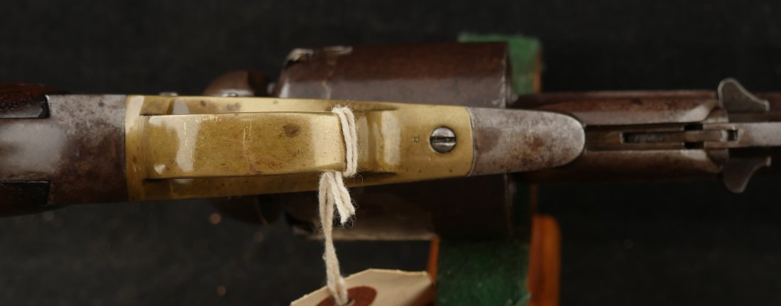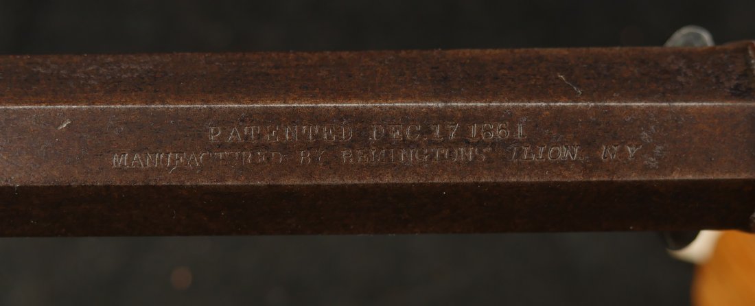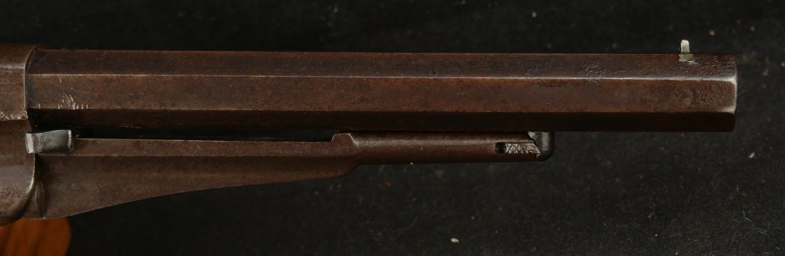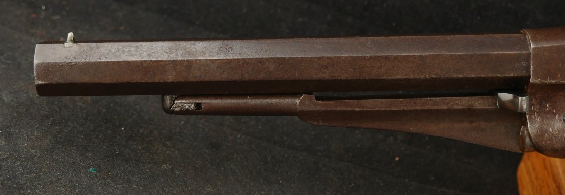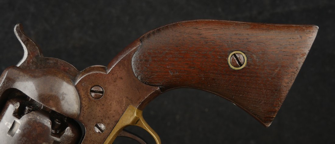 GR-0326-6825, Early Remington Old Model Army. .44 percussion, 6 shot. 1861 dated barrel address. Serial number 57xx matches on the barrel, cylinder, frame, trigger-guard and is penciled on the inside of the grips. The frame sits flat to the cylinder, this is the case with early 1860 Armies. The grips are original, show light wear, wood to metal fit is excellent, the cartouche on the left grip is visible but faint. The gun metal retains a dark chocolate patina overall with strong flashes of original blue in protected places. Metal edges are crisp and clear. The mechanics are crisp and tight with tight lock up in the full cock position and functional half cock. The rammer is the first model with a channel for the cylinder pin. The bore is bright, shiny, crisply rifled with some light scattered residue and fine spots. Very good + bore. This is a great example of an Old Model Army, made early in the Civil War and certainly issued and used. The gun is all matching and not a gun that has been messed with. It is a quality Early Civil War veteran.