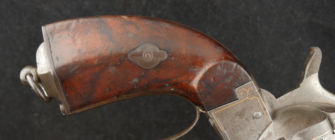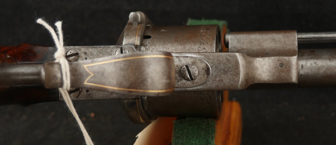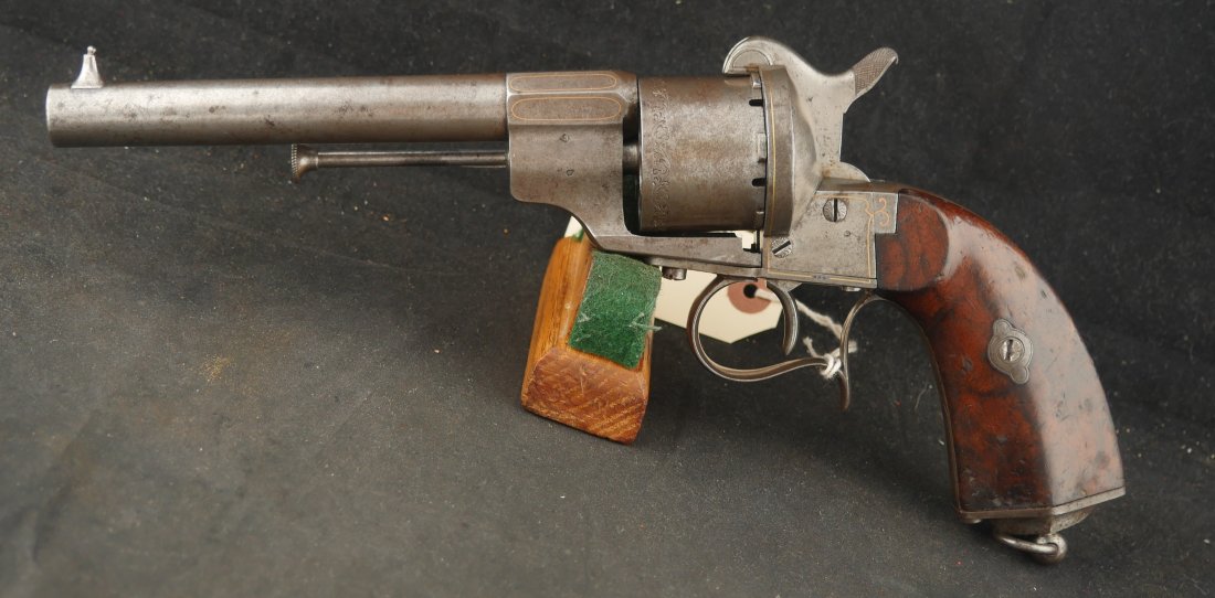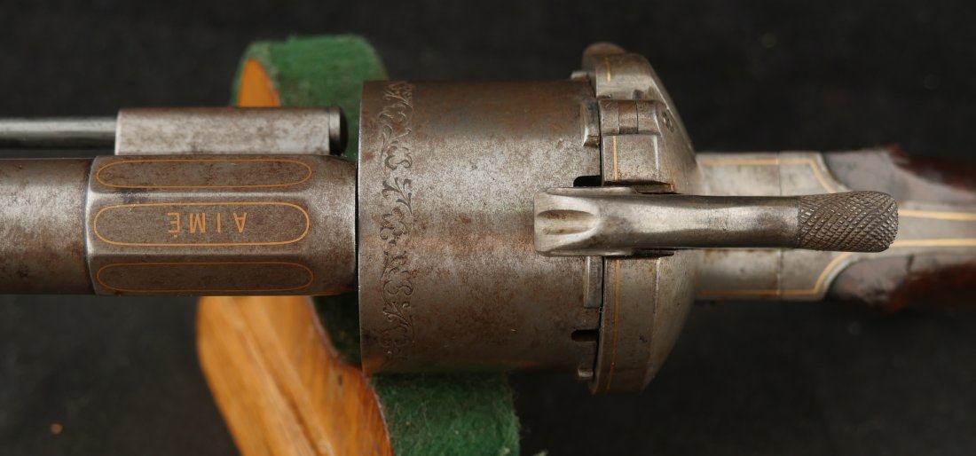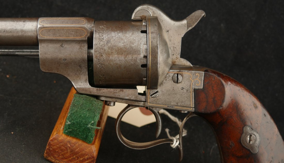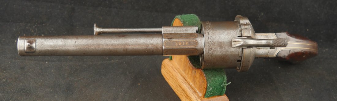 GR-0326-6842, Aime Pinfire Revolver. 11 mm. Decorated with gold inlay. Gun was finished in the white. I see no French, English or Belgian proofs. I am not sure where the gun is from, my guess would be Spanish. There is engraving on screw heads and cylinder. Grips have about 80% varnish with scattered bumps and dings on the wood. The mechanics are crisp and tight. Bore is excellent. There is patina that has built up on the gun over its lifetime. It does not look like it has ever been cleaned. Fine overall condition.
