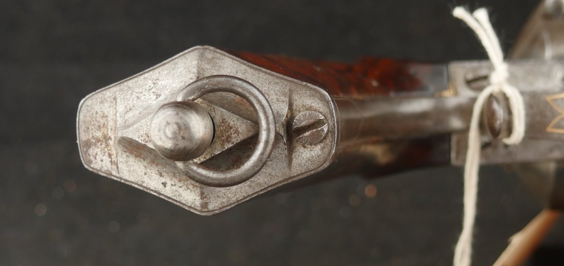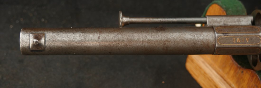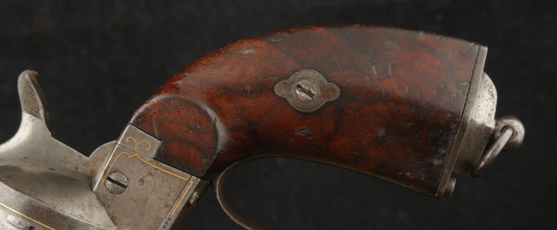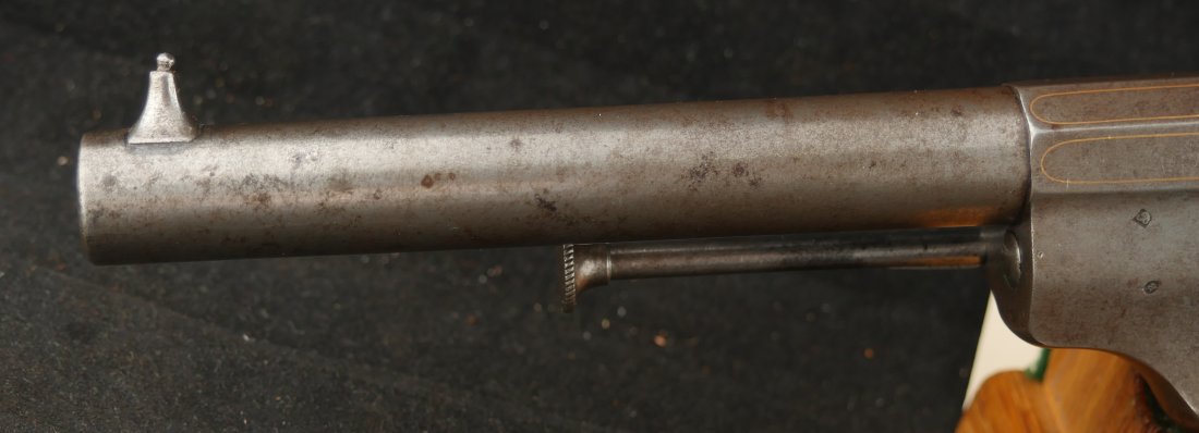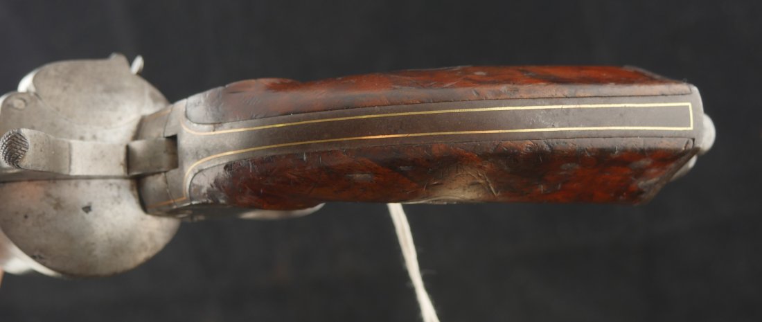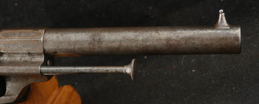GR-0326-6842, Aime Pinfire Revolver. 11 mm. Decorated with gold inlay. Gun was finished in the white. I see no French, English or Belgian proofs. I am not sure where the gun is from, my guess would be Spanish. There is engraving on screw heads and cylinder. Grips have about 80% varnish with scattered bumps and dings on the wood. The mechanics are crisp and tight. Bore is excellent. There is patina that has built up on the gun over its lifetime. It does not look like it has ever been cleaned. Fine overall condition.