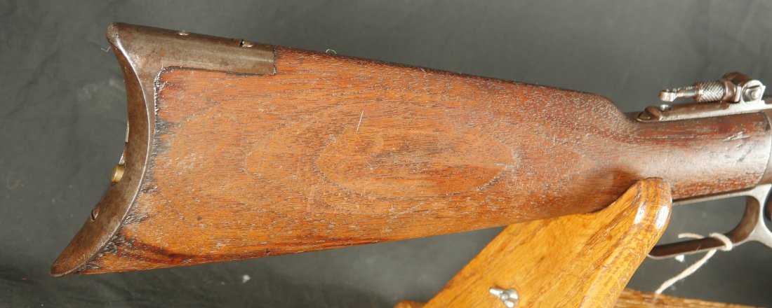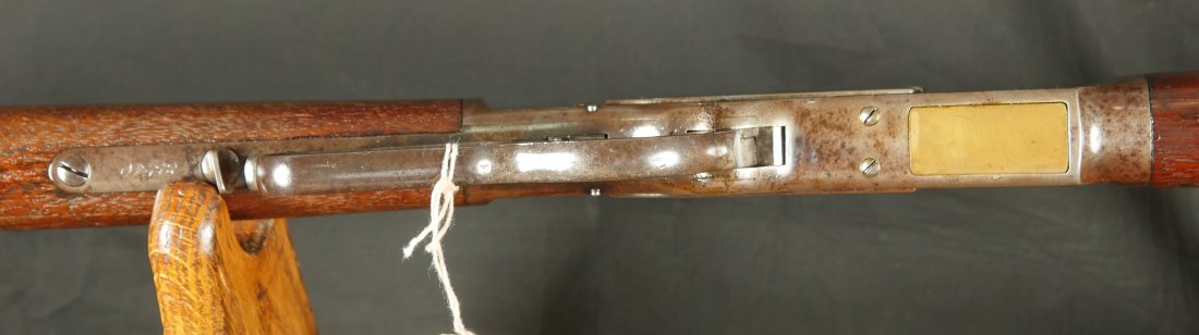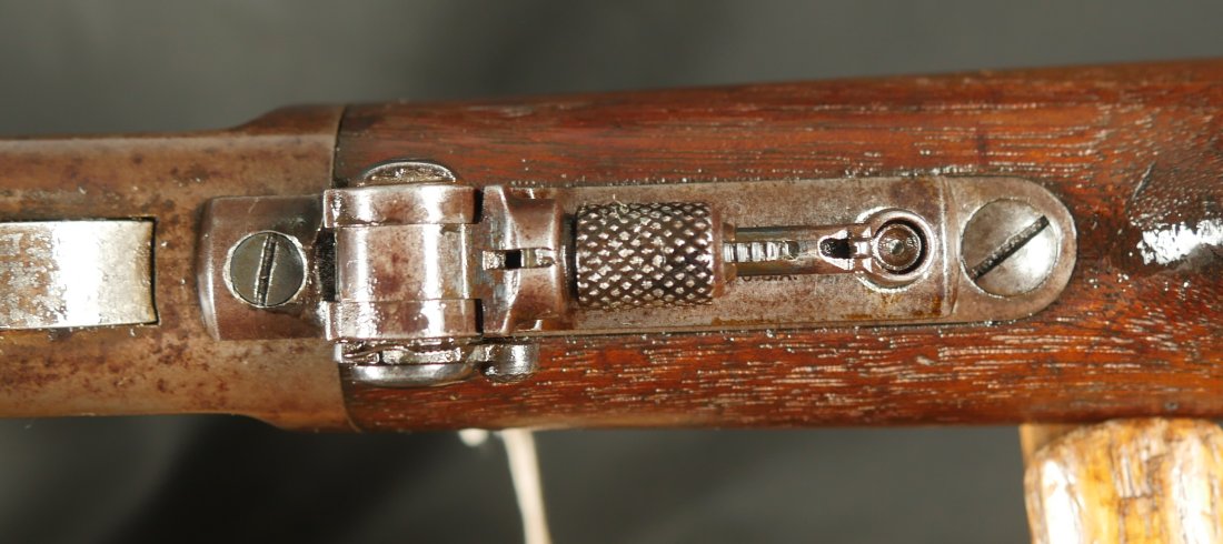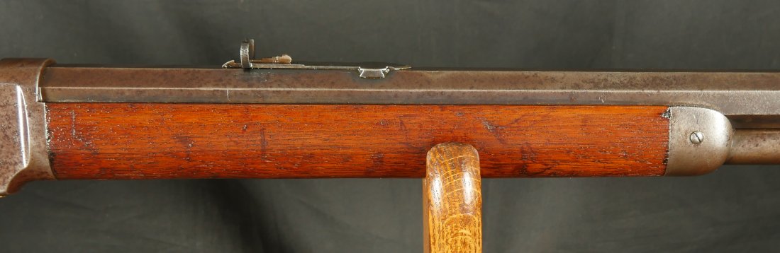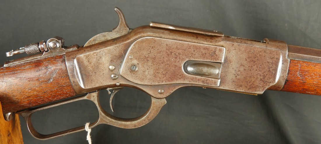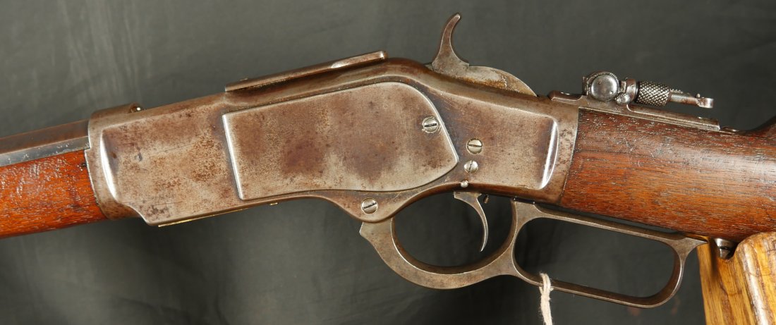 GR-0326-6857, Winchester Model 1873 2nd Model with thumb print dust cover. Special order 28 inch overlength, set trigger and tang site. 44-40 cal. The gun retains 10-15% original blue finish in low / protected places. The stocks show light to moderate bumps, dings and minor and light scratches. Serial number 35,xxx. Made in 1878. The bore is bright, shiny and crisply rifled. There are a few fine scattered spots in the bore but it is MUCH better than average for a 44. Fine condition bore. Crisp and functional mechanics. Very good overall. A very desirable configuration.