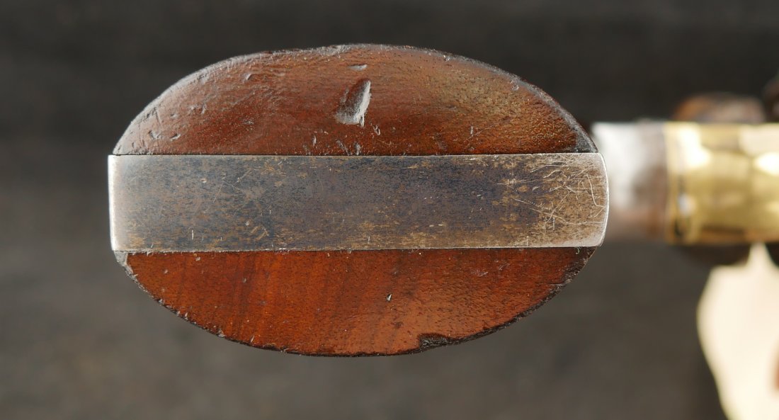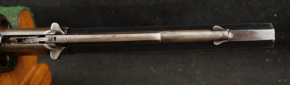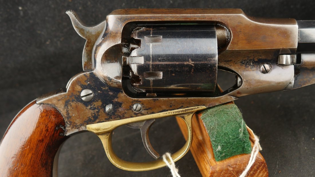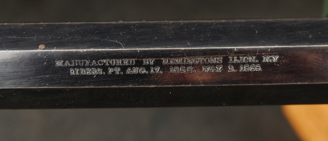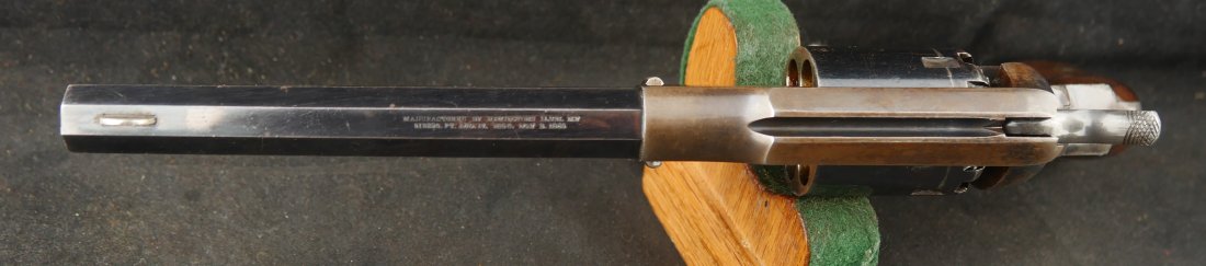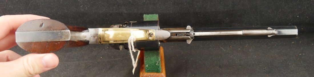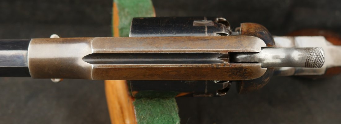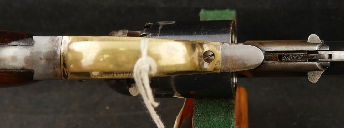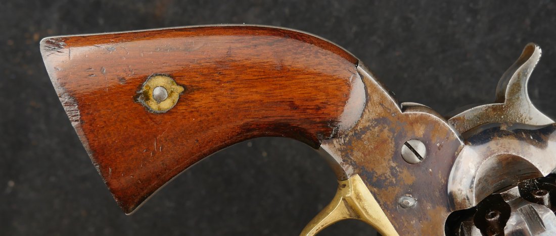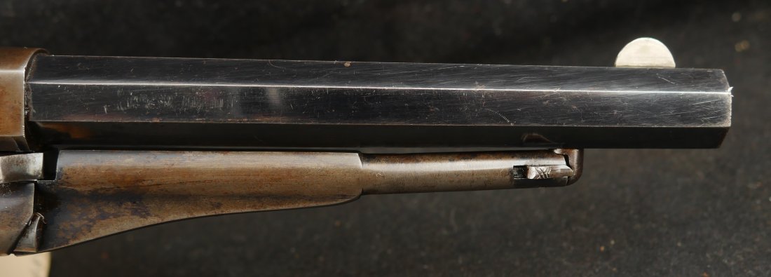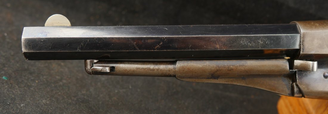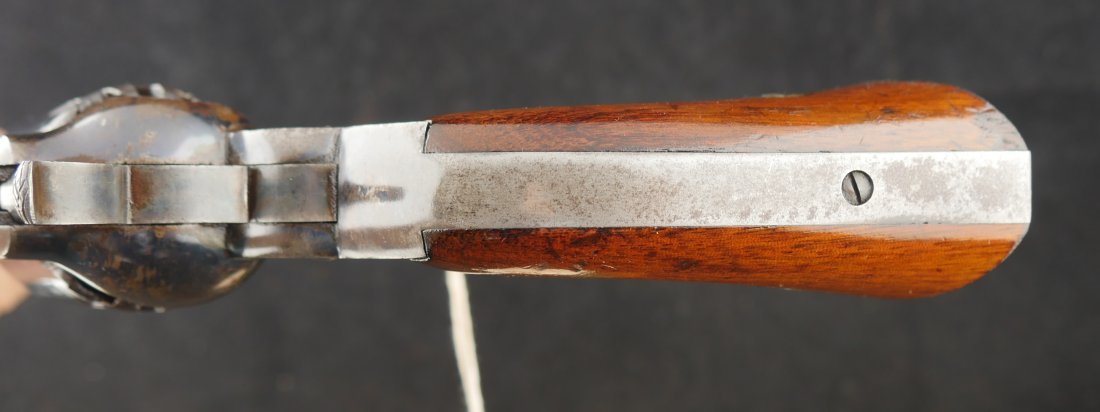 GR-0326-6858, Remington Rider Double Action Belt Model Revolver. .36 cal percussion. 6 shot. 6 ½ inch barrel. Serial number 30xx matches on the barrel, trigger-guard and frame. There is no number on the cylinder, this is correct for a Remington. The action is crisp and tight in both DA and SA. The grips retain about 90% original varnish and a few light bumps. All of the metal markings are crisp clear and legible. The barrel and cylinder retain about 90% original blue finish. The frame and rammer retain about 30% original blue. The hammer shows 60% toned rainbow hues. Excellent bore. It is estimated that Remington made between 3000 and 5000 of these revolvers. The overwhelming majority of them wound up as conversions to .38 RF. We do not find many of these revolvers in percussion and this is about the best we have ever found still in percussion. A very handsome gun and hard to find. Fine – Excellent overall.