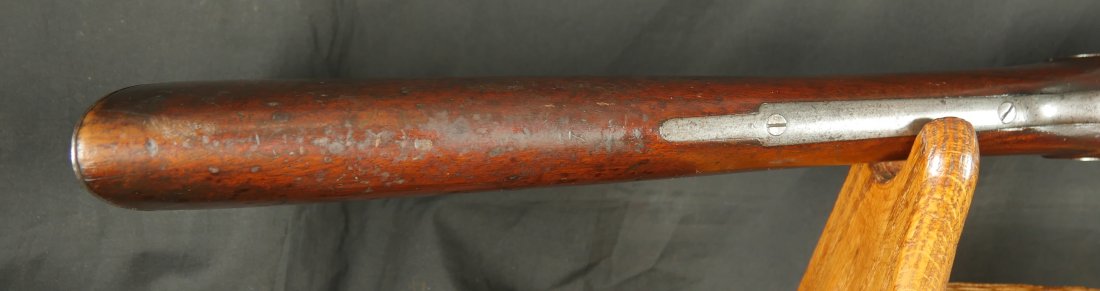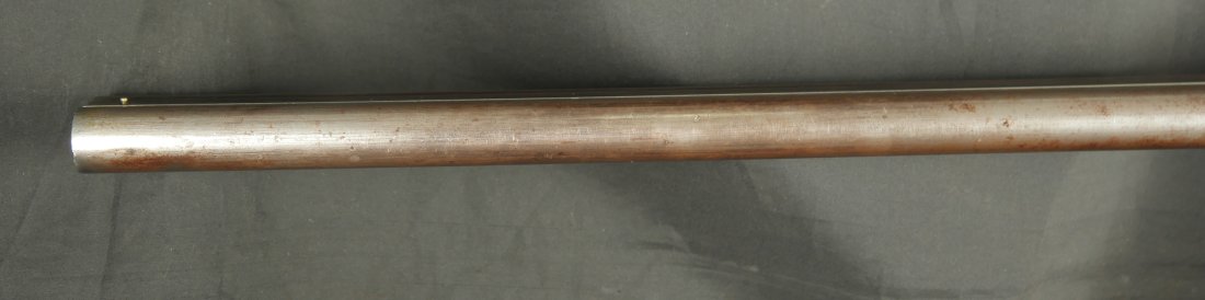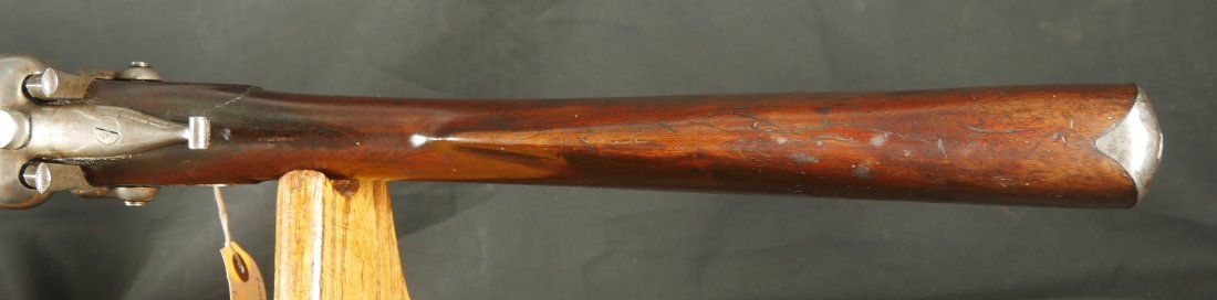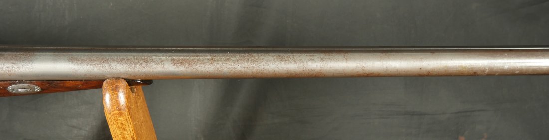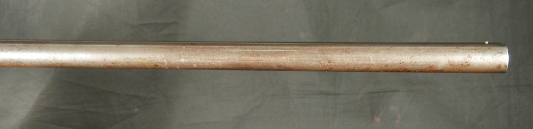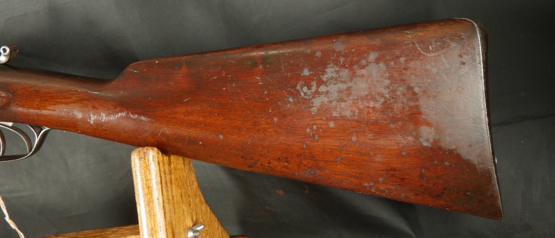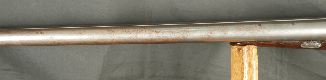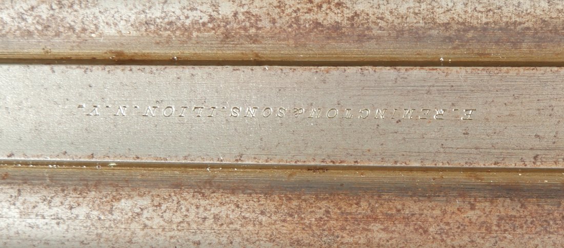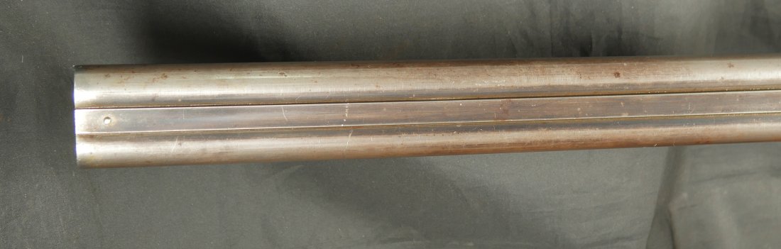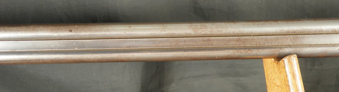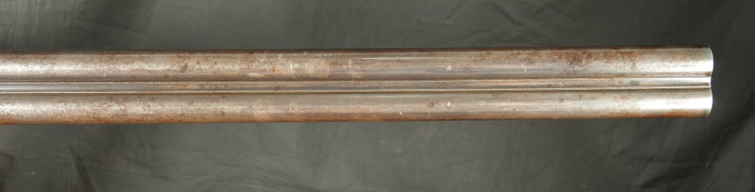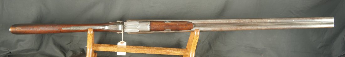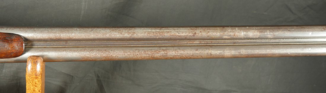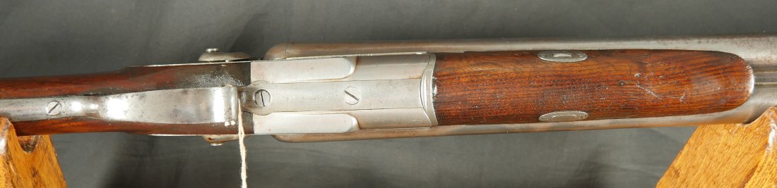 GR-0326-6870, Remington-Whitmore Model 1876 Double Barrel Shotgun. 10 Gauge. This is the early model with the “Lifter Action”. Barrel length is 32 inches. Barrel address reading: E. REMINGTON & SONS, ILION N.Y.. Most of the gun is a mottled gray with about 5-10% original blue finish on the barrel, almost all of it is in the low spots of the barrel. Most of the frame has silvered in color but there is about 30% faded case color with some bright flashes of original case color. The stock shows moderate bumps and dings. The action is functional and locks up tight. The bore is bright and shiny with a few fine scattered spots. Fine condition bores. The mechanics are crisp and tight. Near fine overall condition. It shows light to moderate overall use marks. This gun is in much better condition than the average shotgun from the late 1800s. Shotguns were heavily used and had long lives. This is the standard double shotgun type. There is an old crack in the stock on the right side of the gun just behind the lock plate.