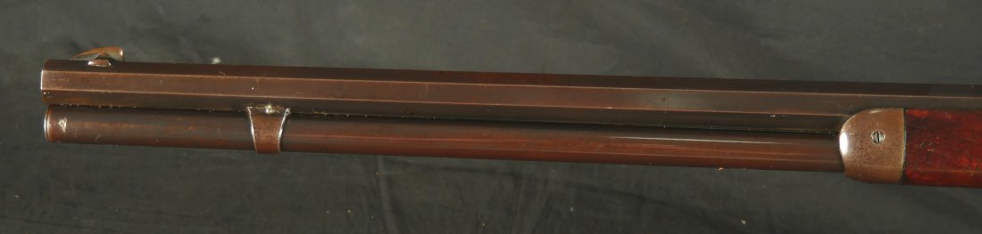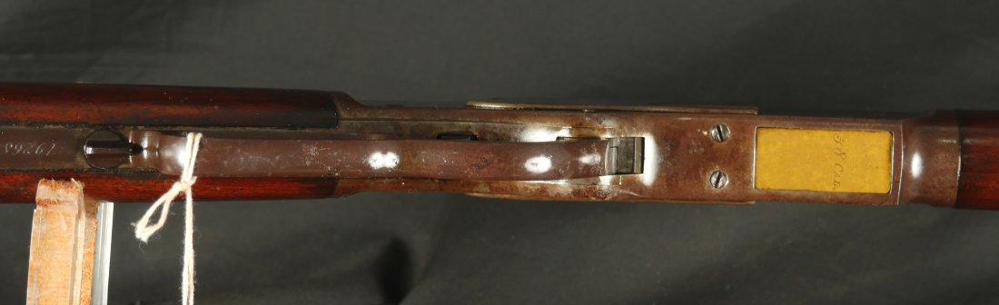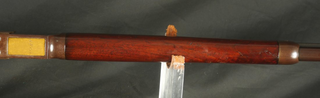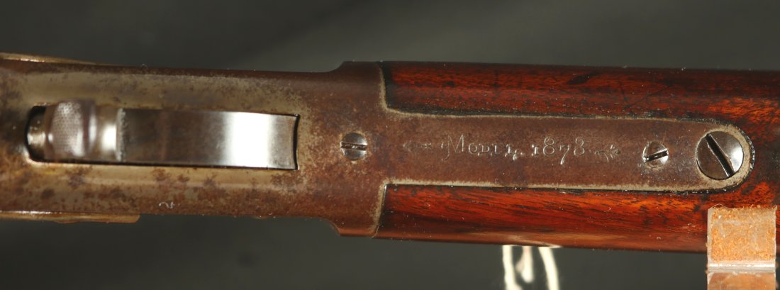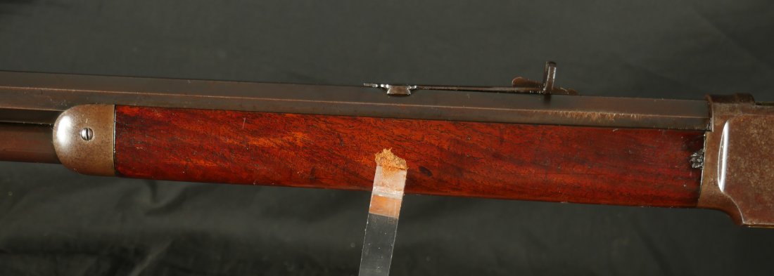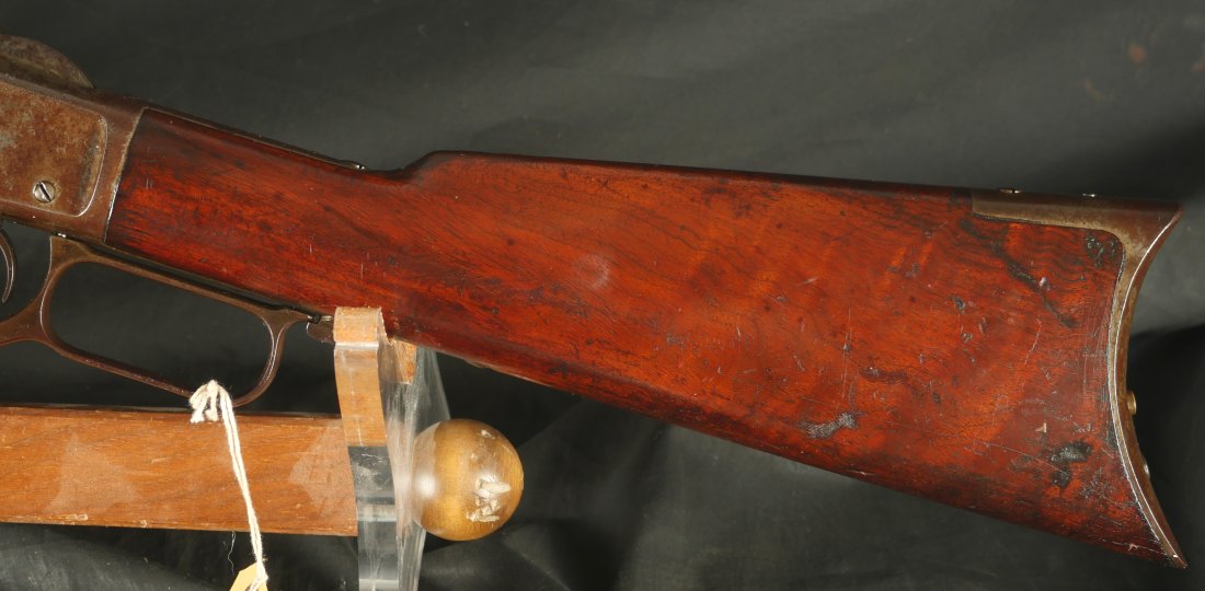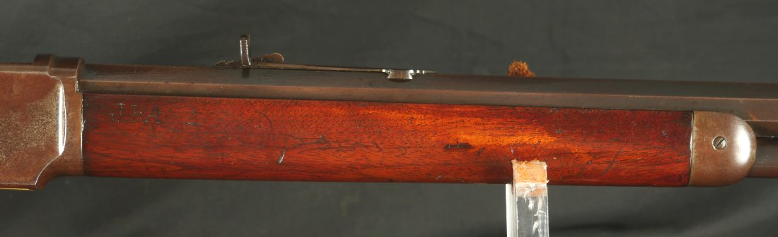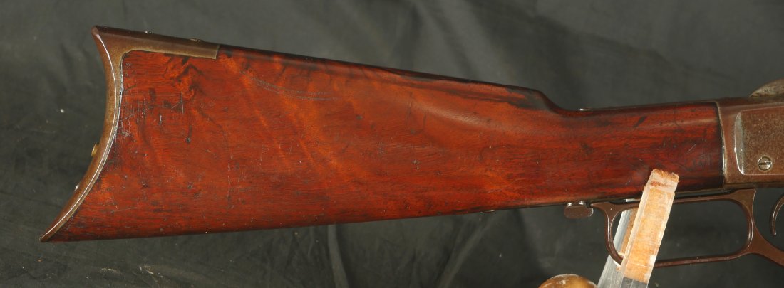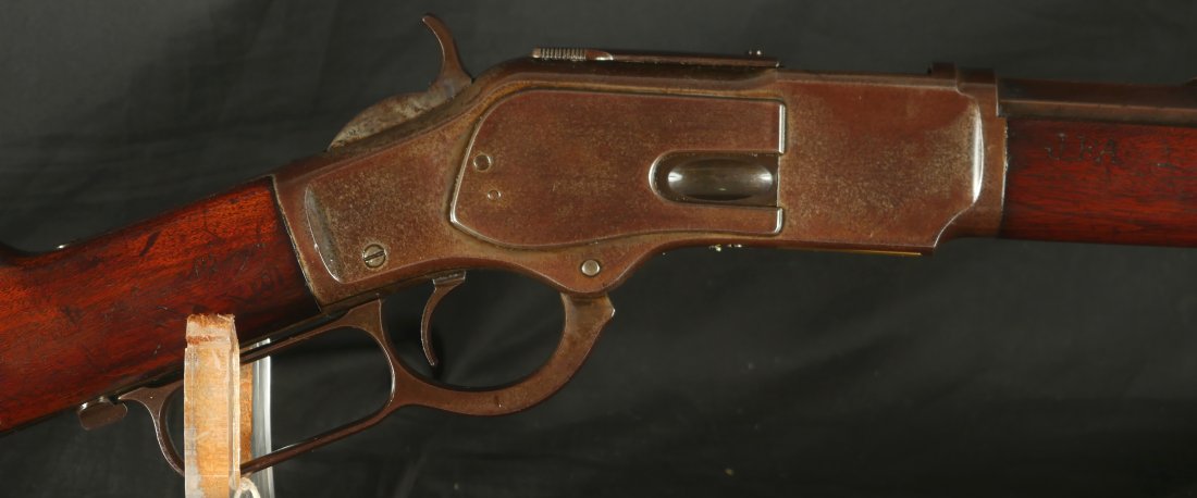 GR-0326-6872, Special Order Case Hardened Winchester Model 1873. Case Colored frame. .38 WCF. 24 Inch barrel. Serial number 192,xxx, gun was made in 1885. The barrel retains about 60% of the original blue mixing to an even brown patina. There are light bumps and dings to the stock, The wood shows honest use and normal wear Marks. The gun did not just sit in a closet, it was carried and used. The wood to metal fit is excellent. The case colored frame shows strong traces of original case color, if I had to put a percentage to it I would say about 5%-10% bright case colors, the remainder has turned mottled brown. The initials JRA has been applied into the right side of the forearm stock. The mechanics are functional. The bore is bright, shiny and crisply rifled with only a few tiny spots in the bore.. Fine ++ bore. The gun was used but cared for. Any case hardened 1873 is hard to find and this gun is in very nice and honest condition. Fine overall condition.