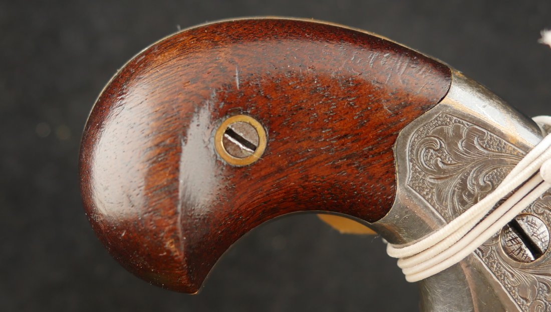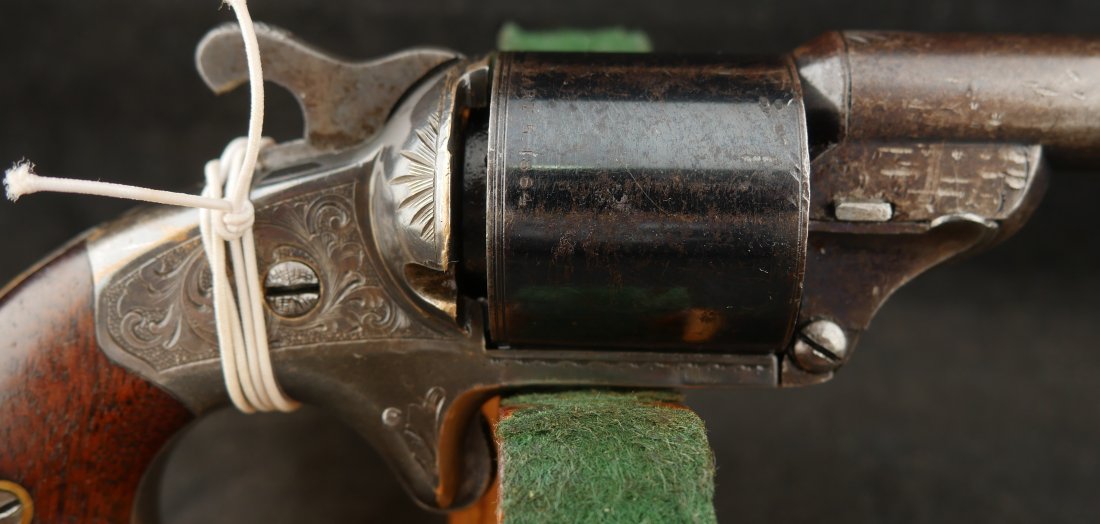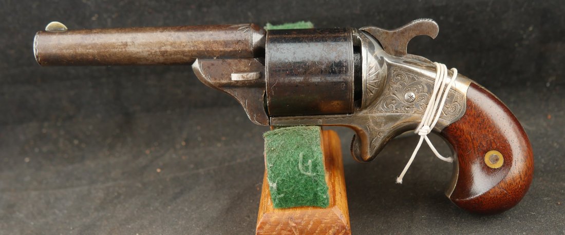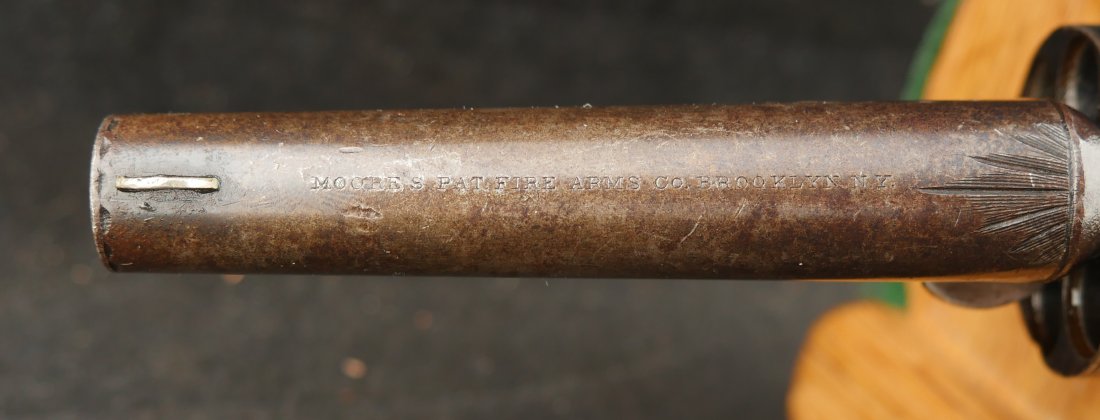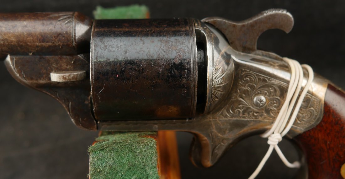 GR-0326-6876, Moore Teat Fire Pocket Revolver. .32 Teat Fire. 6 shot. Factory engraved frame with 90% tarnished silver on the brass. The grips show light wear on high spots of the grips. The cylinder retains about 75% deep blue with the barrel showing mostly mottled brown with about 10% original blue. Crisp tight action. The markings are crisp and clear with scattered light handling marks overall. Fine plus overall.