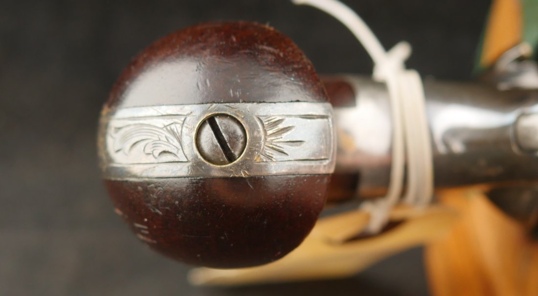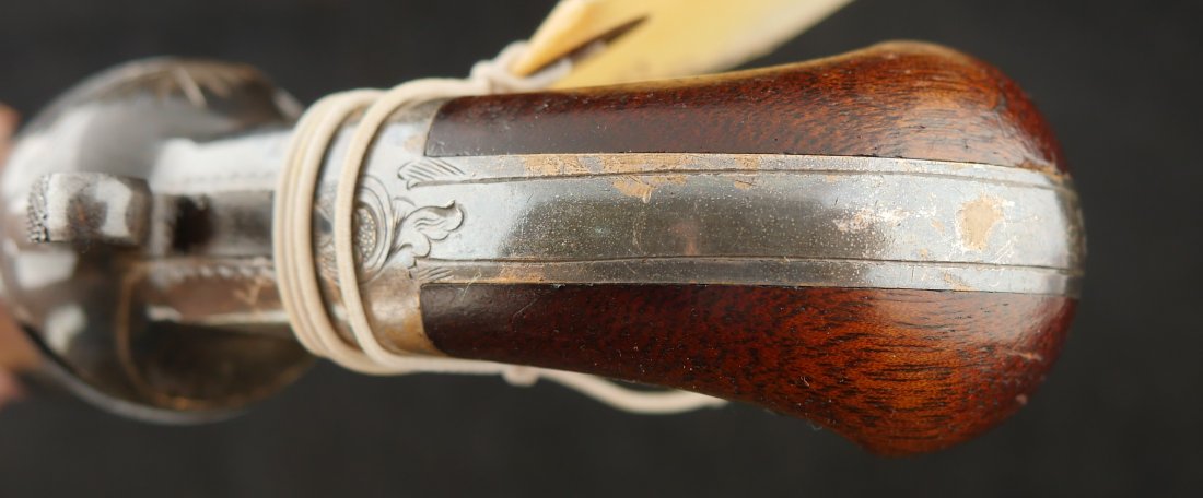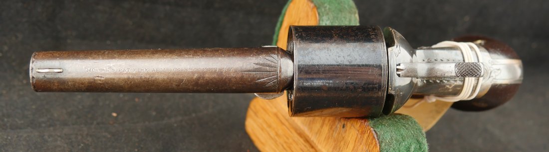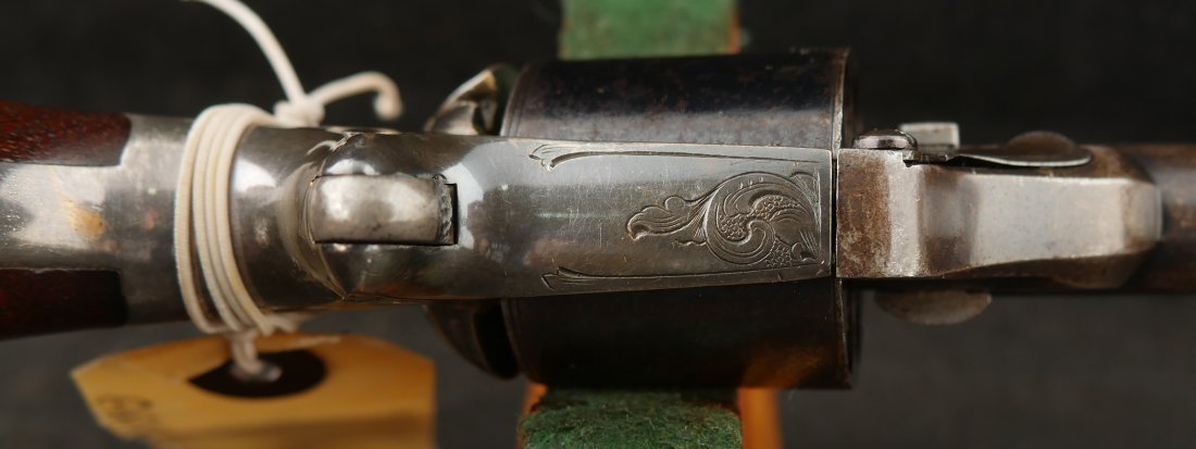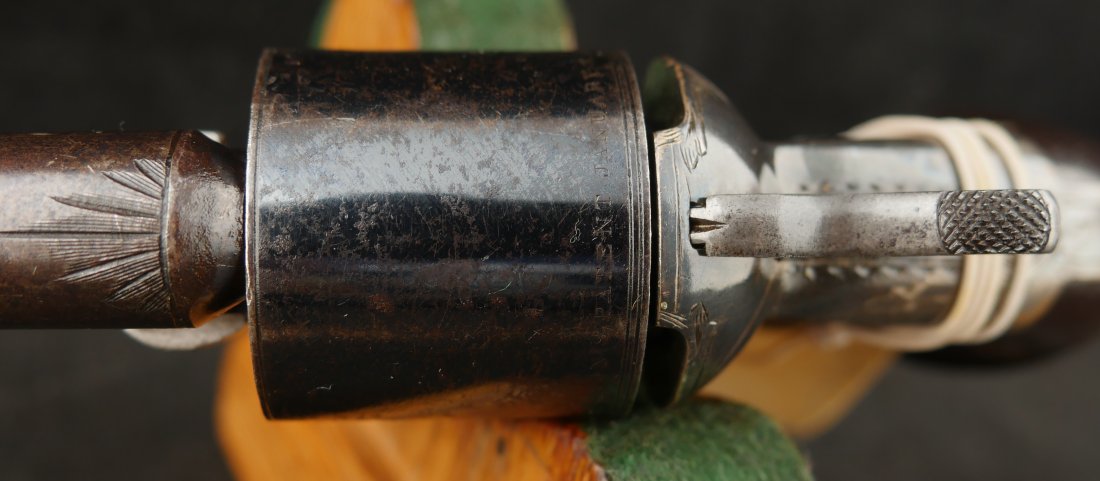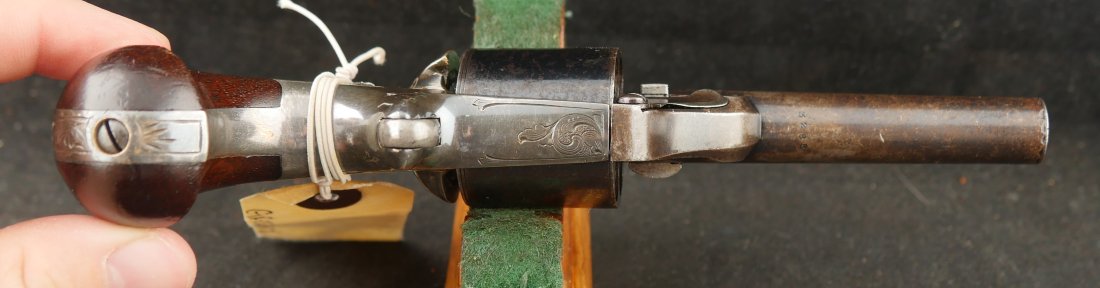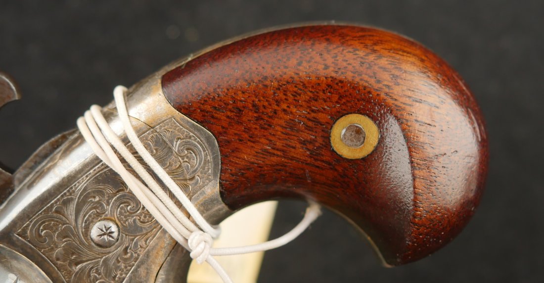 GR-0326-6876, Moore Teat Fire Pocket Revolver. .32 Teat Fire. 6 shot. Factory engraved frame with 90% tarnished silver on the brass. The grips show light wear on high spots of the grips. The cylinder retains about 75% deep blue with the barrel showing mostly mottled brown with about 10% original blue. Crisp tight action. The markings are crisp and clear with scattered light handling marks overall. Fine plus overall.