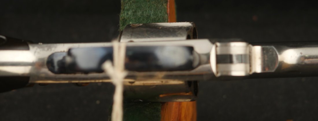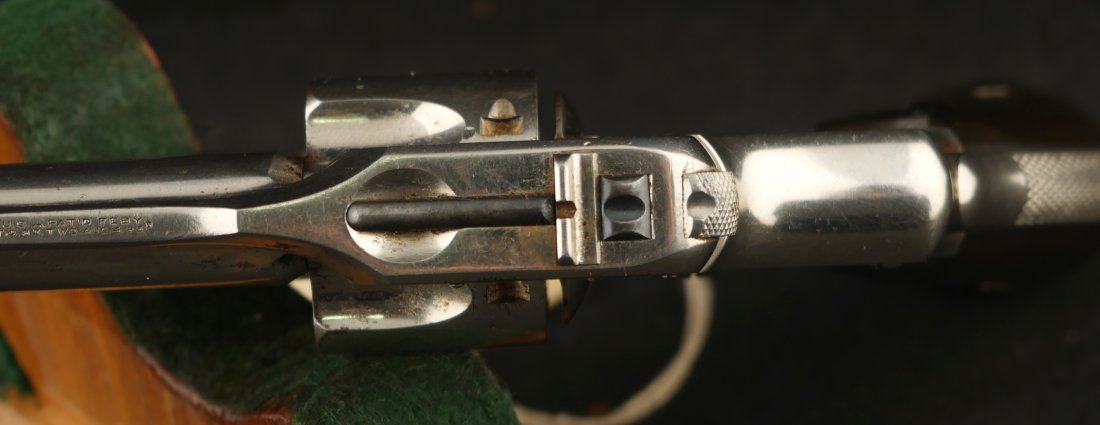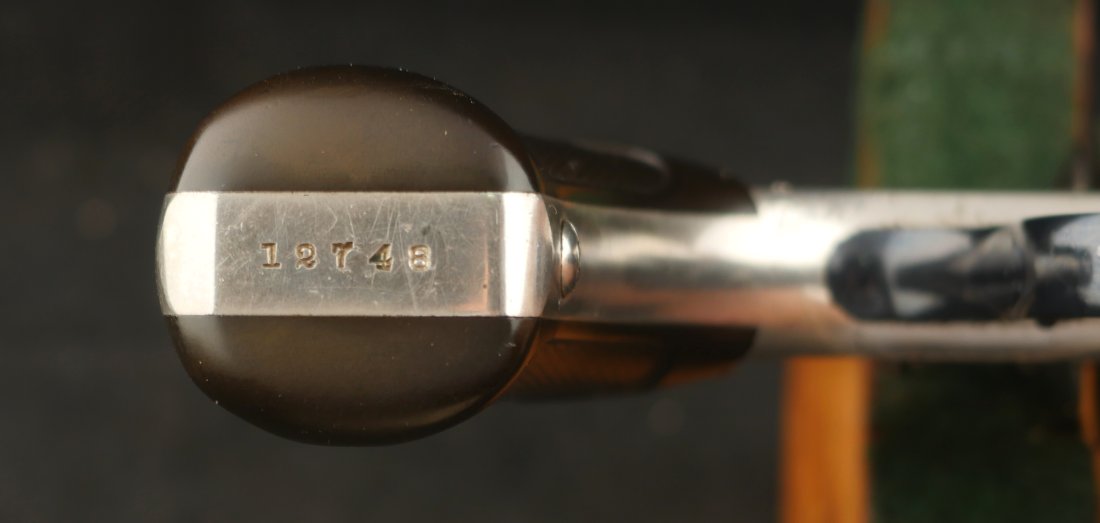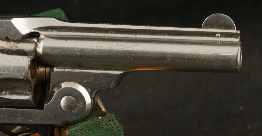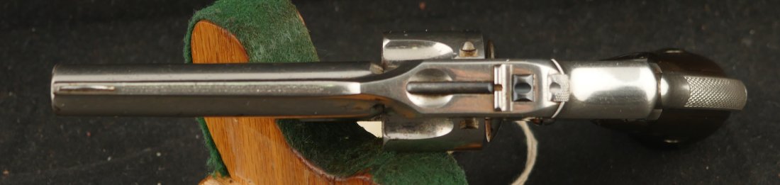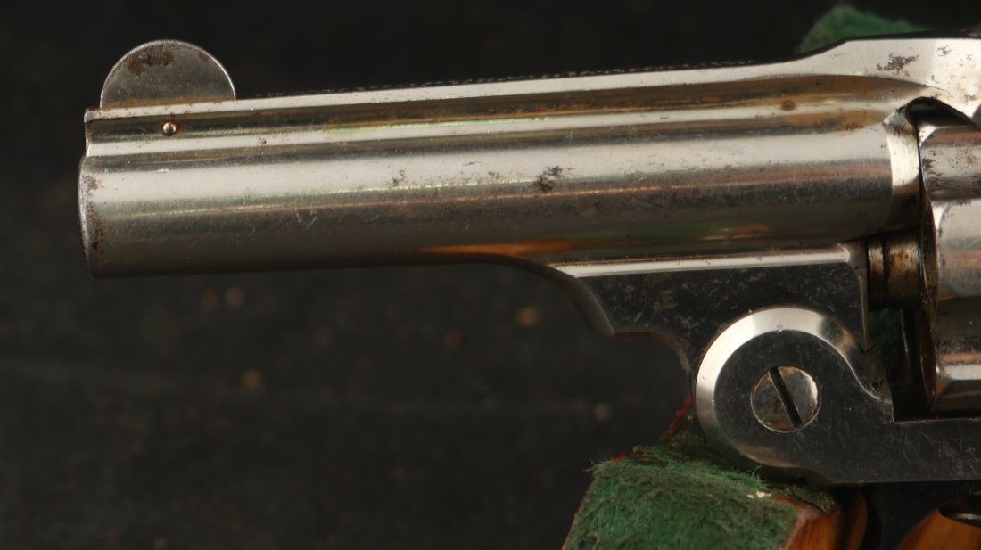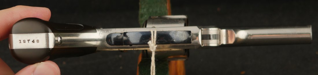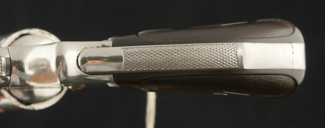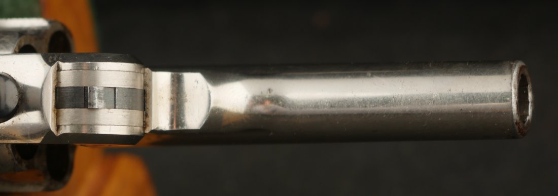 GR-0426-6886, Early Smith and Wesson .32 DA Safety Hammerless. .32 S&W CF, 5 shot revolver. 3 inch barrel. 95% bright original nickel with crisp grips. There are a few tiny surface residue spots on the exterior of the gun. The case color on the trigger is 90% present. The bore is bright, shiny and crisply rifled with a few tiny spots. Fine + bore. Crisp functional mechanics. The ejector is functional. Serial number 12,xxx matches on the frame, barrel and cylinder. Excellent overall.