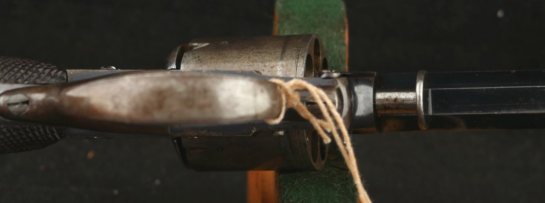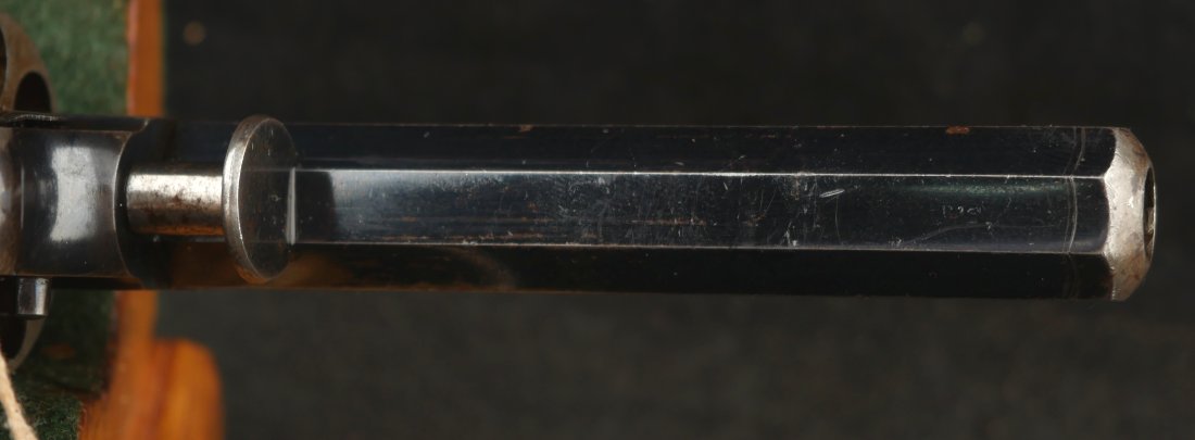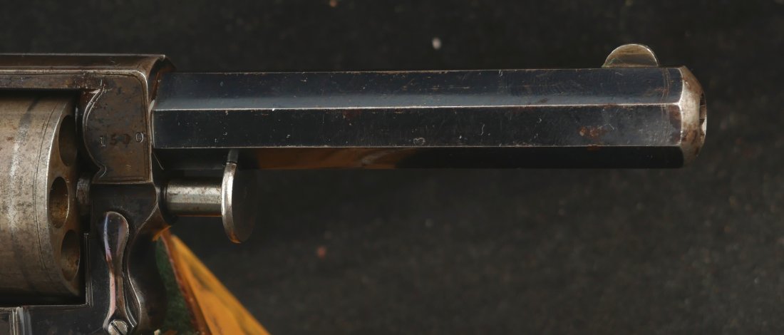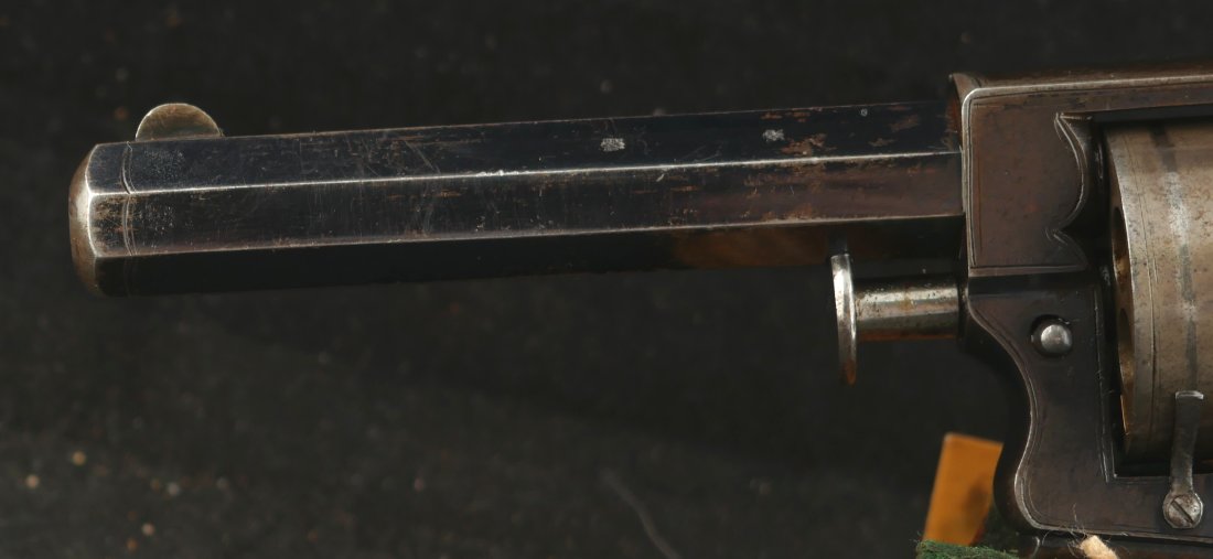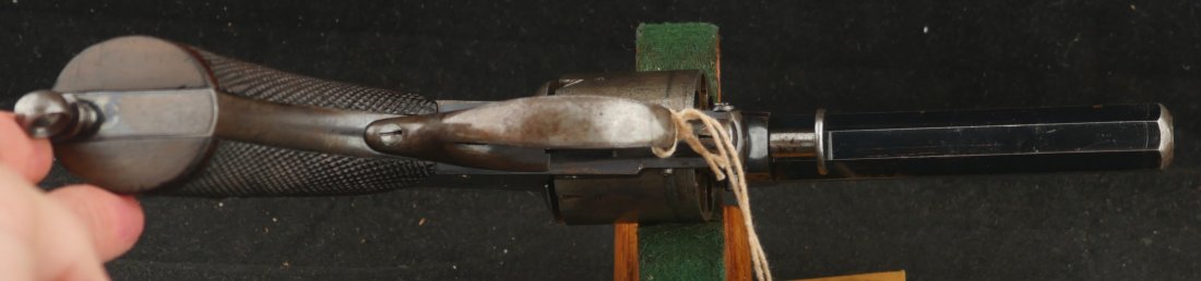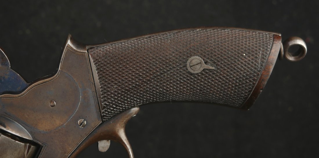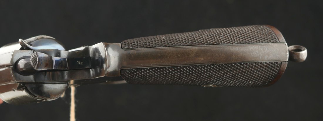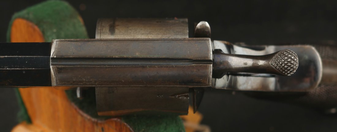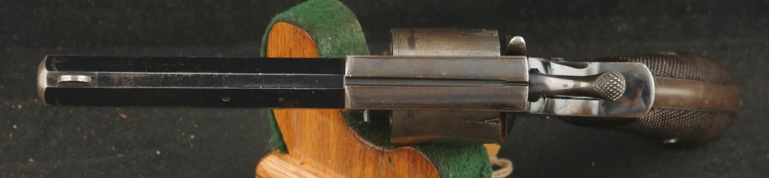 GR-0426-6894, Trantor Pocket Pistol. 4 inch barrel. 7 shot. I am not sure what caliber it is. The bore gauges to .30 or 7.5mm. It is center fire. .320 CF maybe. The gun is in really great condition with overall 70% deep blue on the barrel. The blue on the frame has flaked, there is about 20% blue on the frame. Screw heads are excellent. Grips are excellent. The cylinder was case colored, much has silvered but the cylinder retains about 20% bright case color. The wood grips are crisply checkered. The barrel and cylinder show English proofs, the only other marking is 1500 on the right side of the frame. Crisp tight, excellent mechanics in both DA and SA. Bore is bright, shiny and crisply rifled with some light scattered residue. Fine condition bore. Fine overall.