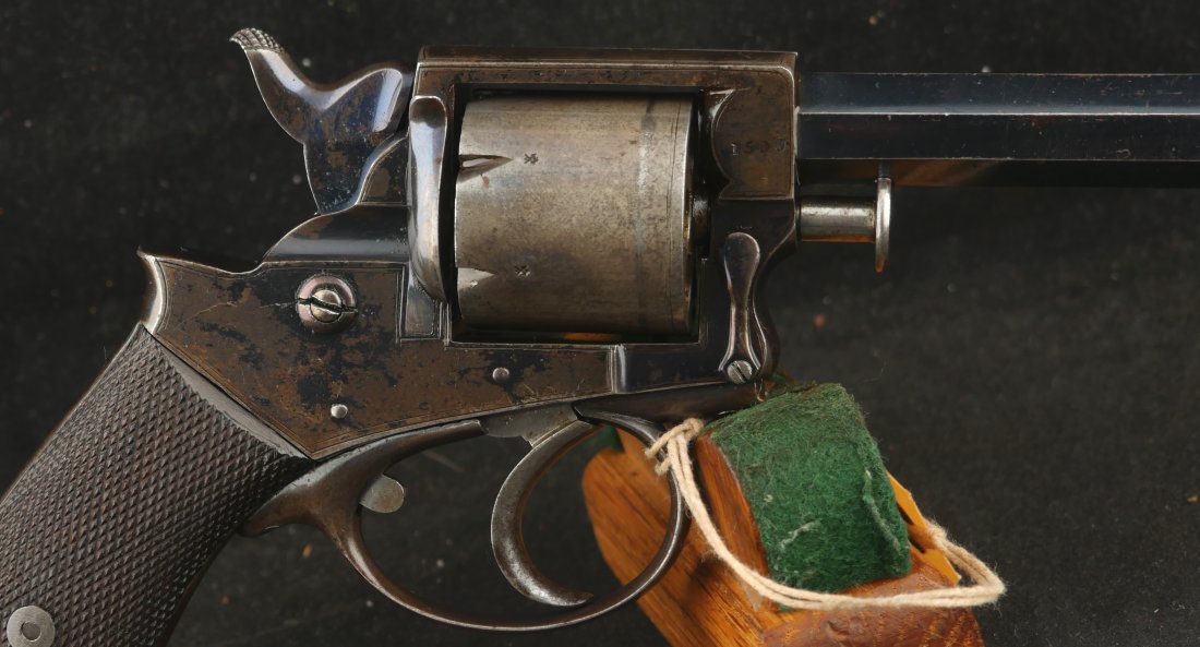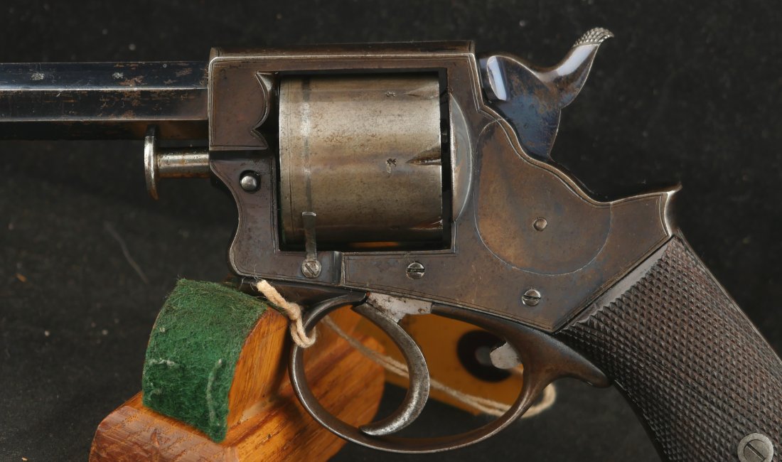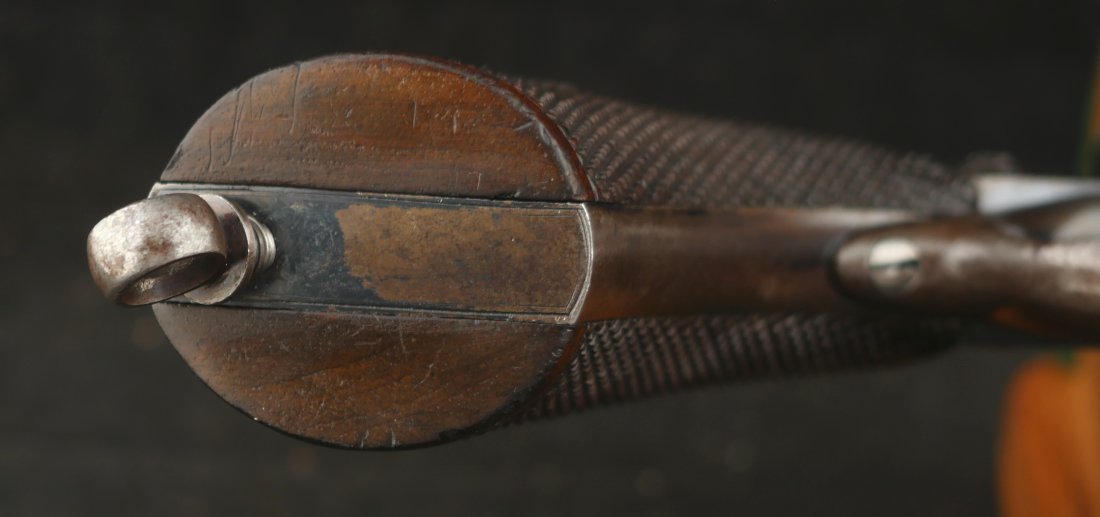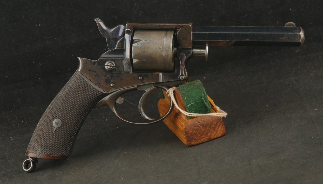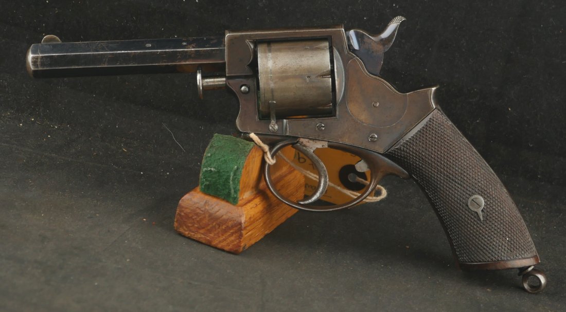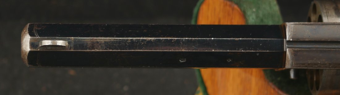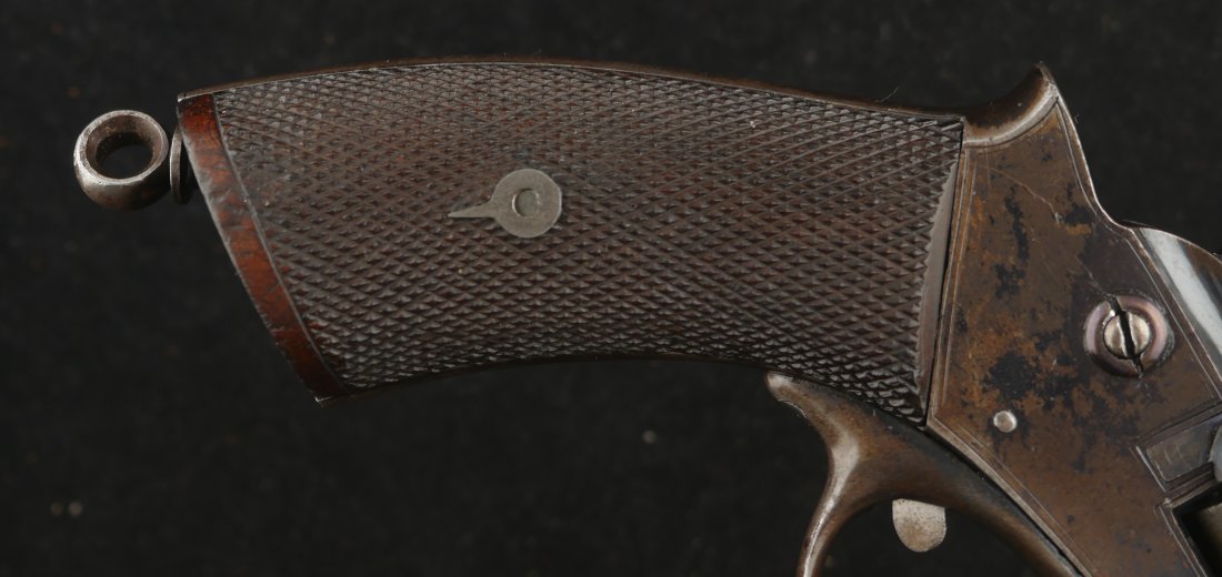 GR-0426-6894, Trantor Pocket Pistol. 4 inch barrel. 7 shot. I am not sure what caliber it is. The bore gauges to .30 or 7.5mm. It is center fire. .320 CF maybe. The gun is in really great condition with overall 70% deep blue on the barrel. The blue on the frame has flaked, there is about 20% blue on the frame. Screw heads are excellent. Grips are excellent. The cylinder was case colored, much has silvered but the cylinder retains about 20% bright case color. The wood grips are crisply checkered. The barrel and cylinder show English proofs, the only other marking is 1500 on the right side of the frame. Crisp tight, excellent mechanics in both DA and SA. Bore is bright, shiny and crisply rifled with some light scattered residue. Fine condition bore. Fine overall.