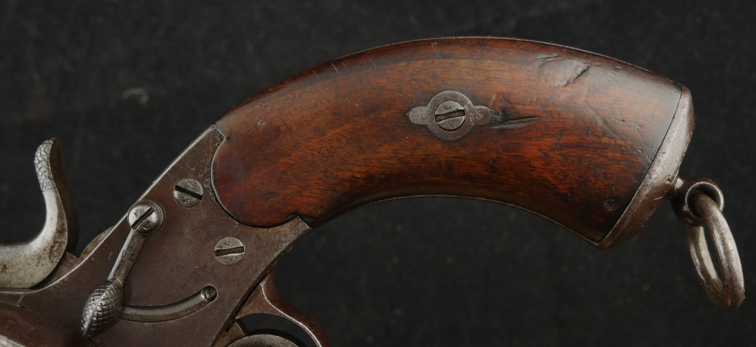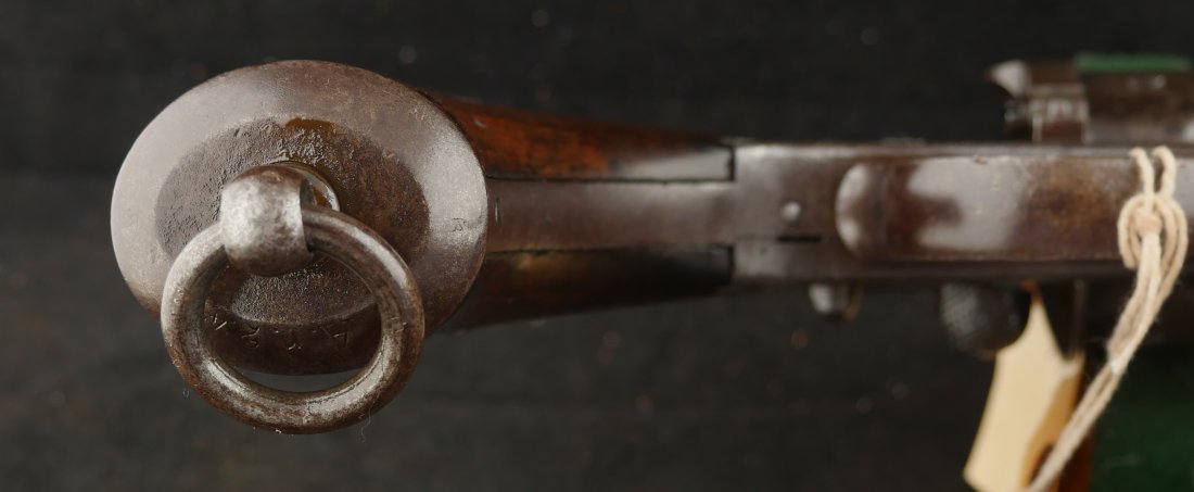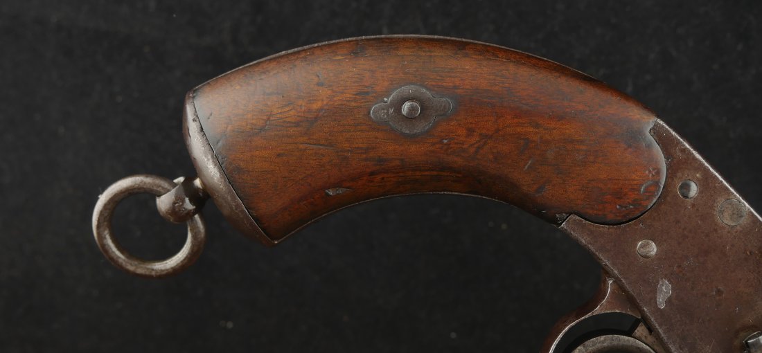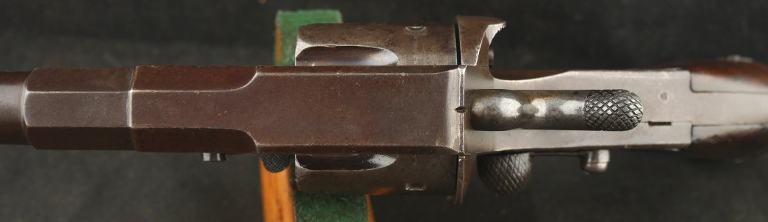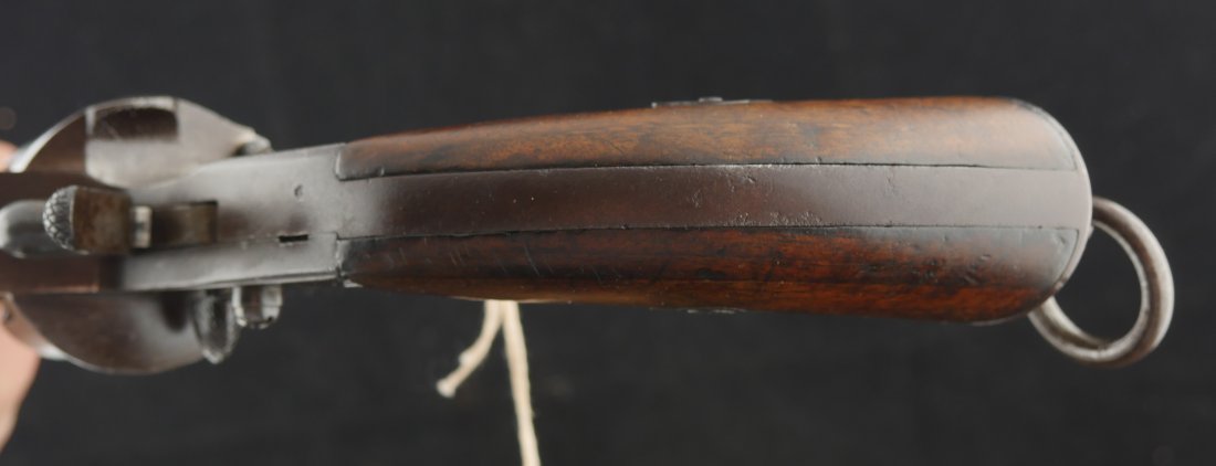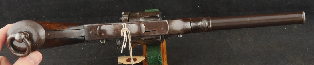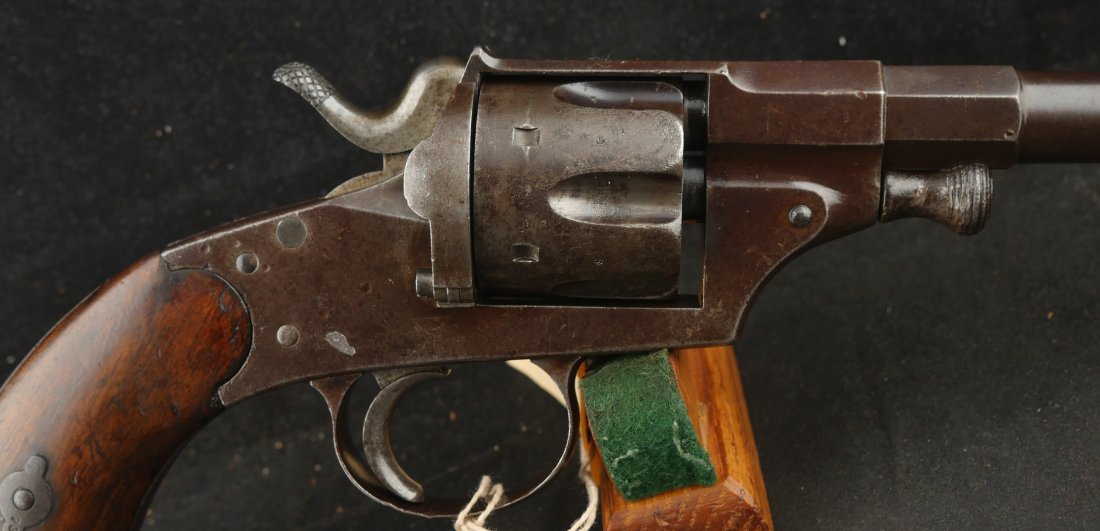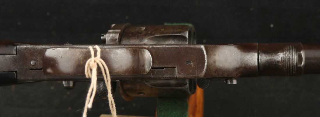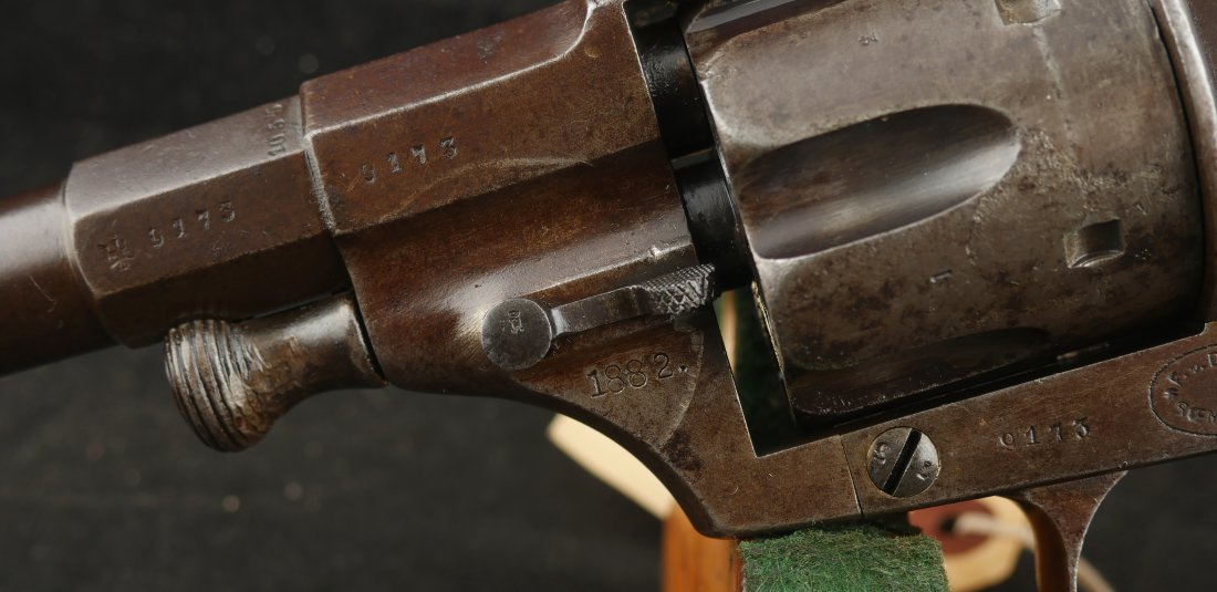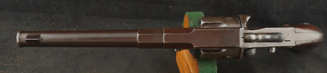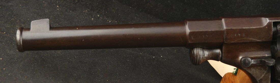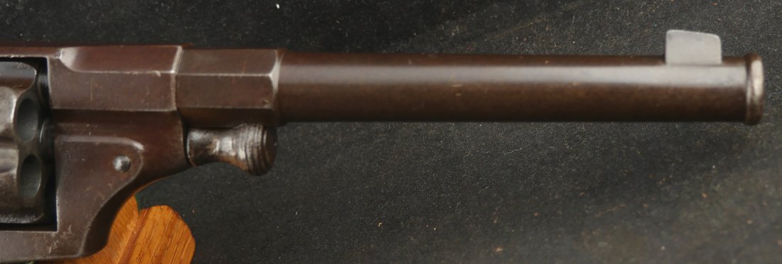 GR-0426-6897, German 1879 Reichsrevolver. 1882 date on the side of the frame. Serial number 93xx on the frame and barrel with matching numbers on many parts of the gun. The caliber is 10.6, I have been told it is the same as 44 Russian I have never tried it though. It was made to compete with the Colt Single Action revolver with a unique rounded German Muzzle, all markings are crisp, clear and legible. It has a lanyard ring in the butt cap and unit markings on the butt, 35 AR 2.47. Overall the gun is a dark chocolate patina with crisp markings. The mechanics are crisp and tight.The bore is bright, shiny and crisply rifled with scattered fine spots in the bore. Very good bore. The wood grips show moderate wear and a fine coating of oil so the grips do not dry out. These guns were used through the 1880’s up to WWI. Very good overall.
