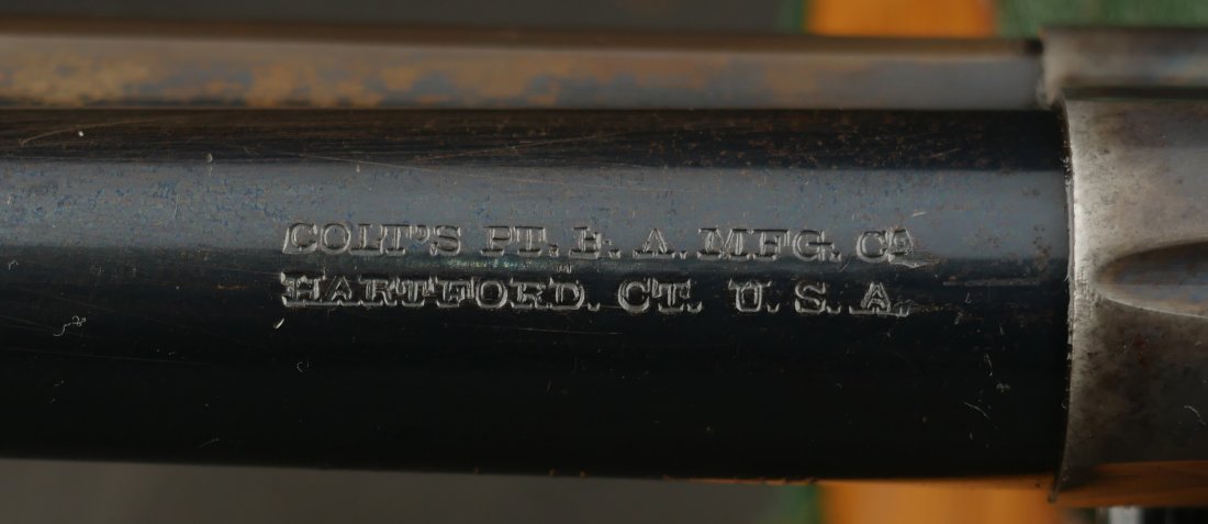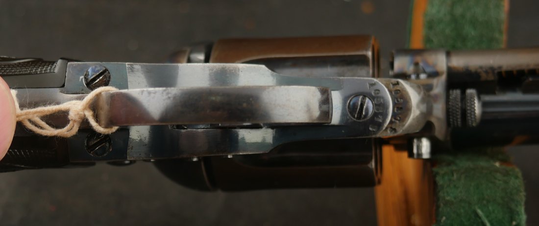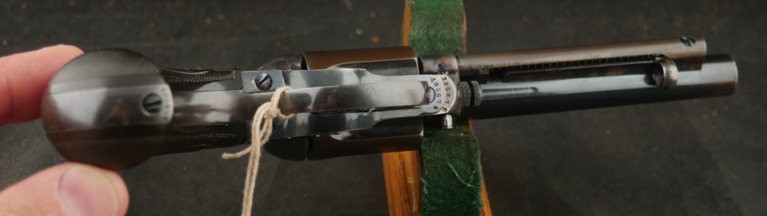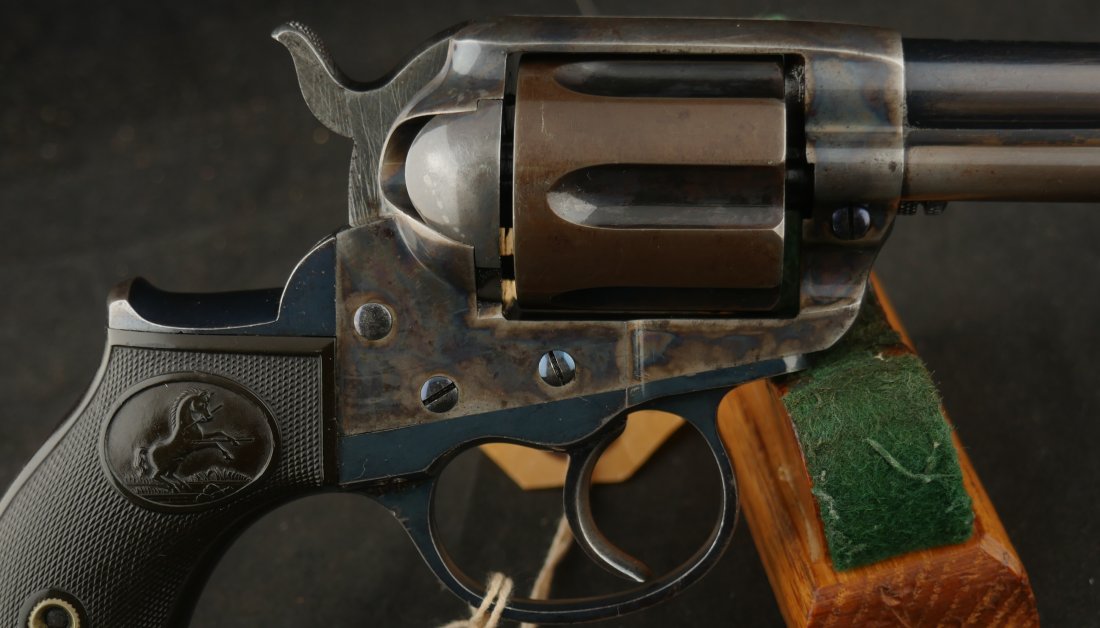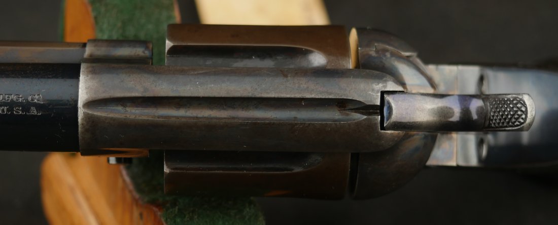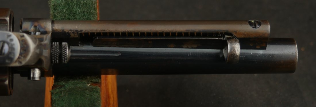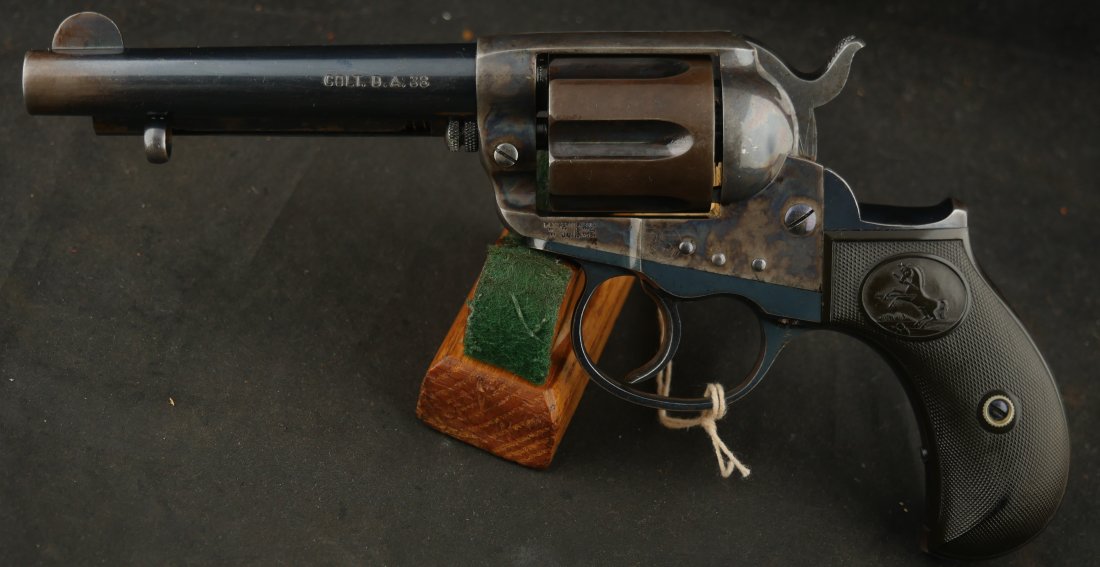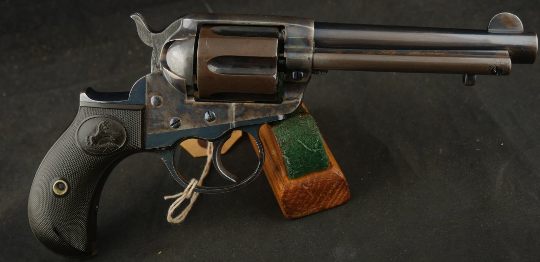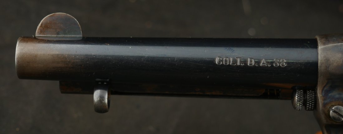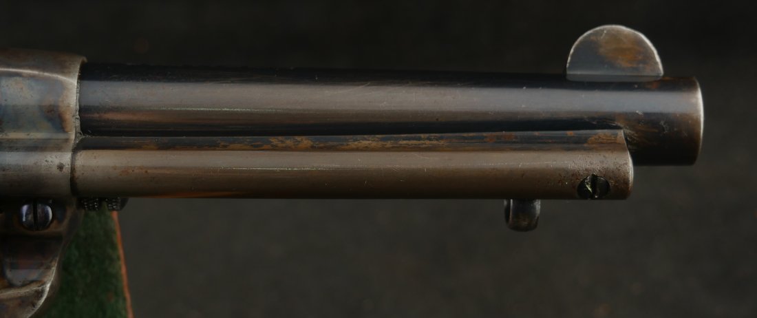 GR-0426-6904, Colt Model 1877 Lightning. .38 CF. 4 1/2 inch barrel. Serial number 105,xxx matches on the frame, guard, strap and back of cylinder. The gun retains about. It was made in 1897. 90% deep rich case color on the frame. The barrel, cylinder, trigger-guard and backstrap show about 80% deep blue mixing to brown, mostly on the cylinder. The gun has crisp tight mechanics in both DA and SA. Crisp checkered grips and brilliant nitre blue on screw heads and the hammer. The bore is bright, shiny and crisply rifled with a few fine spots. There is a half ring of very fine spots about an inch from the muzzle, I have been running my fingers along the outside of the barrel and on one side of the barrel (between the front sight and ejector housing) I can feel a very very slight bump in the barrel. Looking down the bore I see no visible bump in the bore, rifling is crisp with no indentation like I see when there is a bulge, but there are some very fine spots in a half ring pattern in about the spot where I feel the tiny bump on the outside of the bore. Most dealers would say nothing about this, most dealers would never notice, but I did so I have to say something. This is a beautiful gun, and a wonderful example.