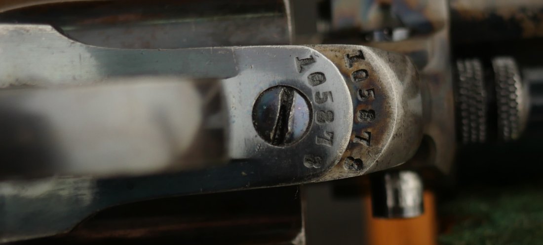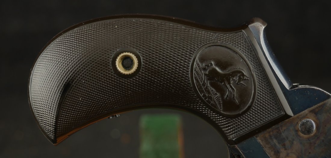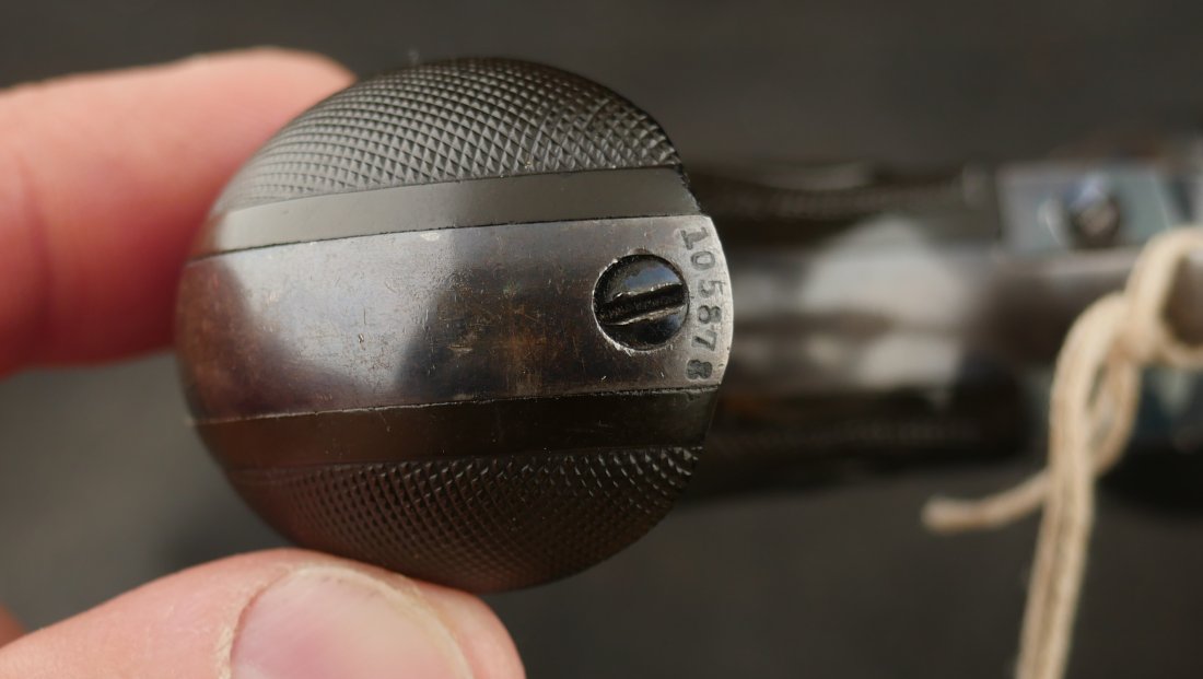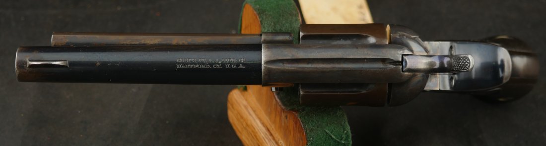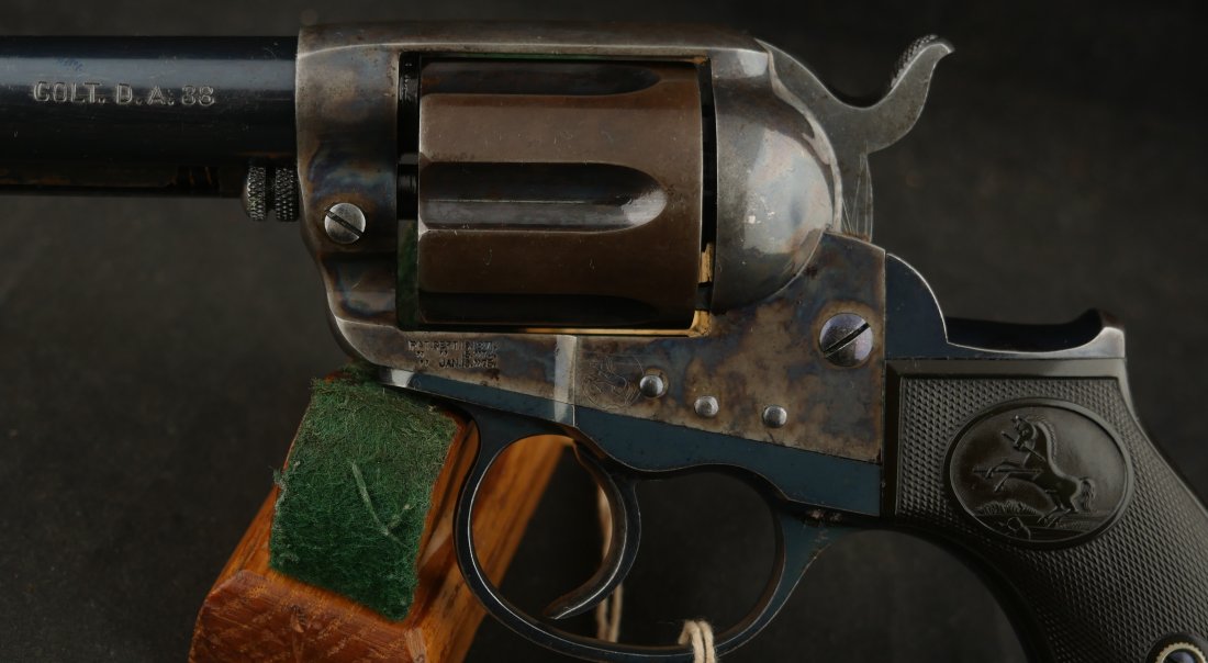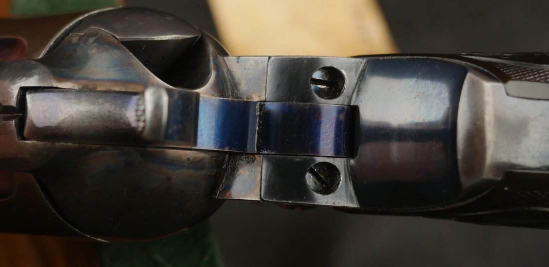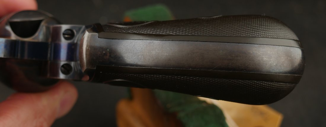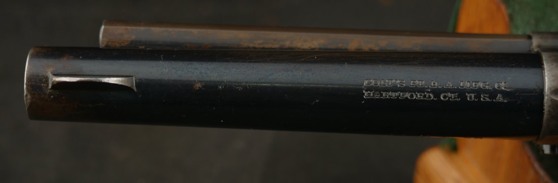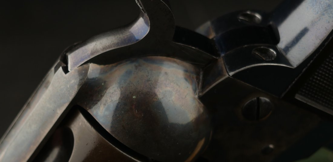 GR-0426-6904, Colt Model 1877 Lightning. .38 CF. 4 1/2 inch barrel. Serial number 105,xxx matches on the frame, guard, strap and back of cylinder. The gun retains about. It was made in 1897. 90% deep rich case color on the frame. The barrel, cylinder, trigger-guard and backstrap show about 80% deep blue mixing to brown, mostly on the cylinder. The gun has crisp tight mechanics in both DA and SA. Crisp checkered grips and brilliant nitre blue on screw heads and the hammer. The bore is bright, shiny and crisply rifled with a few fine spots. There is a half ring of very fine spots about an inch from the muzzle, I have been running my fingers along the outside of the barrel and on one side of the barrel (between the front sight and ejector housing) I can feel a very very slight bump in the barrel. Looking down the bore I see no visible bump in the bore, rifling is crisp with no indentation like I see when there is a bulge, but there are some very fine spots in a half ring pattern in about the spot where I feel the tiny bump on the outside of the bore. Most dealers would say nothing about this, most dealers would never notice, but I did so I have to say something. This is a beautiful gun, and a wonderful example.