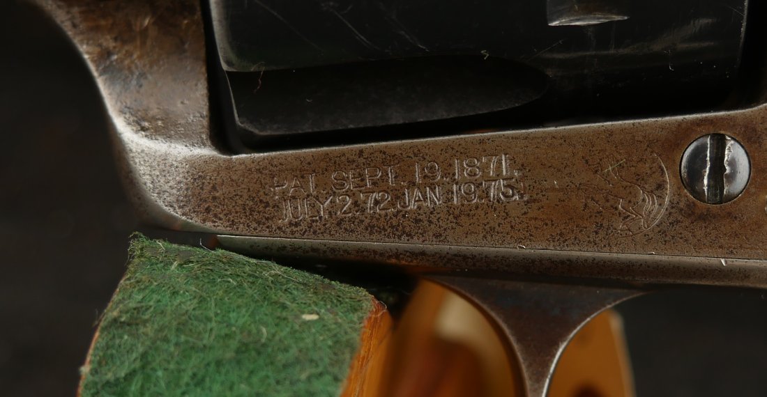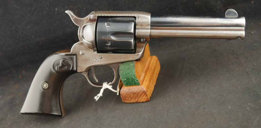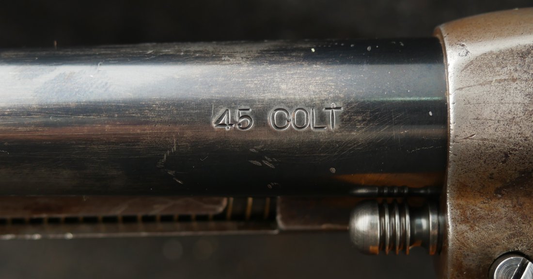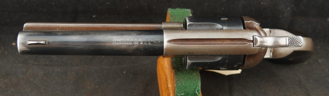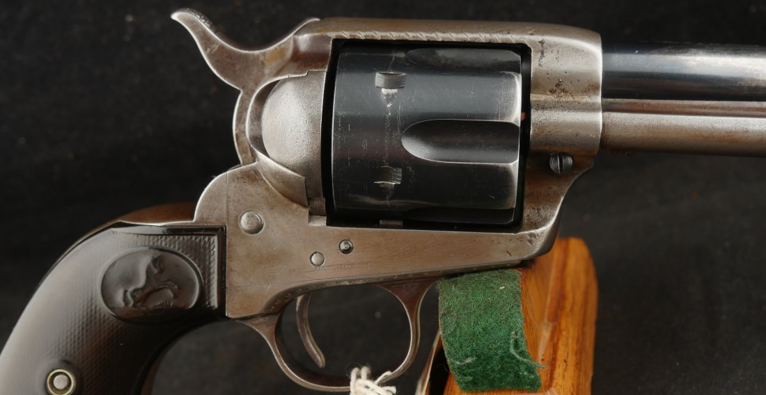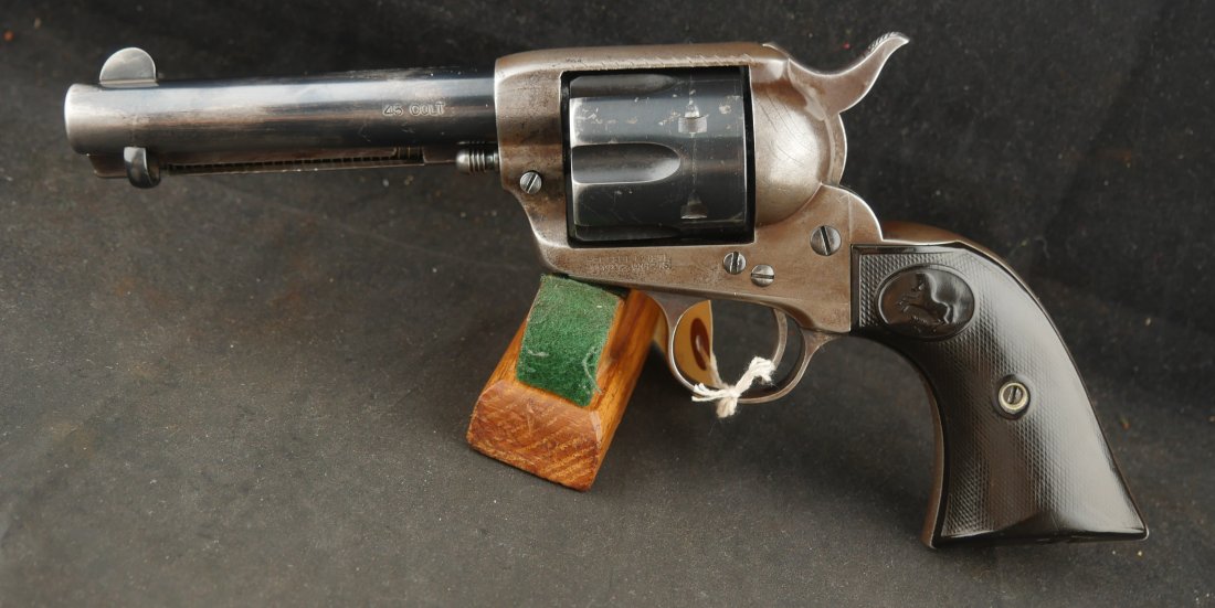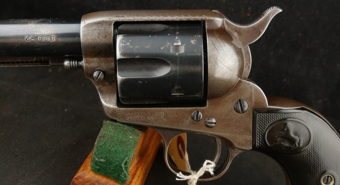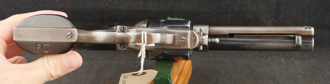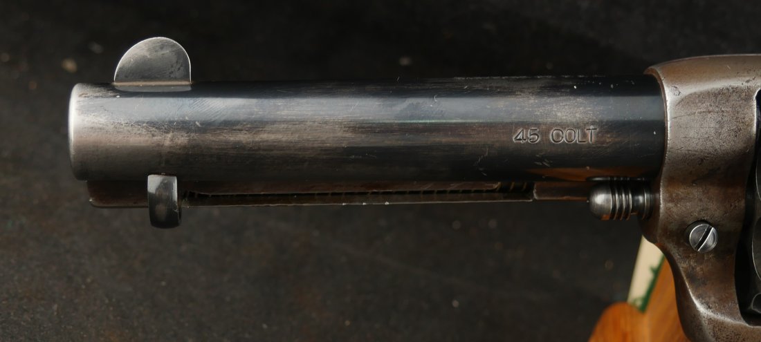 GR-0925-6638, Colt Model 1873 Single Action. .45. 4 3/4 inch barrel. The gun has a 2 line barrel address. Clear frame address. 4 clicks in the hammer with functional half and full cock. The barrel and the cylinder have had some re-blue rubbed onto them. The caliber markings looks like it has been helped, the grips show moderate wear to grips with some initials carved into the bottom of the grip. The bore is bright, shiny and crisply rifled. Excellent bore. Serial number #210xxx matching and made in 1901. Very good overall.