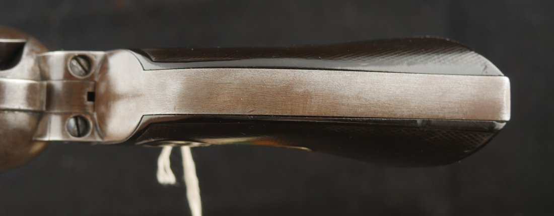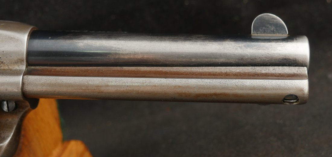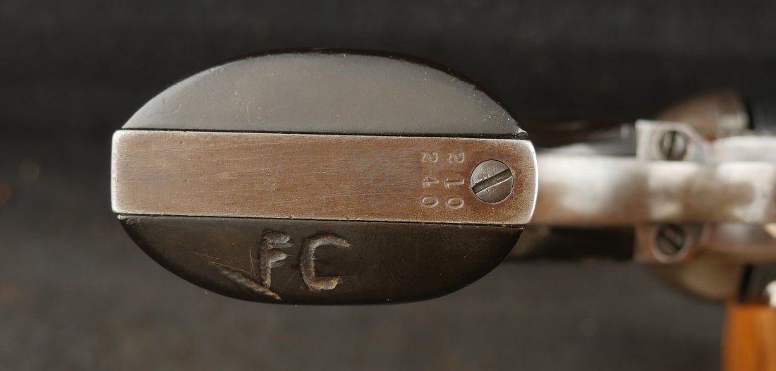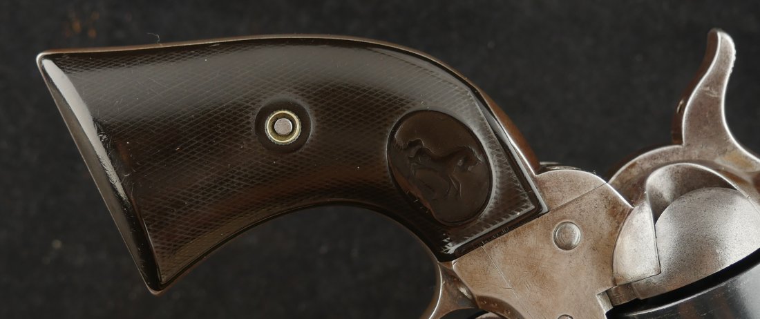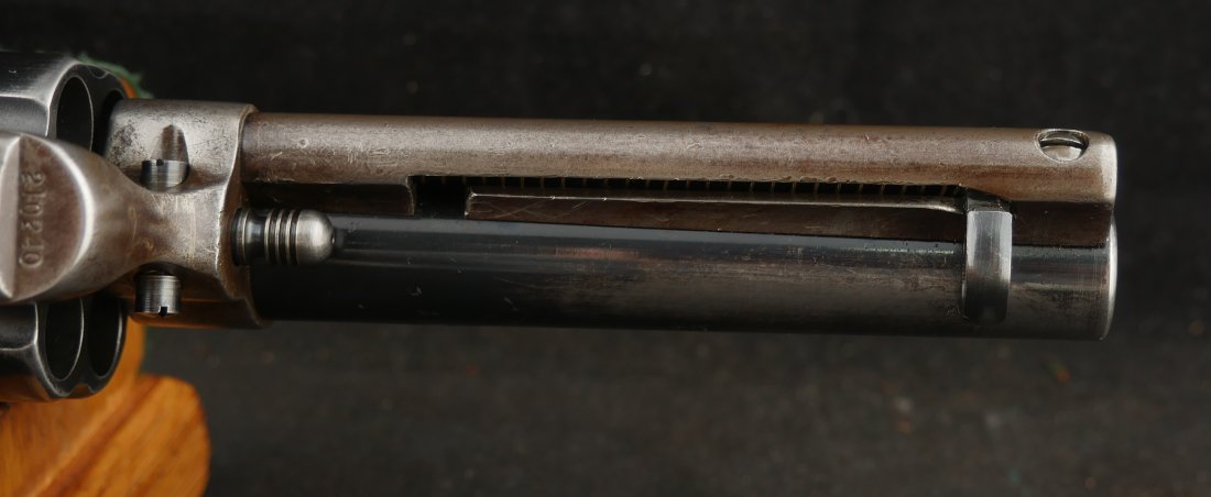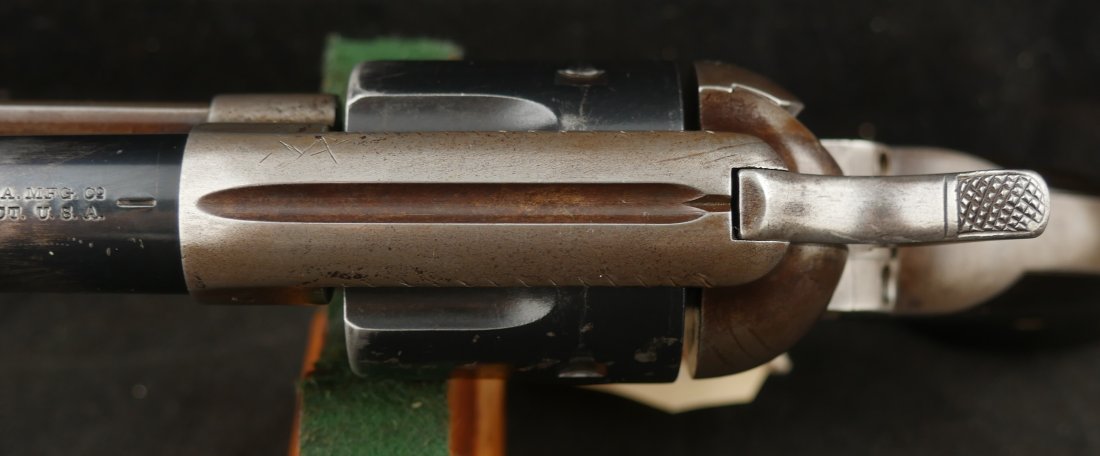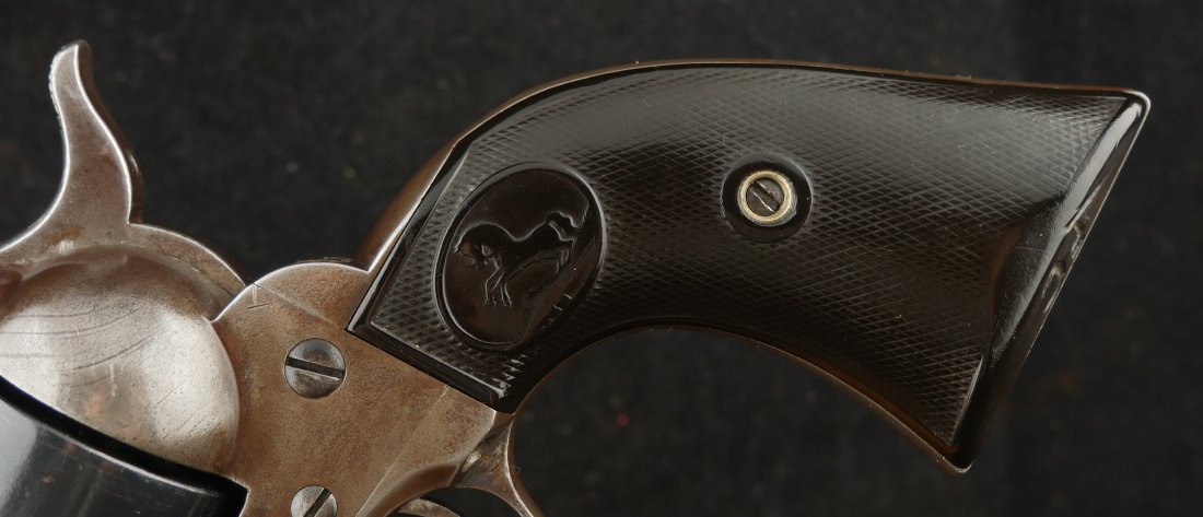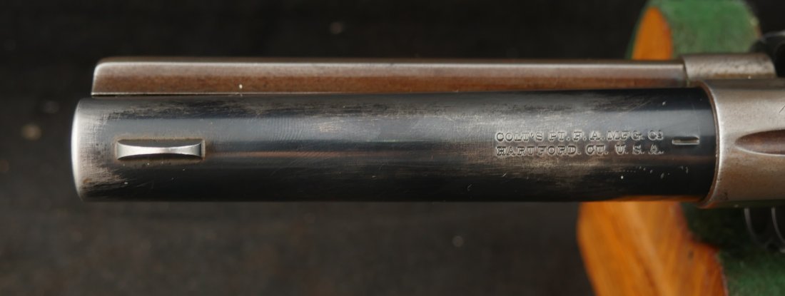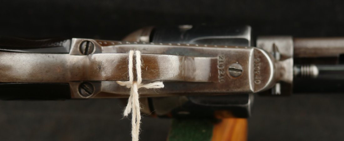 GR-0925-6638, Colt Model 1873 Single Action. .45. 4 3/4 inch barrel. The gun has a 2 line barrel address. Clear frame address. 4 clicks in the hammer with functional half and full cock. The barrel and the cylinder have had some re-blue rubbed onto them. The caliber markings looks like it has been helped, the grips show moderate wear to grips with some initials carved into the bottom of the grip. The bore is bright, shiny and crisply rifled. Excellent bore. Serial number #210xxx matching and made in 1901. Very good overall.
