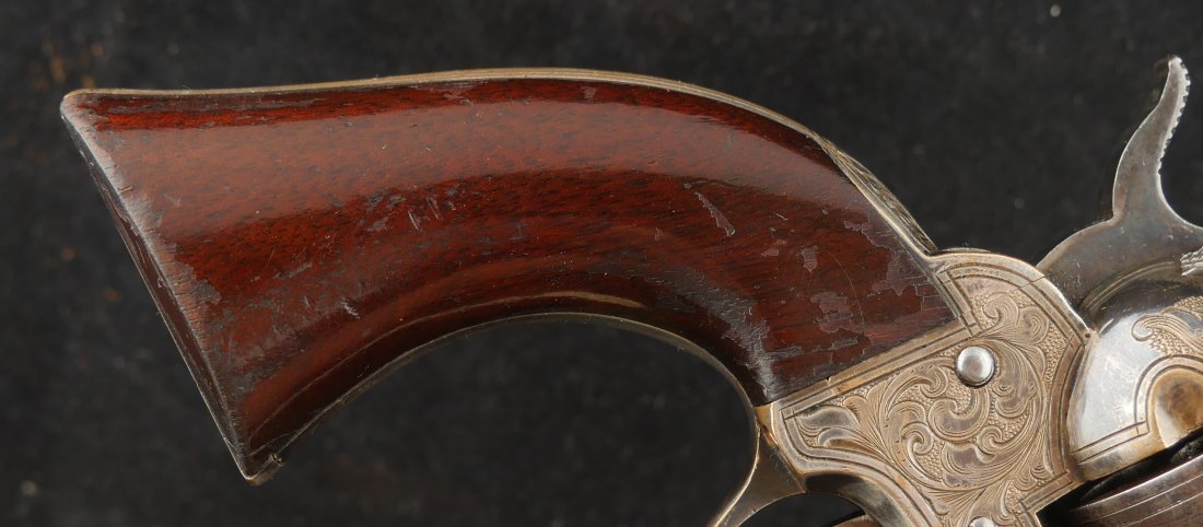 GR-0925-6653, Moore Belt Model Revolver. Smith & Wesson Barrel Address. 7 shot. Desirable and hard to find 6 inch barrel. Crisp tight mechanics. Bright, shiny bore, crisply rifled with a few patches of light residue. Very good bore. 75% Original blue on the barrel. 80% original silver on the frame. Excellent grips with 90% original varnish. Handsome gun.