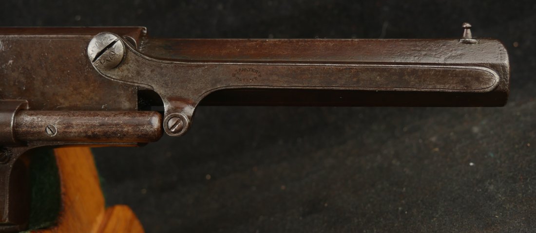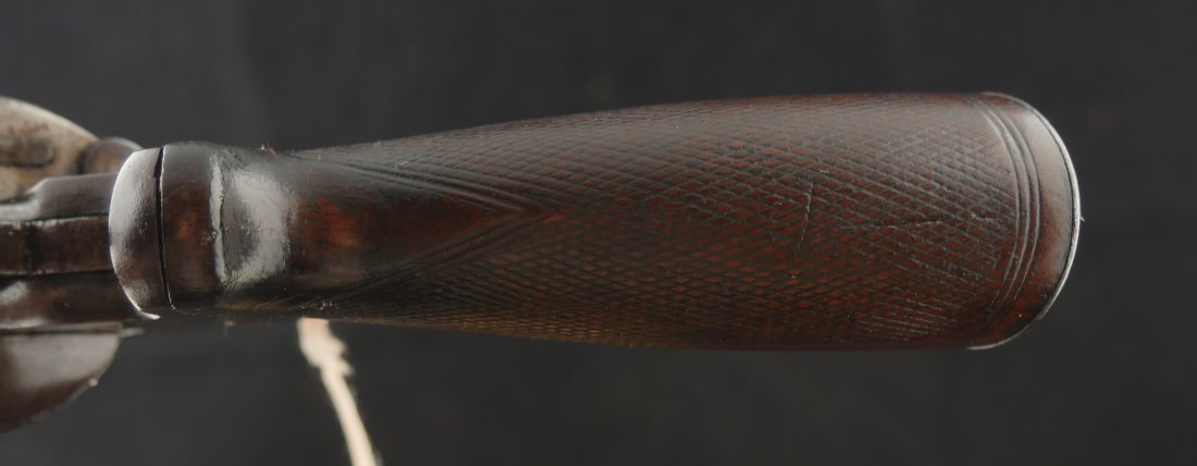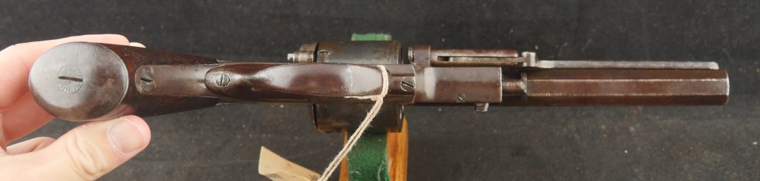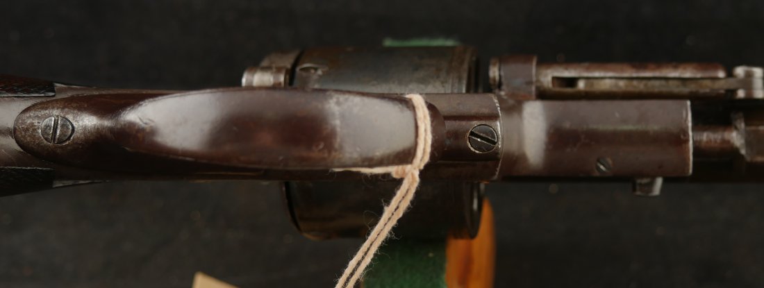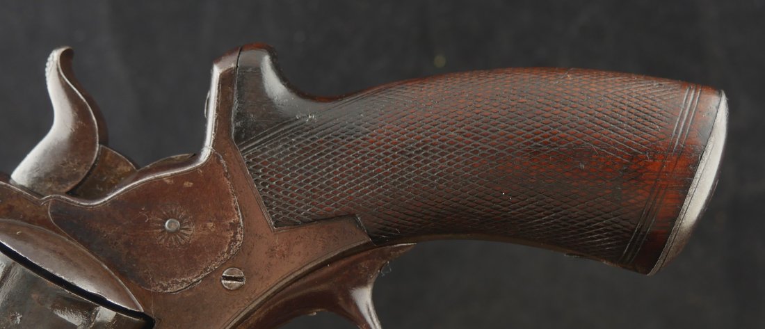 GR-0925-6676, English Tranter Model 1863 Double Action Revolver in 450 Cal. Crisp functional mechanics in both single and double action. Functional ejector. Bore is bright, shiny, crisply rifled with some very fine scattered spots. Very good ++ bore. Mostly brown gun with strong flashes of original blue finish, mostly in protected places. Very good checkered grips showing light bumps. Honest old used gun.