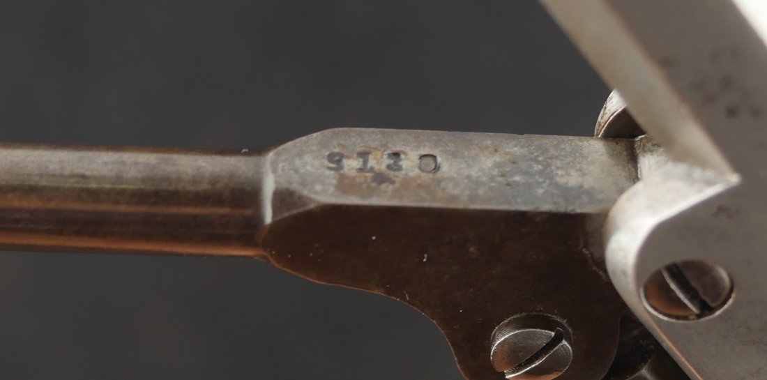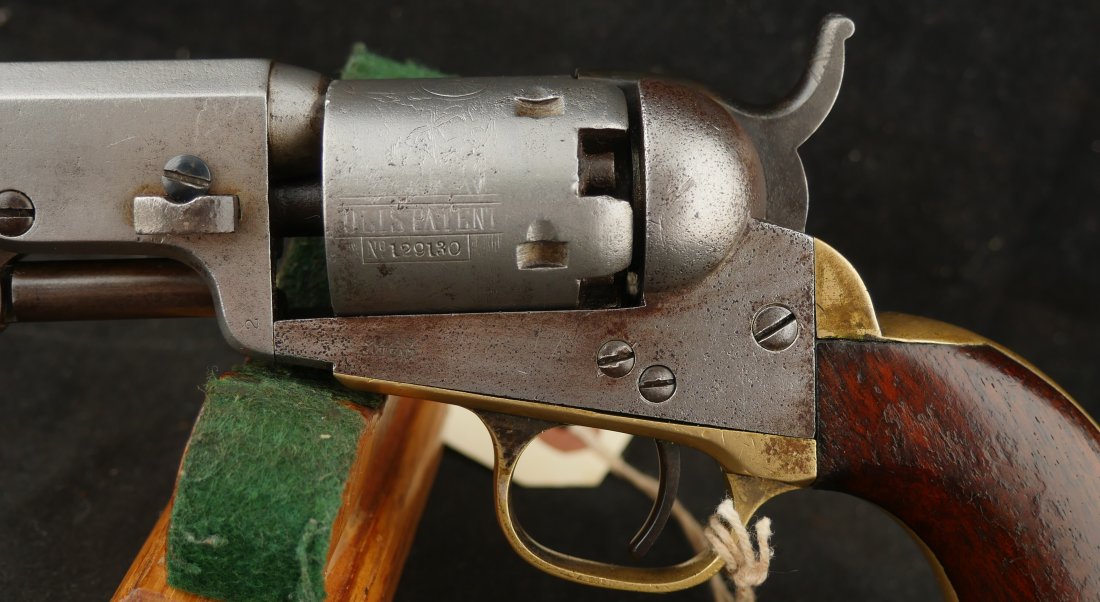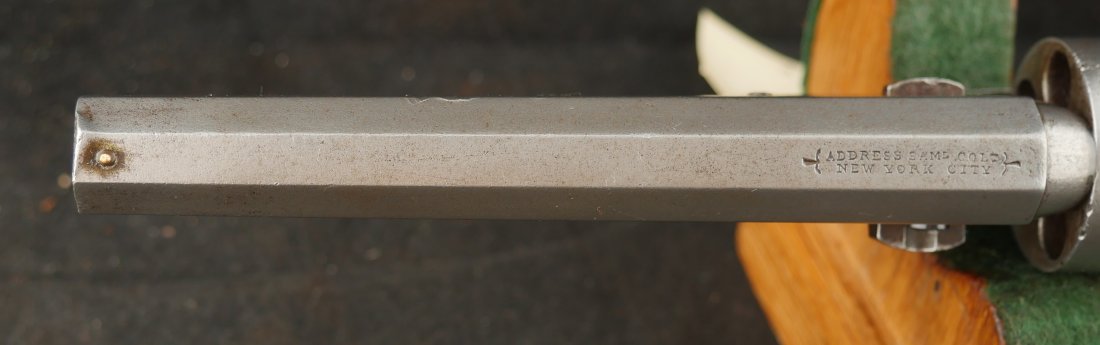 GR-1025-6628, Colt Model 1849 Pocket. 5 Inch barrel. .31 Percussion. 5 Shot. Serial number 129,xxx matching on the bottom of the gun, the cylinder, the lever and the wedge also matches. The gun was made in 1856. Correct 2 line NY barrel address. Crisp functional mechanics. Stampings are all crisp and clear. The cylinder has been lightly cleaned at some point with about 60% visible cylinder scene remaining. The edges show very light cleaning. The grips show 70% original varnish with light edges rub marks and rub marks on the wood grips. The bore is bright, shiny and crisply rifled. Fine condition bore. There is 5-10% original silver on the brass.