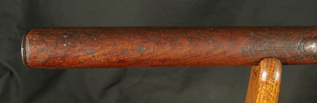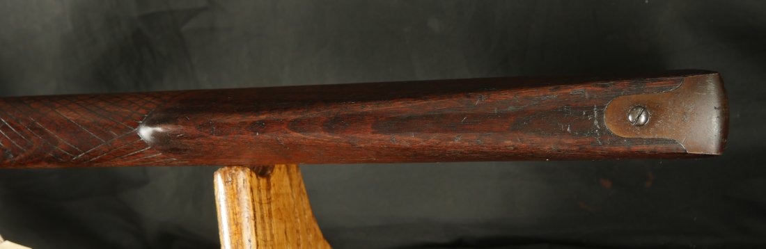 GR-1025-6651, Early Smith Carbine. Serial number 11,xxx matches on the frame and barrel. .50 percussion. The barrel retains about 85% original blue with streaks of faded blue that has patina’d. There is maybe 10% case color on the frame, most case color has faded or silvered. The wood stock has been checkered, it both looks and feels period to me. There is not cartouche on the stock but I see no subinspector marks on the metal either so gun was a Civilian or Militia gun. The wood to metal fit is excellent, wood does not to have ever been cleaned or sanded. The 2 wood screws on the bottom tang are replaced. The screw that acts as the barrel hinge is buggered up. There is a tiny bit of wiggle in the barrel, its a tight gun. Mechanics are functional. The bore is bright shiny and crisply rifled. There are a few fine spots near the muzzle, otherwise it is an excellent gun. Fine ++ bore with lots of life left.