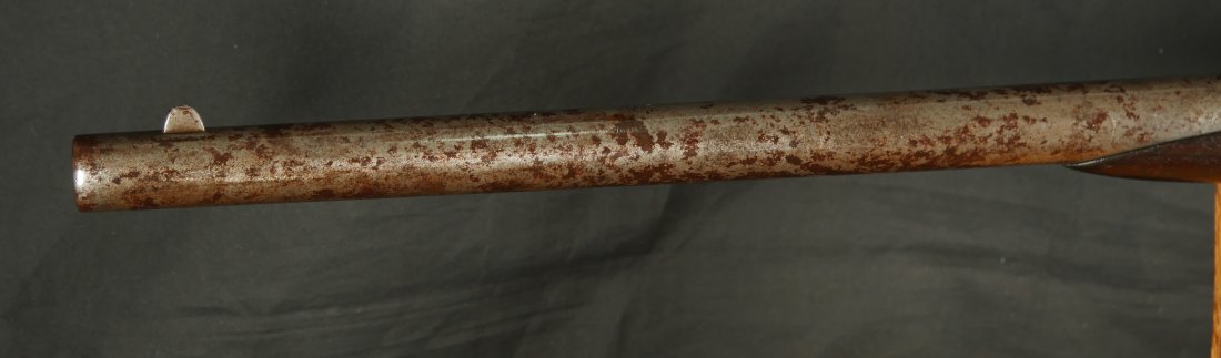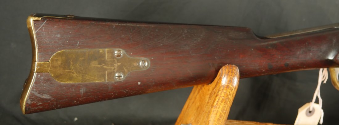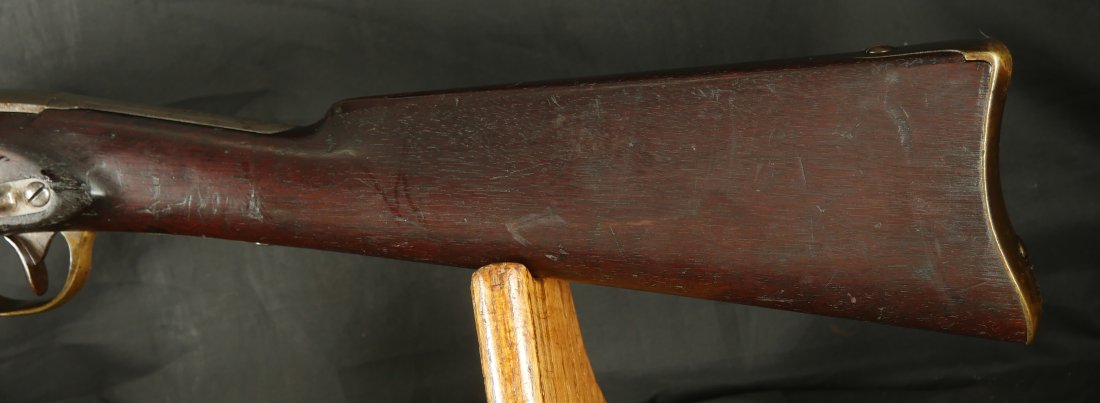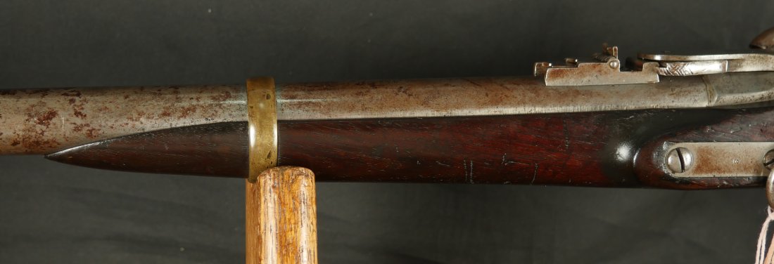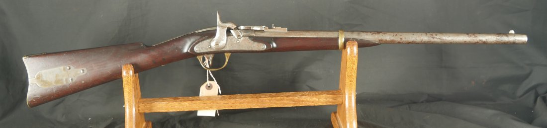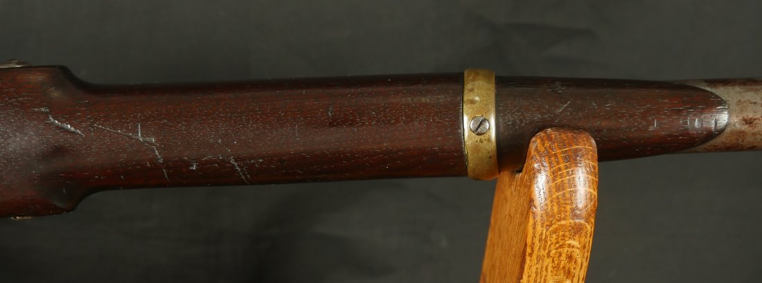 GR-1025-6655, Martial 1st Model Merril Saddle Ring Carbine. .54 Percussion. 22 ¼ inch correct barrel length. The gun has brass butt-plate, patch-box, trigger-guard and barrel band. There is an extra nipple in the patchbox. The brass on the gun is totally untouched and never cleaned. It take 100 + years for brass to be left alone and build up the dark patina look found on this gun. There are sub-inspector marks on metal parts and the outline on a worn cartouche above the saddle ring bar. Number 475x on the lock plate and number 476x on the plunger. Most of the early Merril carbines we have had over the years are mismatched. I do not know why. They are 11 numbers apart, I am certain the gun has been together as it is now since the time of service color and wear perfectly match and it would be near impossible to find 2 guns together years and years after the war in identical shape. Metal Markings are clear. Mechanics are functional. Bore is bright, shiny, crisply rifled with fine residue scattered about the bore. Very good bore as is and should clean better.
