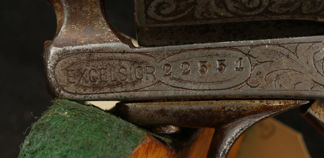 GR-1025-6660, Montenegrin Gasser revolver, Model 1869, double-action, six-shot cylinder, 11.3 mm caliber. Receiver and barrel chiseled with factory engraved floral motifs. Smooth bone grips that are slightly undersized and do not fit perfectly. Lanyard ring missing. Functional in both DA and SA . It shows moderate usage marks. The loading gate will fall open. The side of the frame, EXCELSIOR, #22XXX, that same number is on the cylinder. It is mostly gray with maybe 25% nickel finish. The bore is bright, shiny, crisply rifled with some residue near the muzzle. Very good bore. The barrel is 5 inches long. Very good overall.