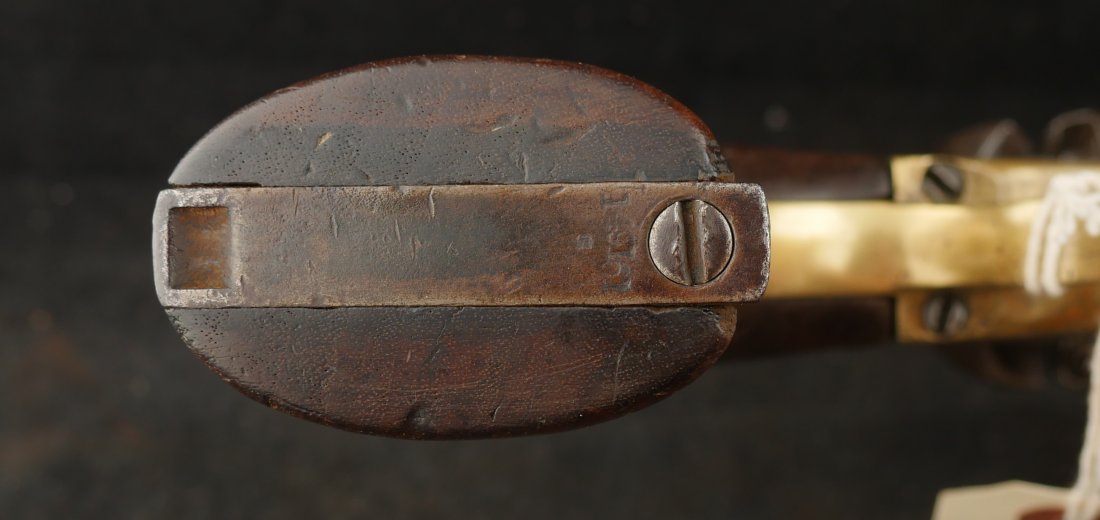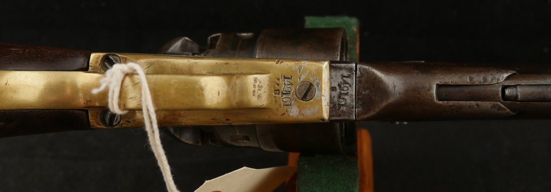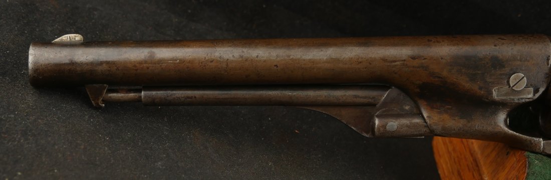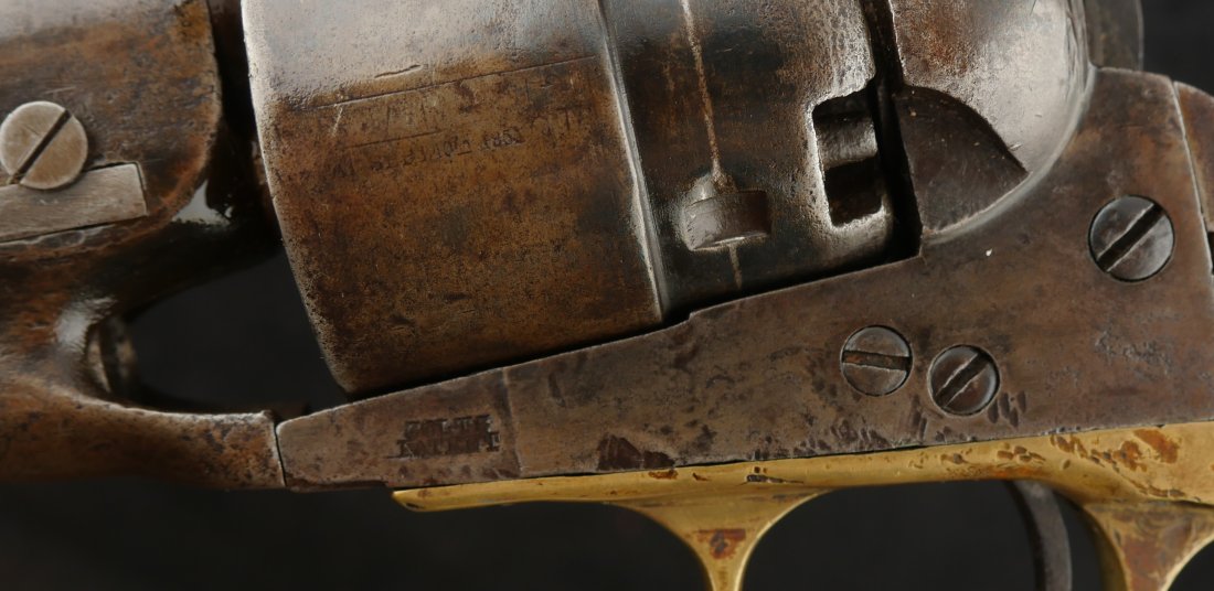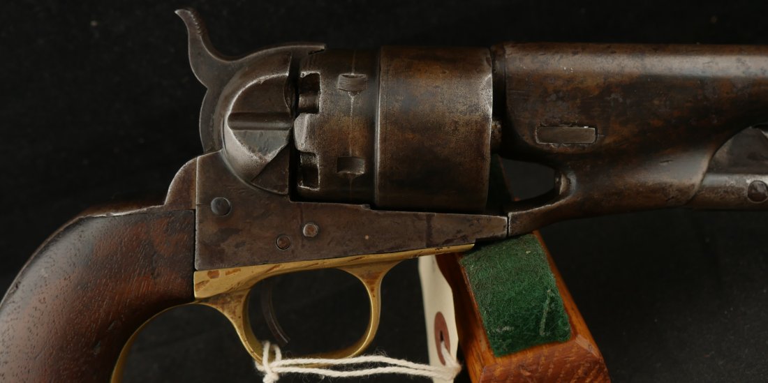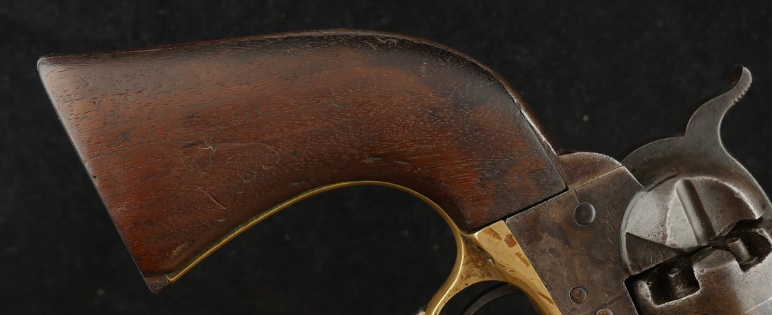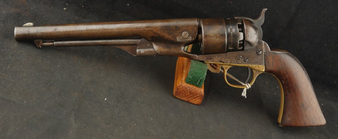 GR-1025-6664, Colt Model 1860 Army. .44 percussion. 6 Shot. 8 inch barrel. Serial number 149,xxx matches on the barrel, frame, guard, strap and cylinder. The number is weak on the cylinder but it does match. There are scattered bumps and dings on the metal surfaces. The gun has had a touchup of brown color overall. There are traces of cylinder scene. The wedge is replaced. There is light cleaning to the grips. The bore is bright, crisply rifled with fine residue the length of the bore. Very good bore as is and may clean better. The mechanics are functional with 3 clicks but the clicks feel a little mushy, not really crisp clicks. Cylinder locks up as it should. One of the nipples is broken. There are traces of cylinder on the trigger guard. The gun was made in 1863. Very good overall.
