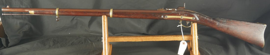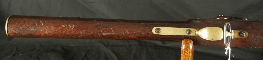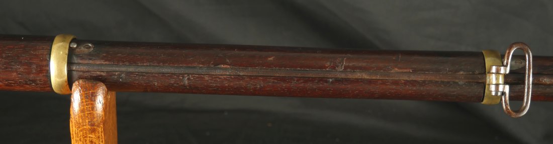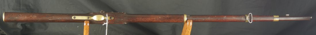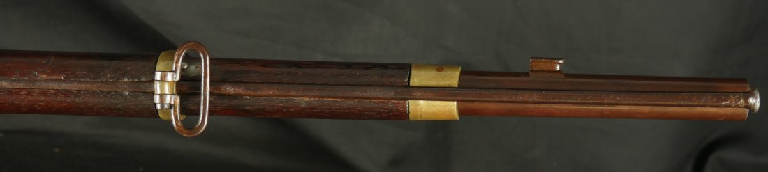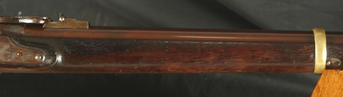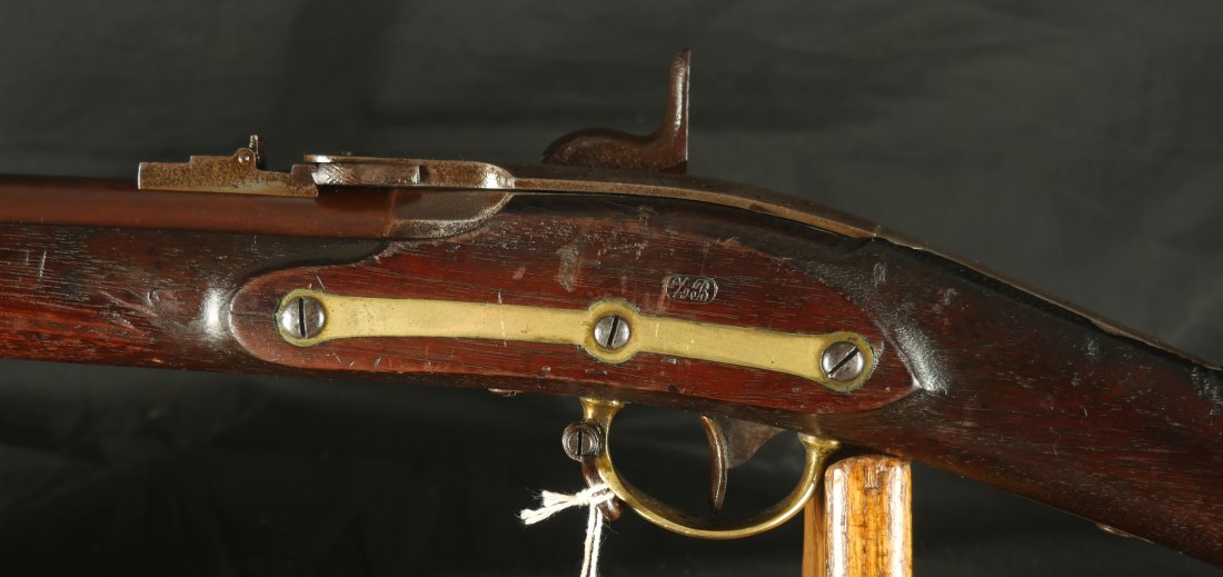 GR-1025-6677, Rare Merril Rifle. .54 Percussion. 33 inch barrel. Serial number 86xx matches on the lock and load lever. The gun is completely correct as configured, with also a bayonet lug, brass furniture and patchbox. This is an early production gun, there was a later batch of rifles made above serial number 14,000. The barrel retains about 85% original brown finish. The lock has about 50% original bright case color. The wood is in fine condition, showing honest use marks but no evidence of abuse and an excellent crisp and clear cartouche on the left side of the stock. There is bright case color all over the inside of the load lever apparatus. There are fine pinpricks on the tops of the load lever and a little on the back end of the barrel from black powder splash. This makes the stamp on the top of the load lever hard to read but is simply evidence of having been used. The mechanics are crisp and tight. The bore is bright, shiny, crisply rifled with some fine scattered pinpricks near the muzzle of the bore but still a very good bore. 770 Merril rifles were purchased by the US government during the Civil War and only about 800 were made. This is a very difficult gun to find, I have only seen a few over the years and this is really a nice example. Oftentimes the stocks are broken on these guns, they were prone to that. This is a Civil War Long Arm that escapes many collectors because of how hard it is to find. Not only are you getting a hard to find gun but it really is a nice, fine untouched condition and certainly carried during the Civil War.