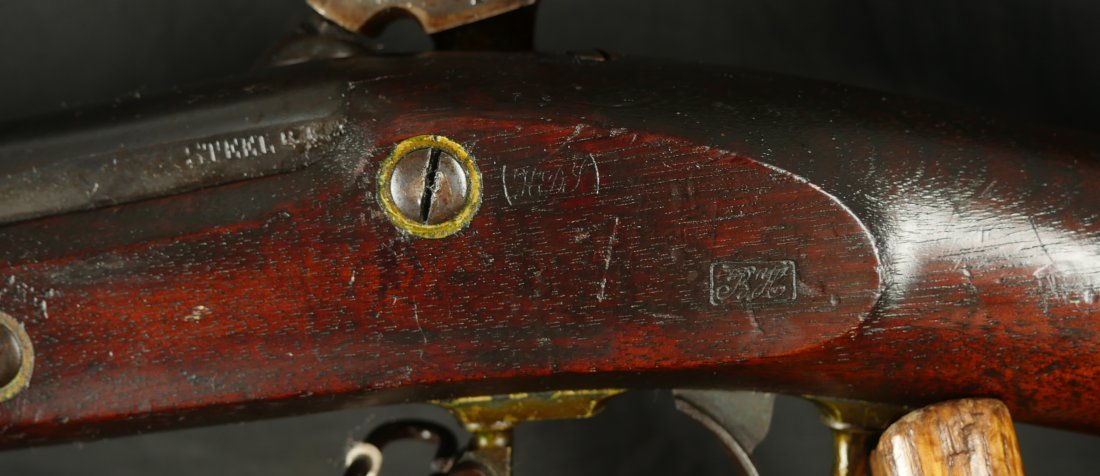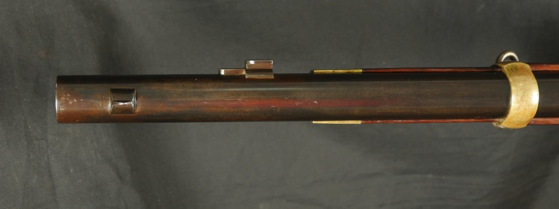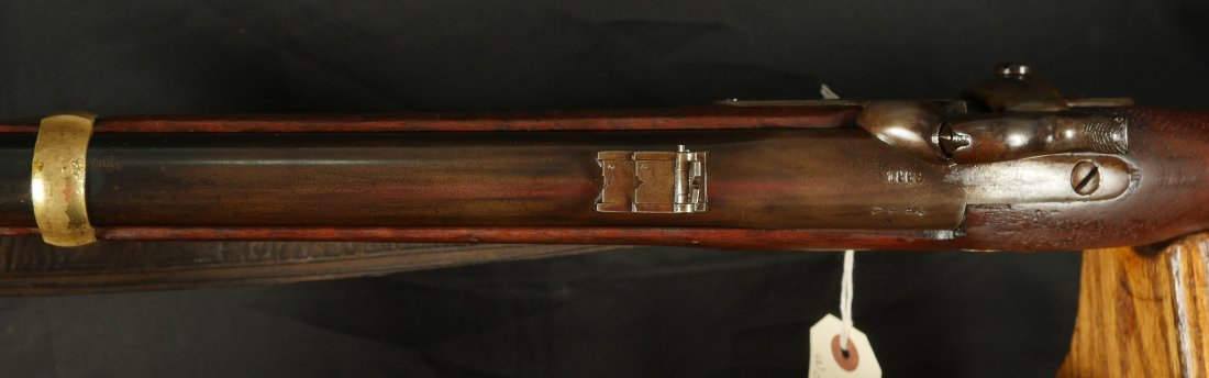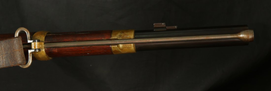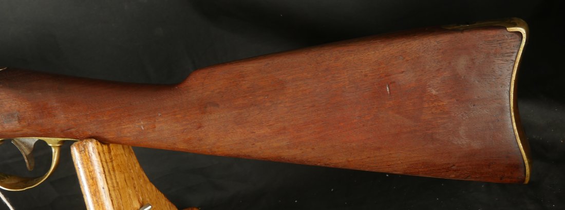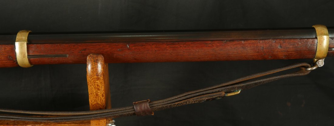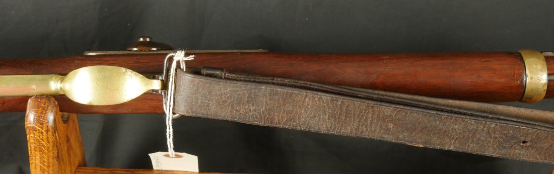 GR-1025-6678, Remington Zouave. .58 percussion. 33 inch barrel. The barrel retains about 40% original blue finish. Only traces of case color on the lock. The wood was very lightly cleaned at some point. The cartouches are still visible but not as crisp as a gun that has never seen cleaning. There are some extra nipples in the patch-box along with a tip for the cleaning rod. I believe the strap is original. Functional mechanics. The bore is mostly bright and shiny with crisp rifling but near the breech end of the bore there is some crud and residue. That starts about 10 inches from the breech end. We will try and clean the bore and see if we can get it better. The shoulder strap appears to be original. Very good overall.
