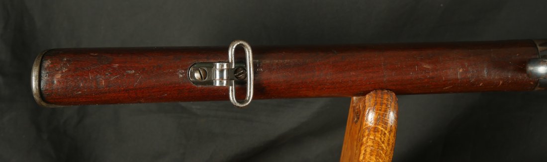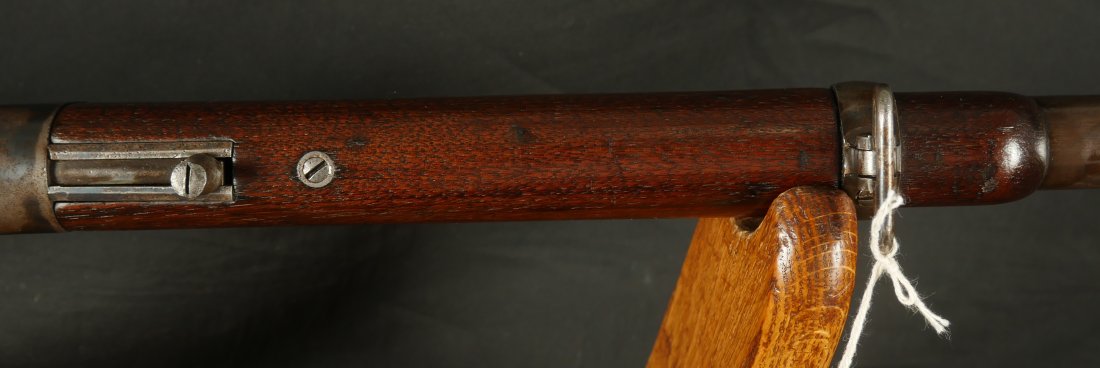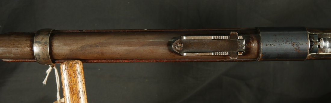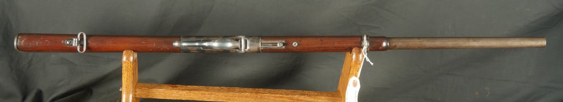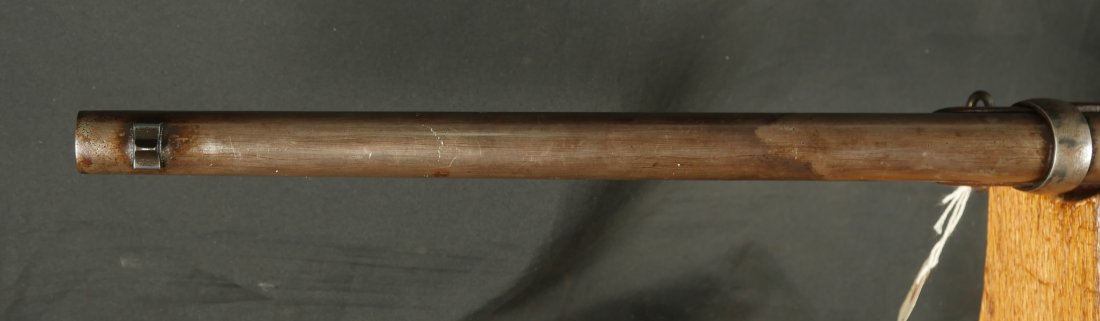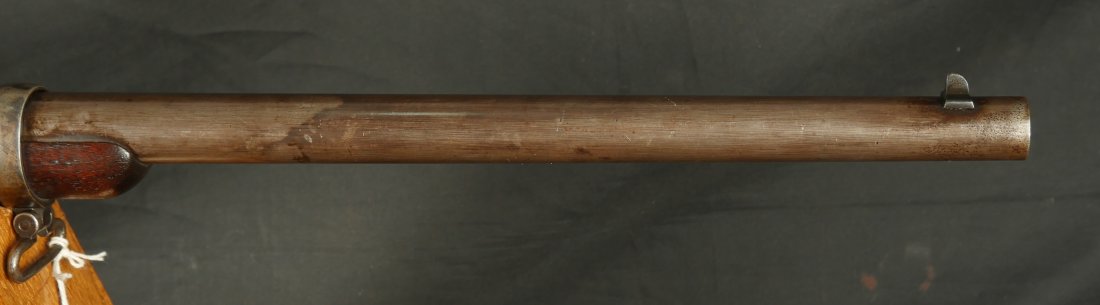 GR-1025-6680, Merrimack Arms & Manufacturing Co. Ballard Carbine. Dual Percussion / Cartridge System. 44 RF or 44 Percussion. The nipple for the percussion cap sits under the tip of the hammer, about half way down the base of the hammer. Serial number 18,xxx matches on the frame and barrel. The gun was made 1867-1869. It is estimated under 200 carbines were made, 70 of which were sold to the state of New York for prison guard use at the Sing Sing Prison Dec. of 1869. Marked “No 44” on the top of the frame. There is a high probability that this was a gun sold to New York State. Correct 22 Inch Barrel. The barrel is mottled brown mixing to blue. The markings are visible and legible on the frame. The blue on the frame is original, it is thicker and deeper blue than I am used to seeing on Ballard Carbines but it is a later gun made for the Civilian Market so it would make sense that it is a heavier blue. The frame and lever retain about 50% original blue. There are some very very fine scattered pinpricks and light residue on the frame, but there is no blue in the pinpricks. The stocks show scattered bumps and dings. The bore is excellent. Fine overall. Condition.
