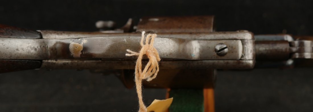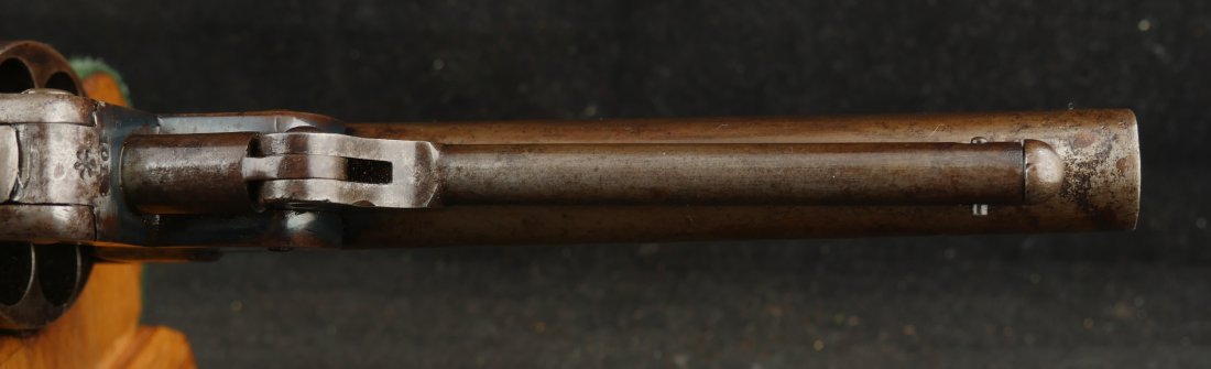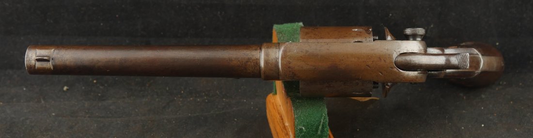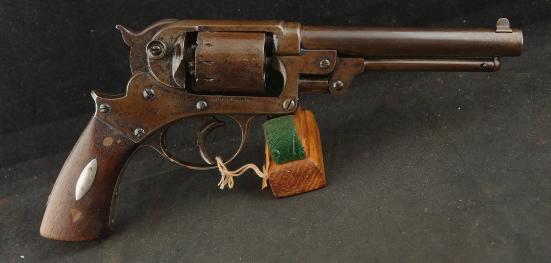 GR-1025-6693, Starr Model 1858 Double Action Army. .44 Percussion. 6 shot. 6 inch barrel. Serial number 10xx matches on the frame, barrel and cylinder. The gun is mostly covered in a mottled brown patina with strong flashes of blue in protected places. The action is very nice, it is crisp and tight in both DA and SA and the switch on the trigger is even working to switch from DA to SA. The grips have been altered with a silhouette in German Silver on the bottom of the grip. Some other decorations have been added to the grip, some have fallen out. The bore is bright, shiny and crisply rifled with a few tiny patches of light residue. Fine condition bore. Very good overall.