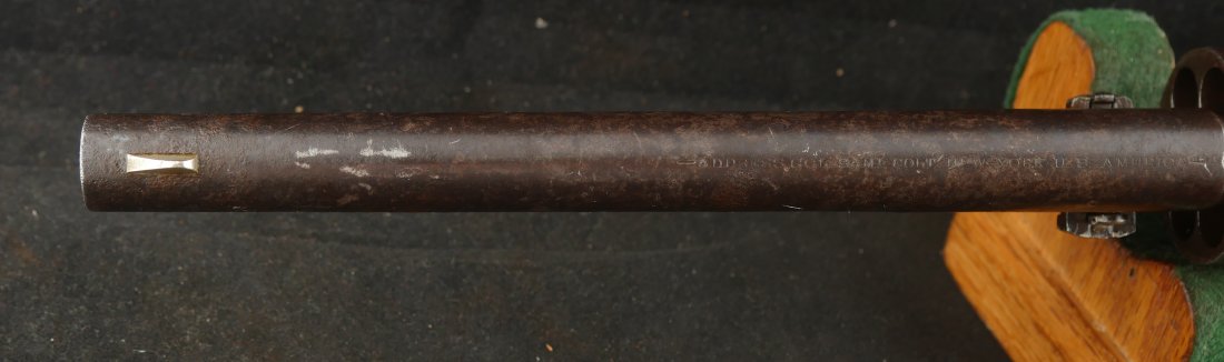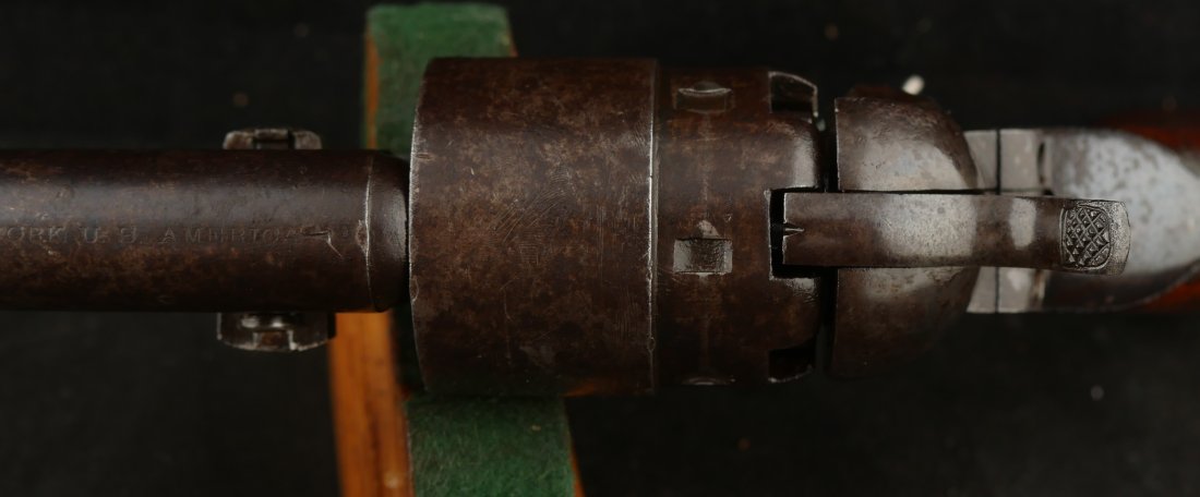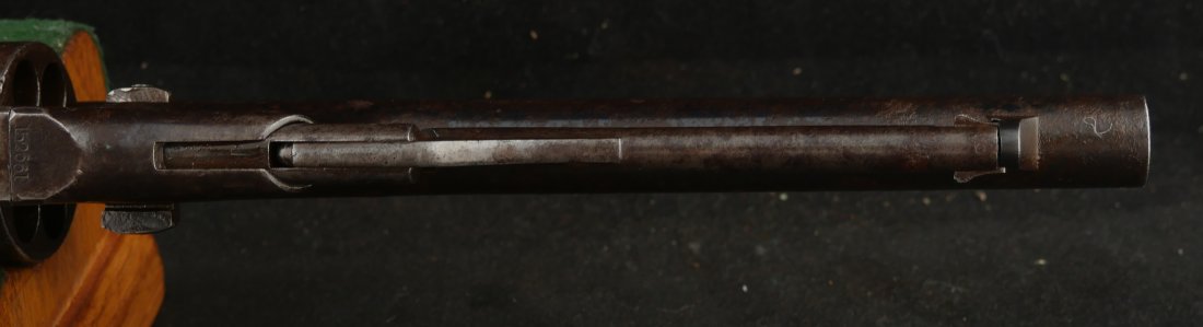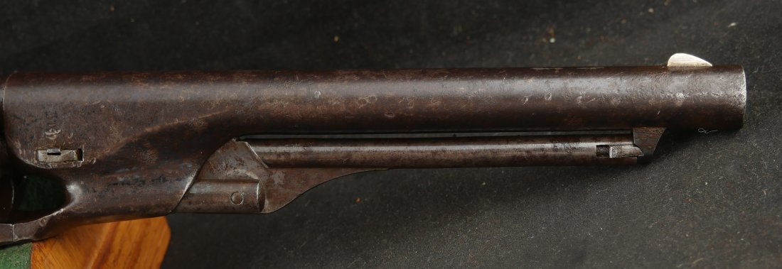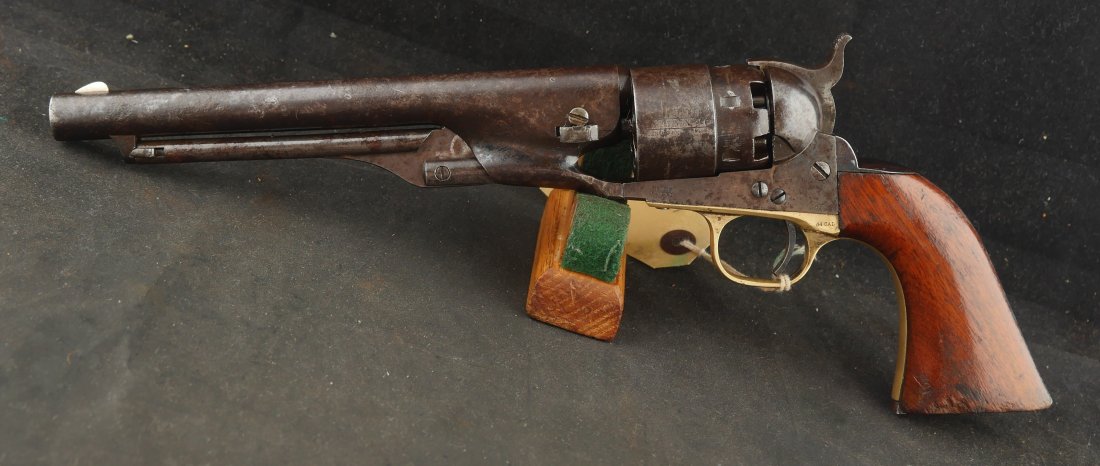 GR-1025-6697, Civilian Colt Model 1860 Army. .44 percussion. 6 Shot. Serial number 152,xxx matches on the barrel, frame, guard, cylinder, strap, wedge and cylinder pin. The gun retains about 15%-20% original blue finish on the barrel, strap and cylinder. There is about 25% original light case color on the frame and lever with some bright case color in several spots. There are just traces of original finish on the guard. The grips retain about 85% original varnish on the grips. Grips show evidence of honest use. The gun has patches of heavy residue on all iron parts. The cylinder scene is excellent with 90% + scene with light patches of residue on the cylinder. The gun was made in 1864. The bore is bright, shiny and crisply rifled with a lot of original blue still in the bore. There is some very light residue near the muzzle. Excellent bore.