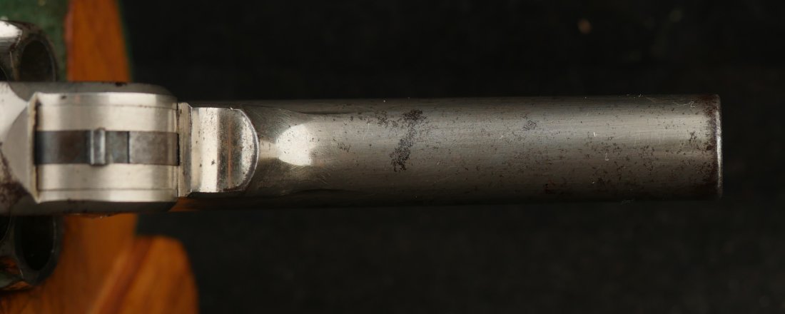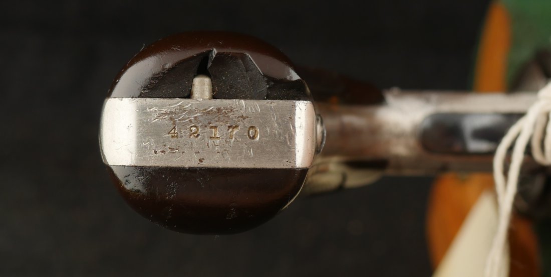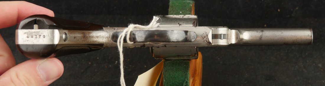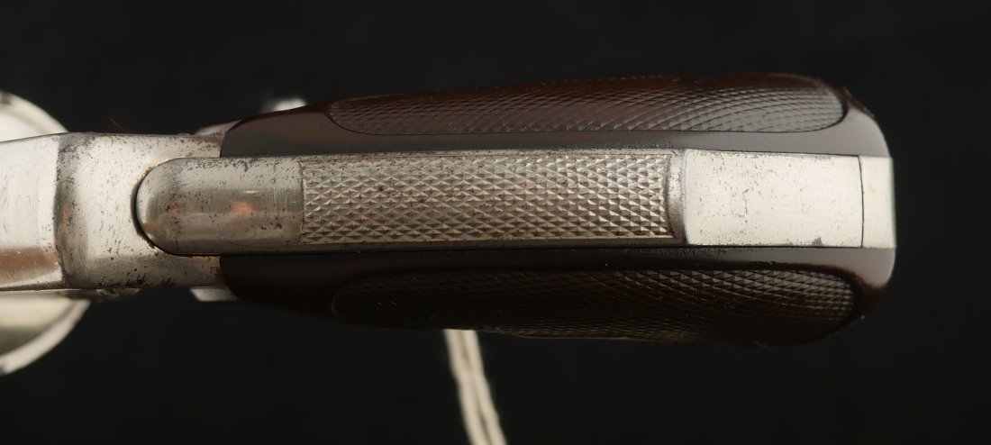 GR-1025-6700, Early Smith & Wesson .38 Safety Hammerless. .38 S&W. Serial number 42xxx matches on the frame, barrel and cylinder. 90% original nickel finish. 80% bright nitre blue on the trigger-guard. Checkering on the grips is fine but there is a chip on the bottom of the right grip. Crisp tight mechanics. Bore is bright, shiny, crisply rifled with fine scattered spots. Very good bore.