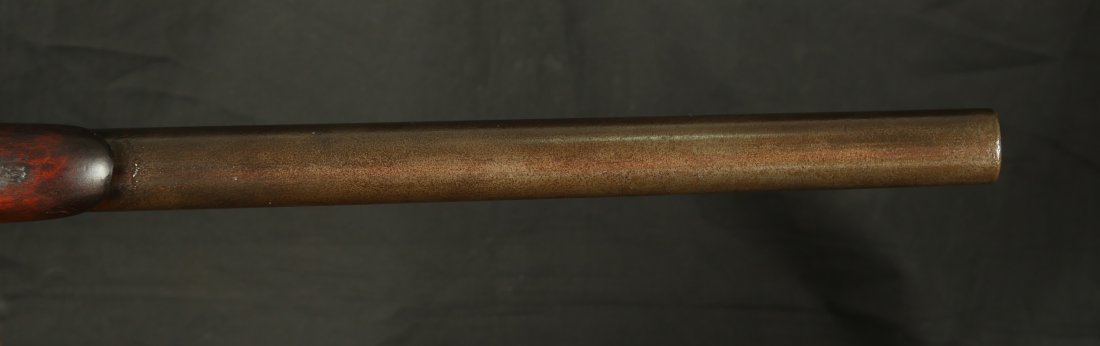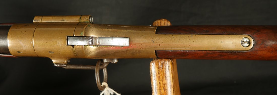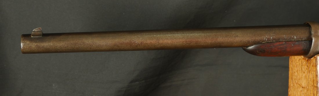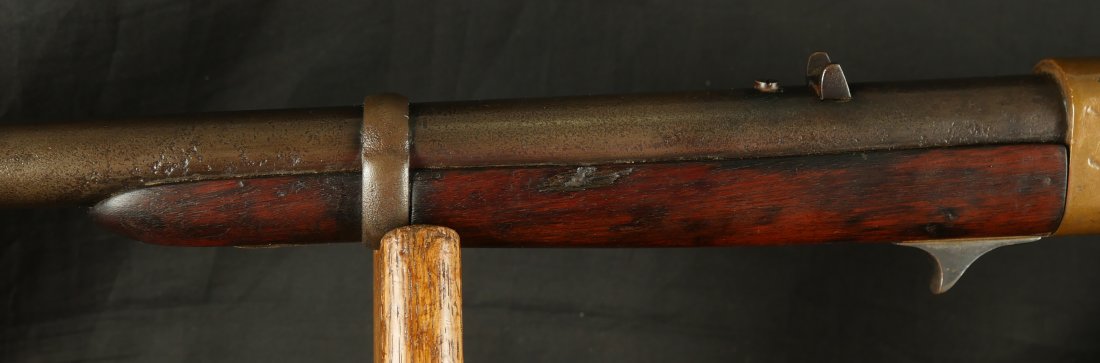 GR-1025-6713, Warner Saddle Ring Carbine. 1st Contract. Brass frame. Single Shot .50 RF. cal. Serial number 4XX matches on the frame and breech-block. 20 inch barrel. This is an early gun, made for the 1st US government contract. The first contract guns were made by Warner’s Springfield Arms Company. The frame shows partially visible frame patent address with 1864 patent date visible. The mechanics, including the ejector are functional. The barrel is gray / brown and has scattered fine pits. The rear sight is missing the upright portion. The wood has all been lightly cleaned and is slightly undersized to the metal in several places. In 15 months between 1864 and 1865 there were over 4000 Warner Carbines delivered to the US Armed forces, it was clearly a quality firearm. Most guns from the first contract, like this gun, were returned to Warner to be converted to .50 Spencer. I am not sure how to determine if this gun is a .50 Warner or a .50 Spencer. The bore is bright, shiny, crisply rifled with fine spots the length of the bore.
