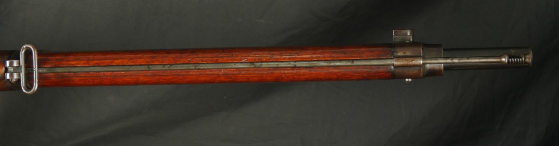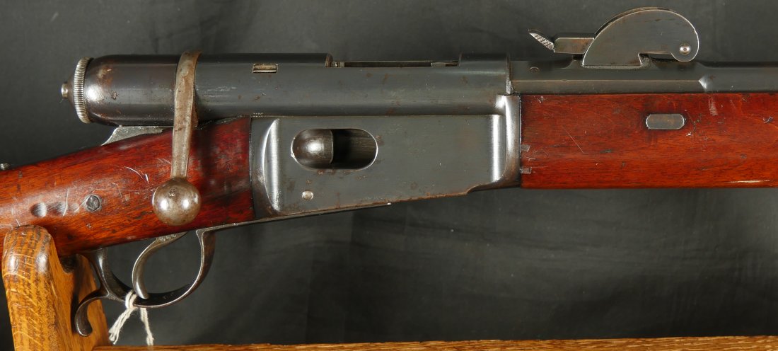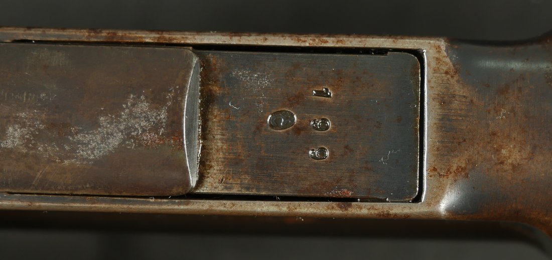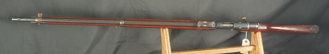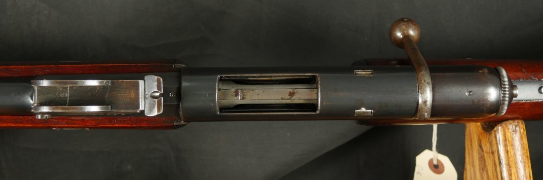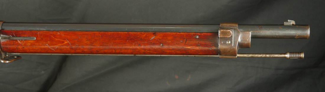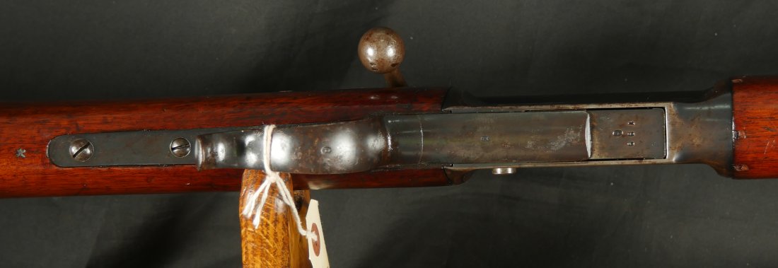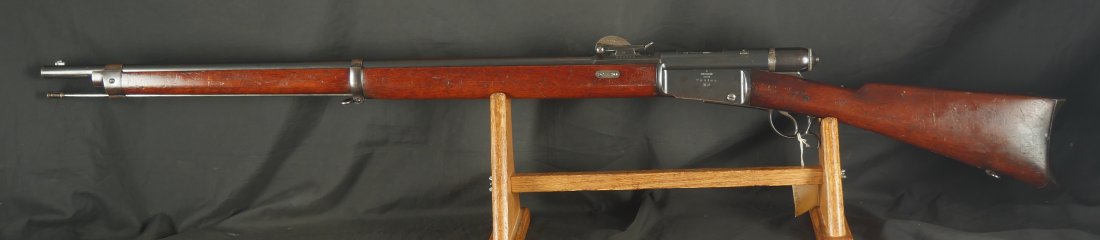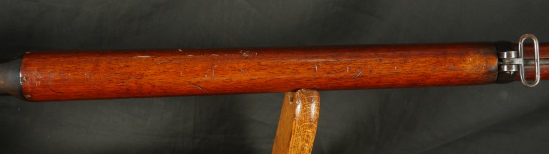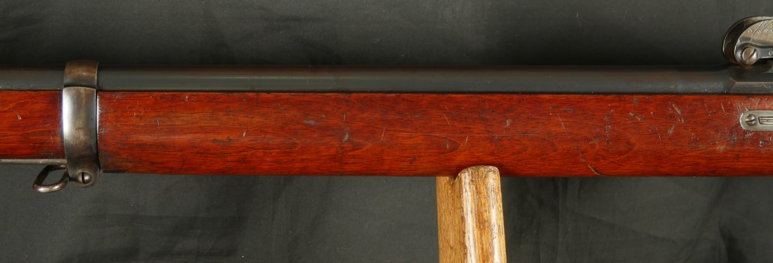 GR-1125-6685, Swiss Vetterli Model 1871 Bolt Action Military Rifle in 10.4 X 38MM Swiss Rimfire. These rifles have an 11 round tubular magazine. They were used by the Swiss and Italian Militaries. The bolt was a novel type of improvement and this was the first repeating bolt-action to feature a self-cocking action. The rifle is marked, WAFFENFABRIK, BERN, #209XXX, M.81. The gun shows 90% + deep blue overall with all original parts. The stocks are original with moderate bumps, dings and use marks. There are crisp clear cartouches on the top and right side of the stock. Excellent bore. Crisp tight mechanics. Excellent overall condition.