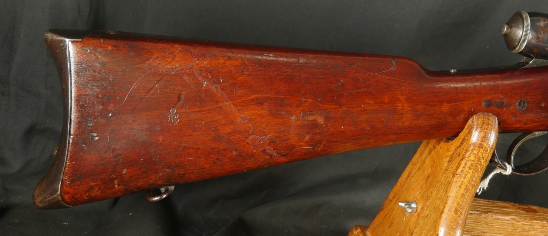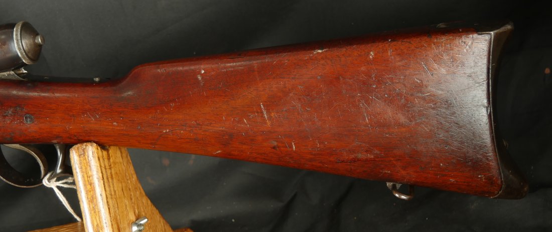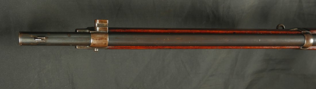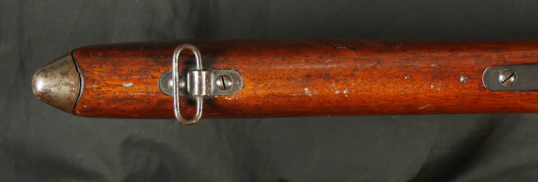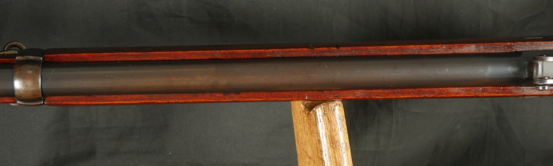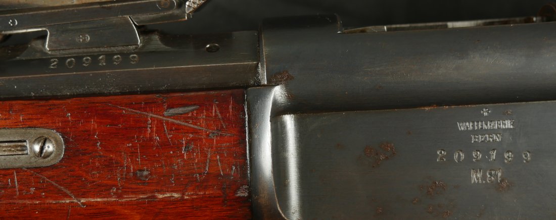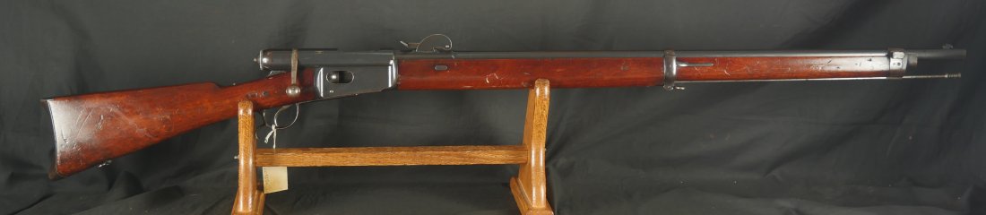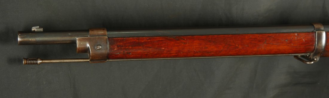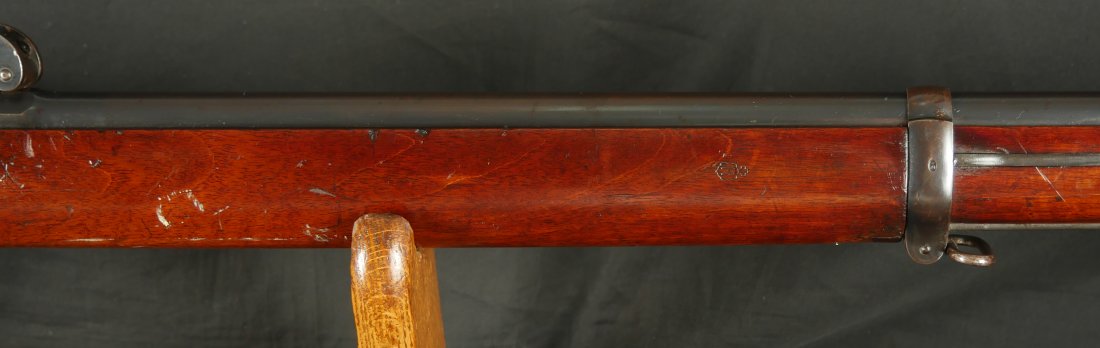GR-1125-6685, Swiss Vetterli Model 1871 Bolt Action Military Rifle in 10.4 X 38MM Swiss Rimfire. These rifles have an 11 round tubular magazine. They were used by the Swiss and Italian Militaries. The bolt was a novel type of improvement and this was the first repeating bolt-action to feature a self-cocking action. The rifle is marked, WAFFENFABRIK, BERN, #209XXX, M.81. The gun shows 90% + deep blue overall with all original parts. The stocks are original with moderate bumps, dings and use marks. There are crisp clear cartouches on the top and right side of the stock. Excellent bore. Crisp tight mechanics. Excellent overall condition.