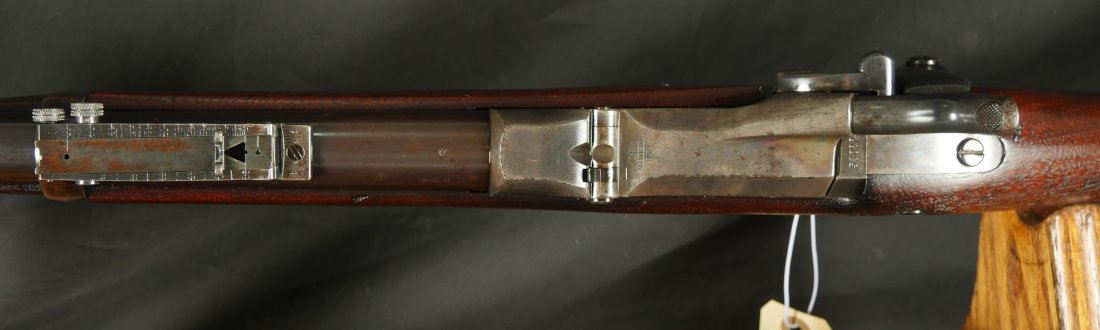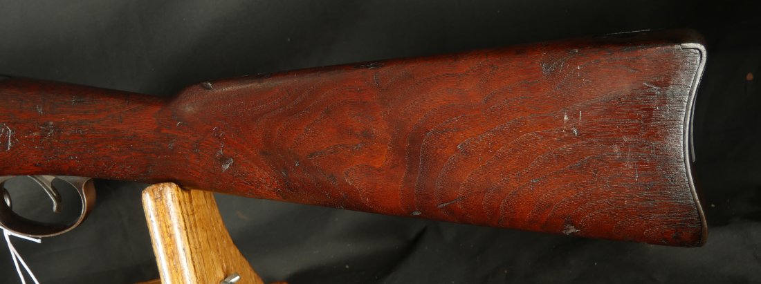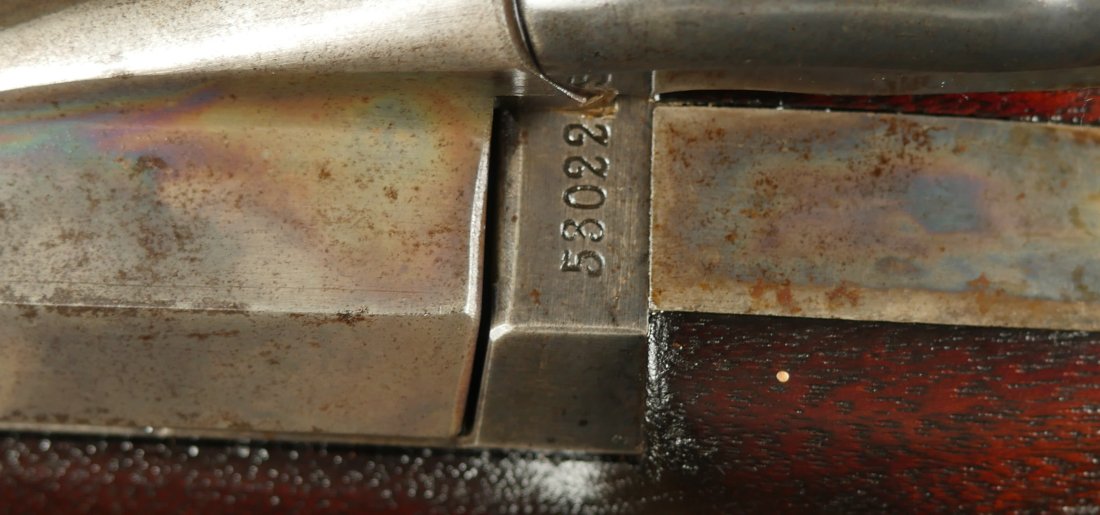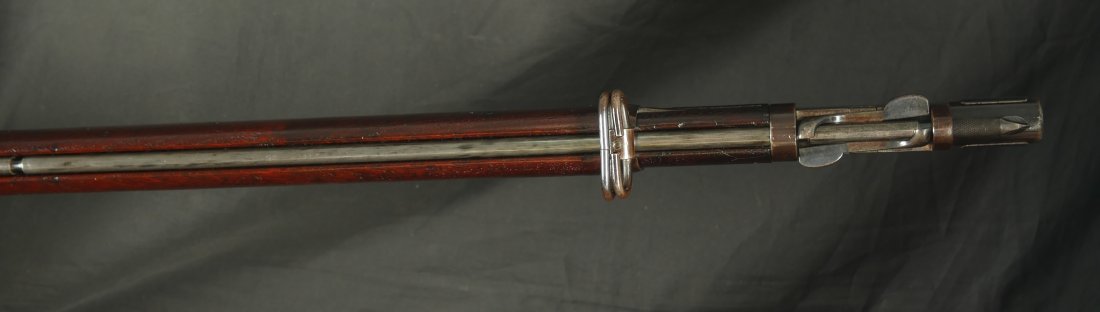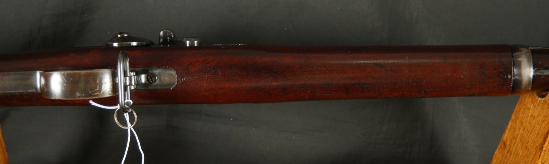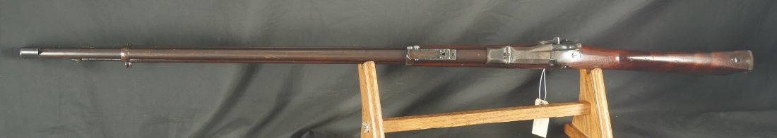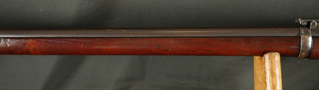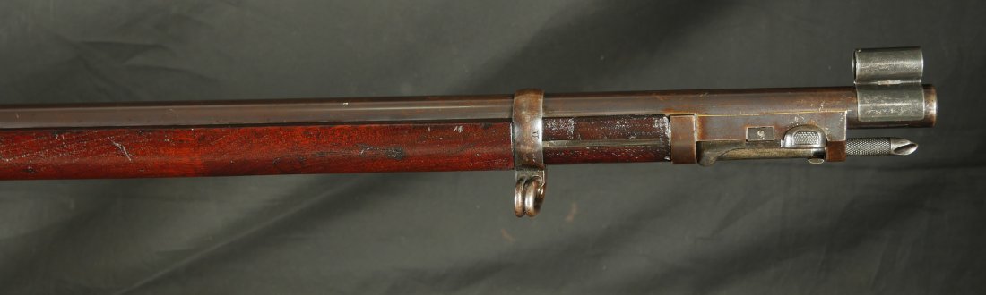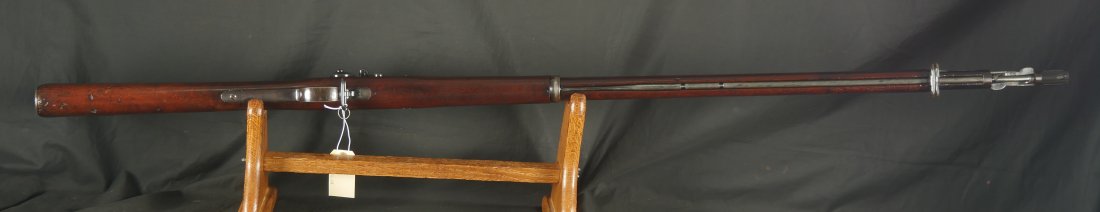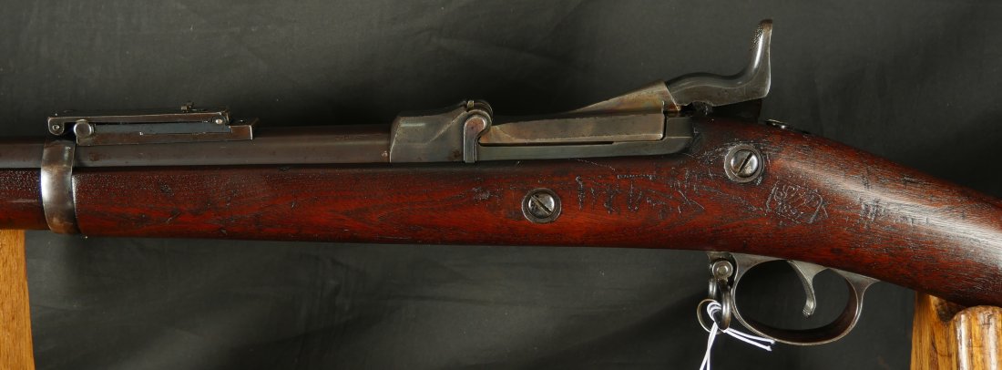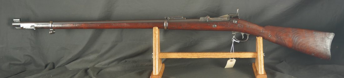 GR-1125-6723, Springfield Trap Door Model 1888. 45-70 cal. With ramrod bayonet, hooded front sight, Buffington rear sight. 80% deep smooth barrel blue fading to rich brown patina. Bands, sight, trigger-guard, lock and hammer show similar blue. The butt plate shows less blue and has a tool compartment. The breech block shows about 90% rich rainbow. The stock shows 1891 cartouche and light handling marks on the stock. The bore is excellent. The mechanics are crisp. Excellent plus overall. It is hard to offer any gun in this high condition, it is just hard to Antique Guns this nice.