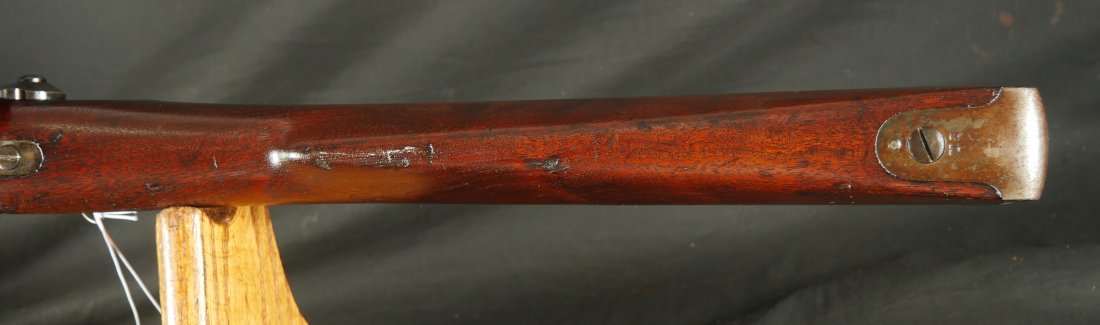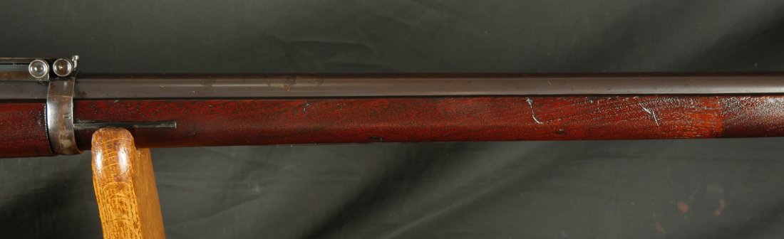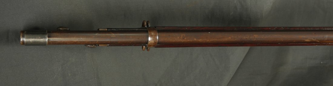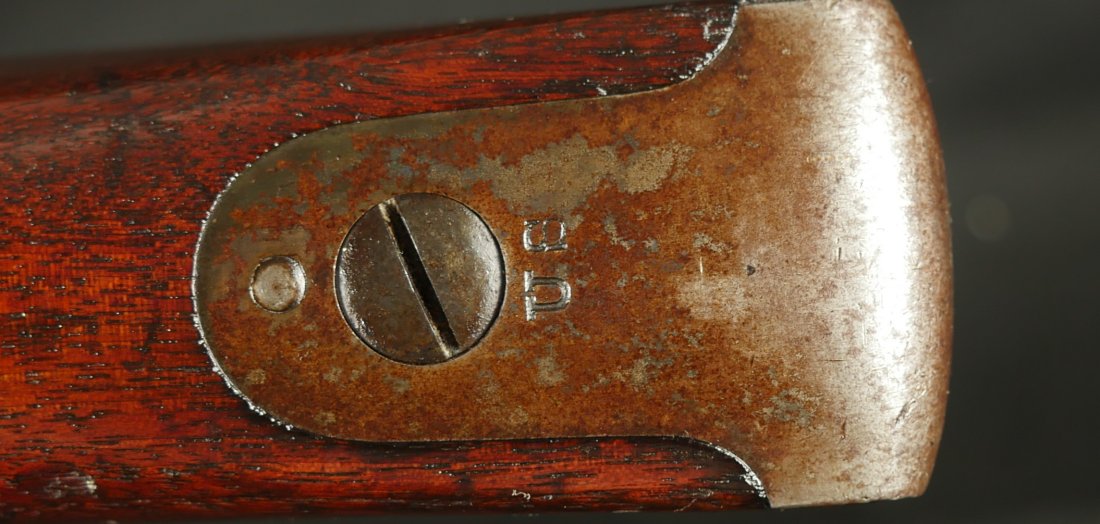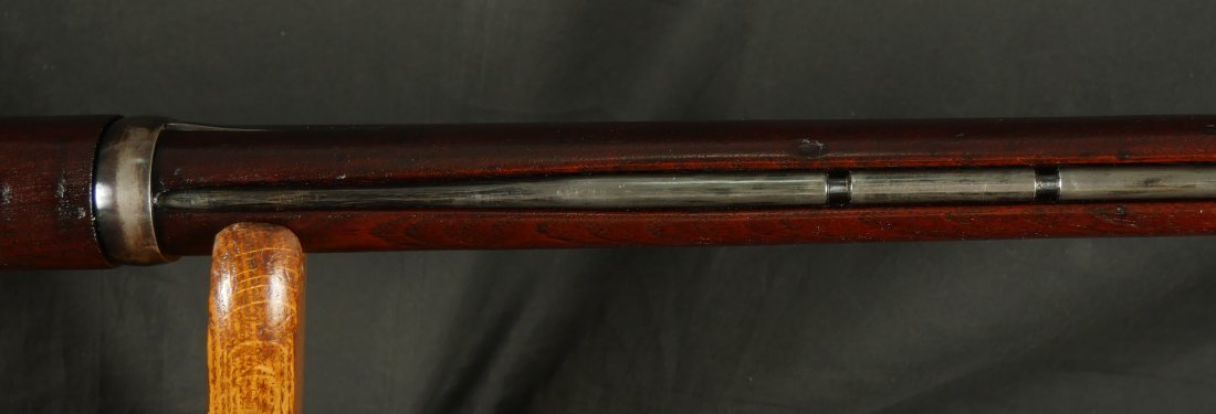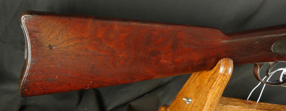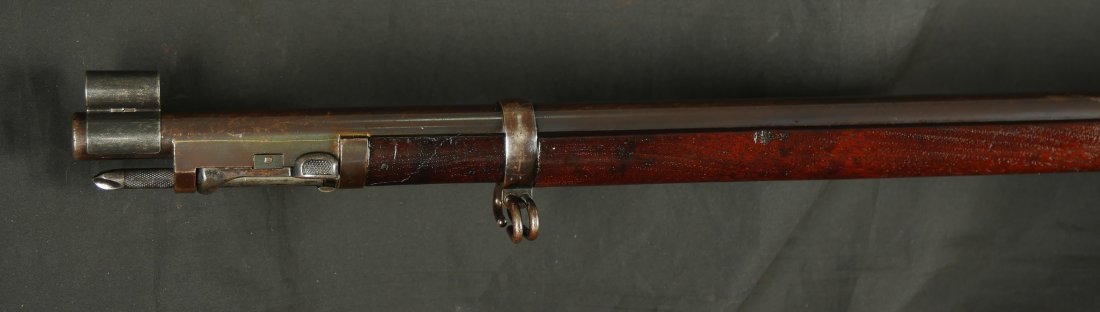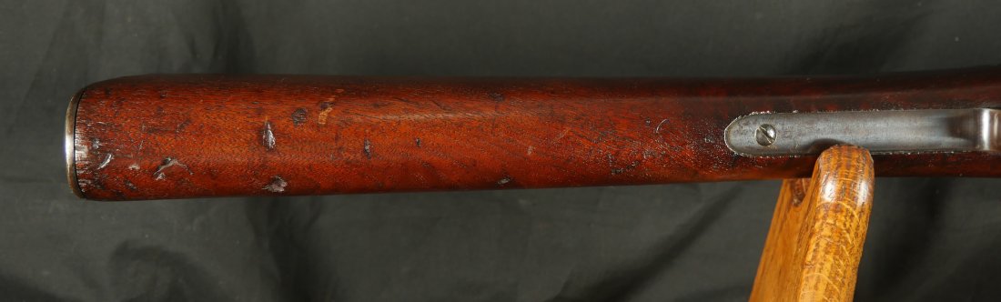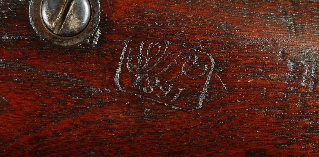 GR-1125-6723, Springfield Trap Door Model 1888. 45-70 cal. With ramrod bayonet, hooded front sight, Buffington rear sight. 80% deep smooth barrel blue fading to rich brown patina. Bands, sight, trigger-guard, lock and hammer show similar blue. The butt plate shows less blue and has a tool compartment. The breech block shows about 90% rich rainbow. The stock shows 1891 cartouche and light handling marks on the stock. The bore is excellent. The mechanics are crisp. Excellent plus overall. It is hard to offer any gun in this high condition, it is just hard to Antique Guns this nice.