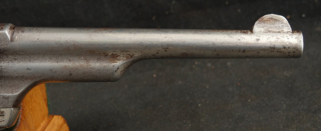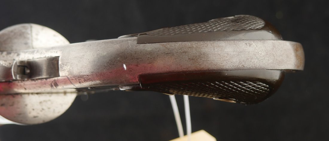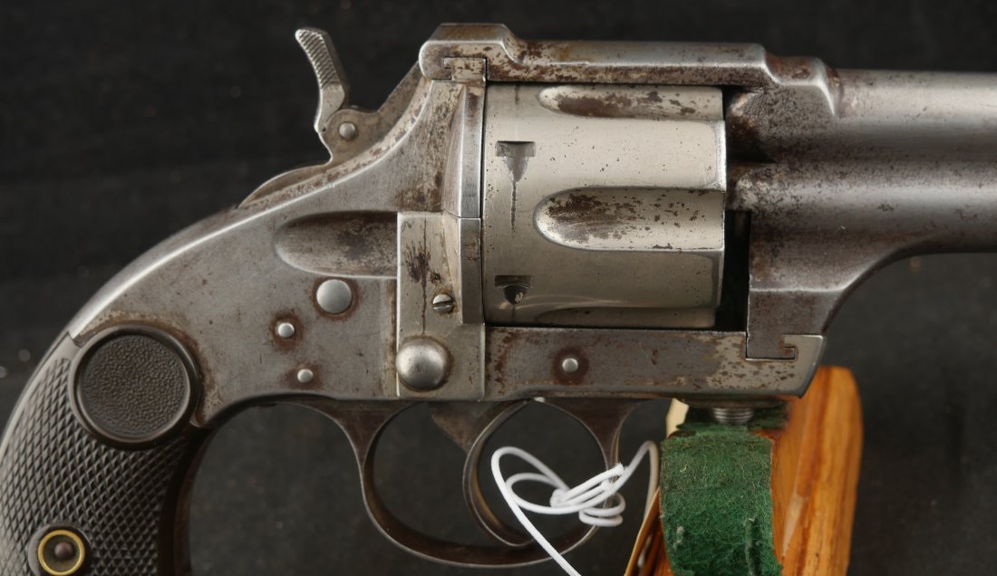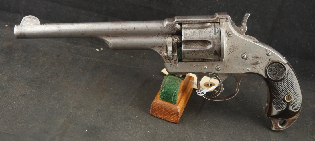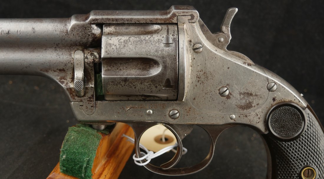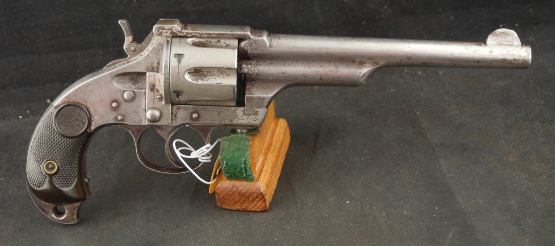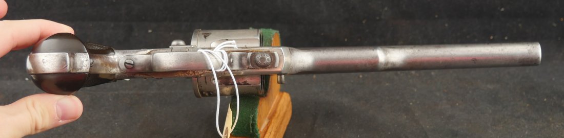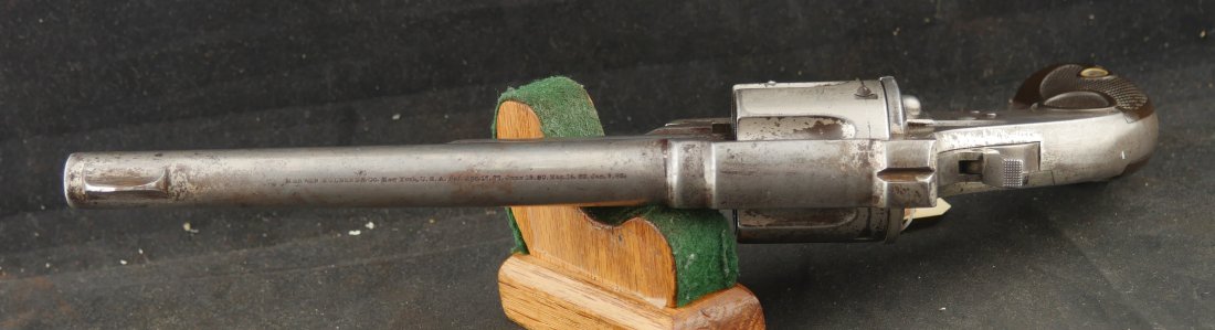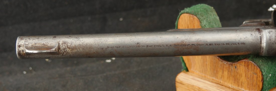 GR-1125-6725, Merwin & Hulbert Large Frame Double Action Revolver. 44-40 cal. 7 inch barrel. 6 shot. Ribbed barrel and bird’s head butt. Serial number 89XX matches on the frame, barrel and cylinder. The gun retains about 30% original nickel finish. Fine condition, original checker hard rubber grips. The gun shows evidence of honest use and years of carry wear. The mechanics are crisp and tight in both DA and SA. The bore is bright, shiny, and crisply rifled with a few fine scattered spots. Very good + bore. Suction in the action is good. This is a nice old used Cowboy gun. Very good overall.